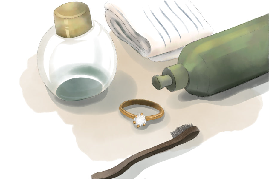 Når du skal rense dit diamantsmykke, er den mest skånsomme metode at benytte en blød tandbørste, en blød klud og parfumefri sæbe.