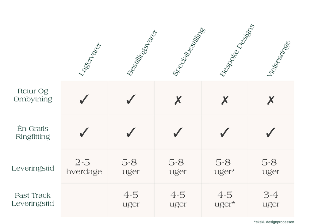 I skemaet nedenfor får du et nemt overblik over fremstillingstid og vilkår for dit diamantsmykke.