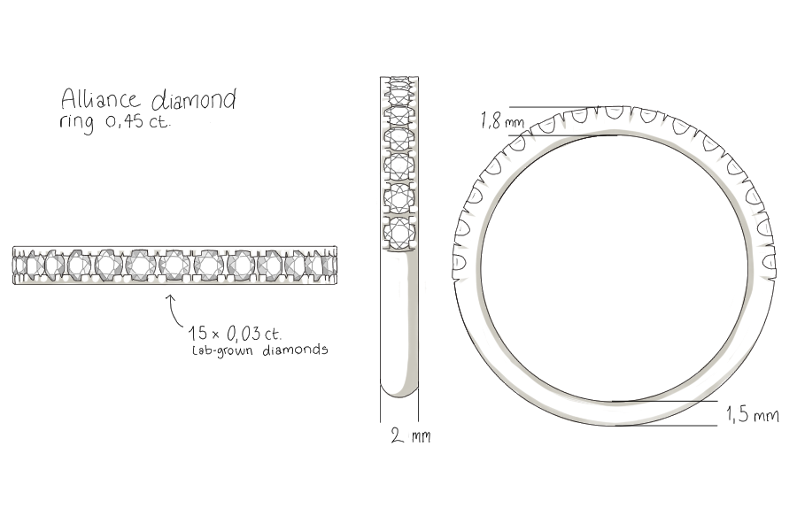 Alliancering med en lang række af lab-grown diamanter (i alt 0,45 ct.) ned langs den øvre halvdel af ringskinnen. Ringen er et klassisk og tidløst smykke, der er let og sikkert at bære - også i en aktiv hverdag.