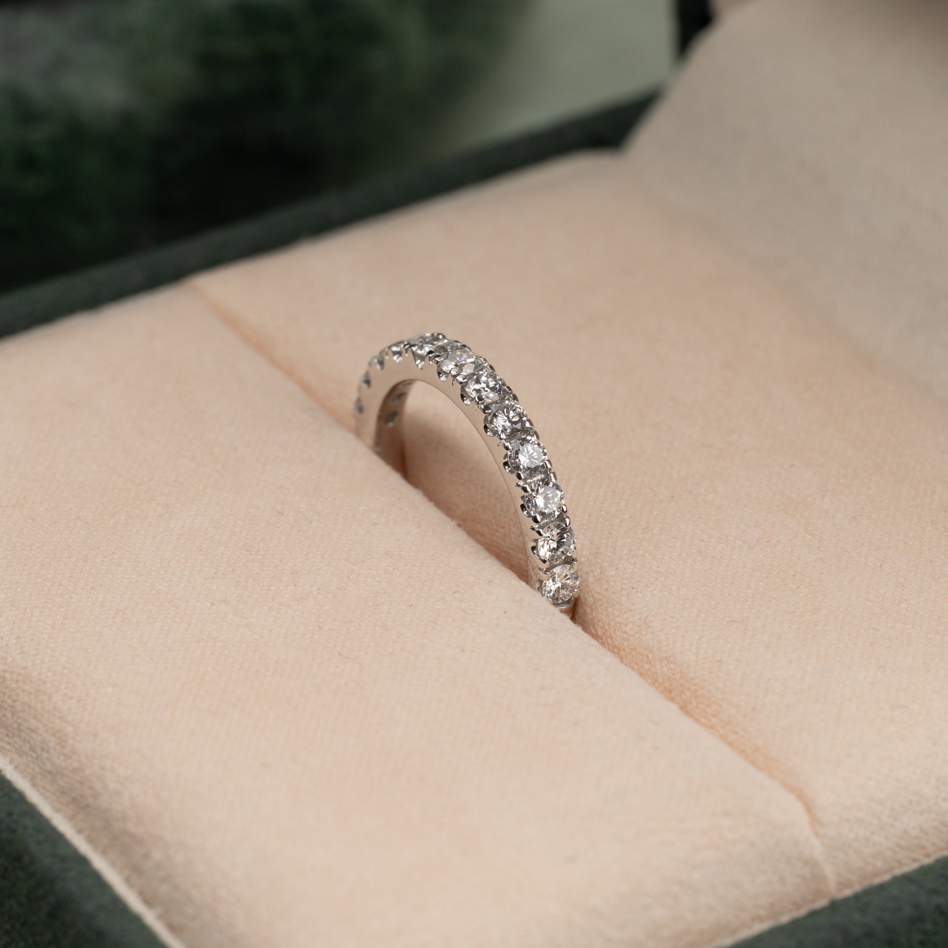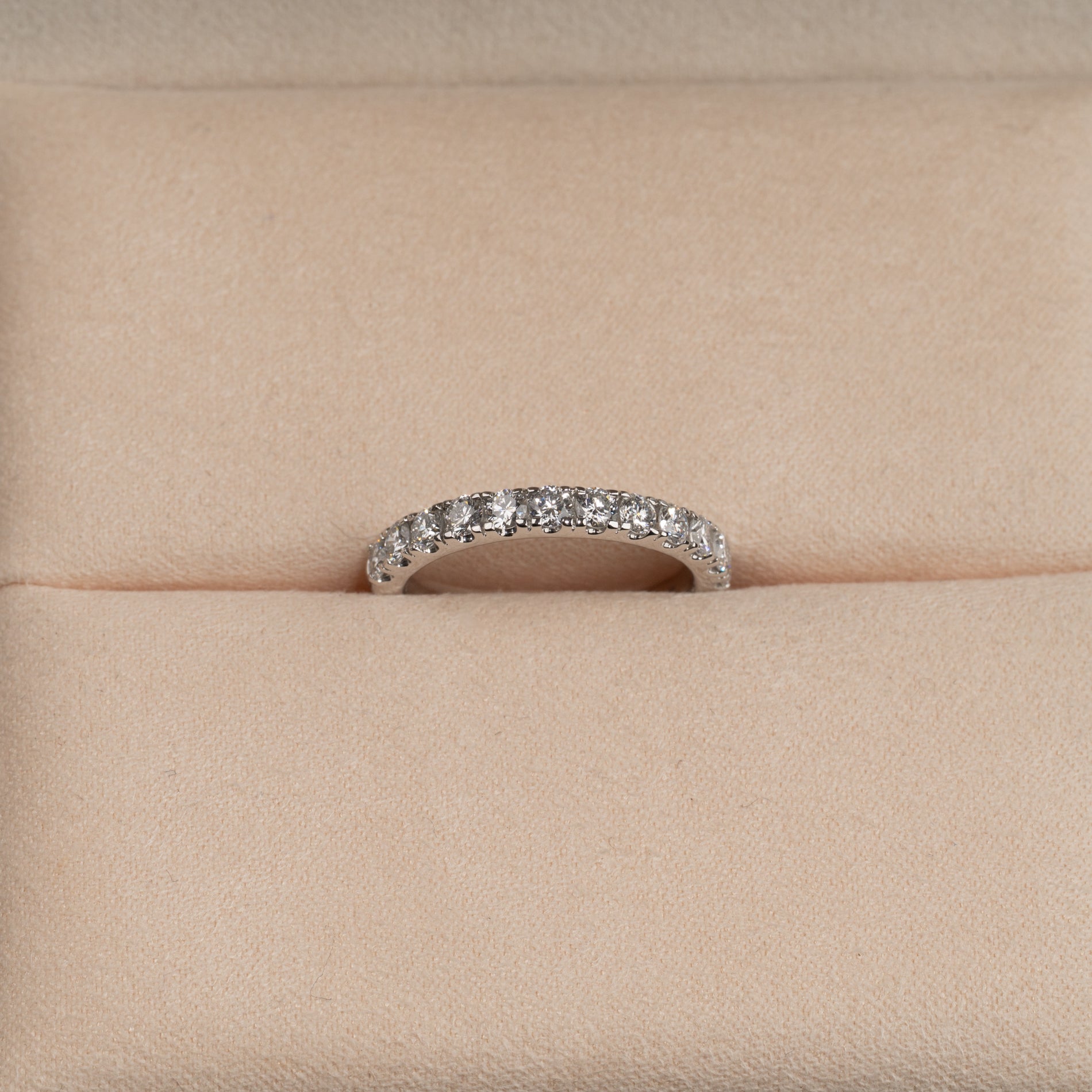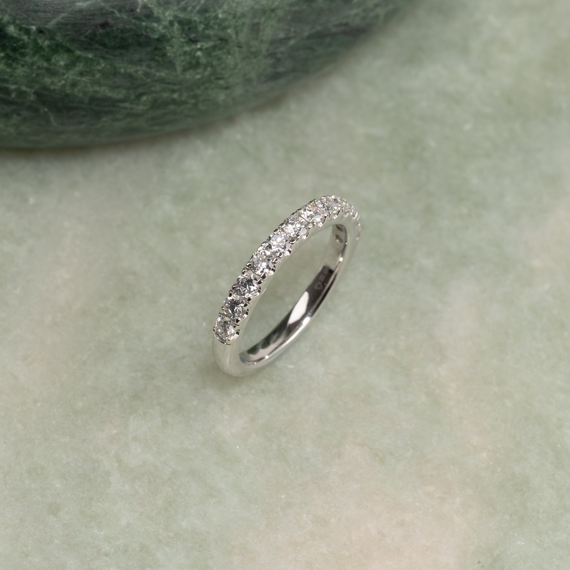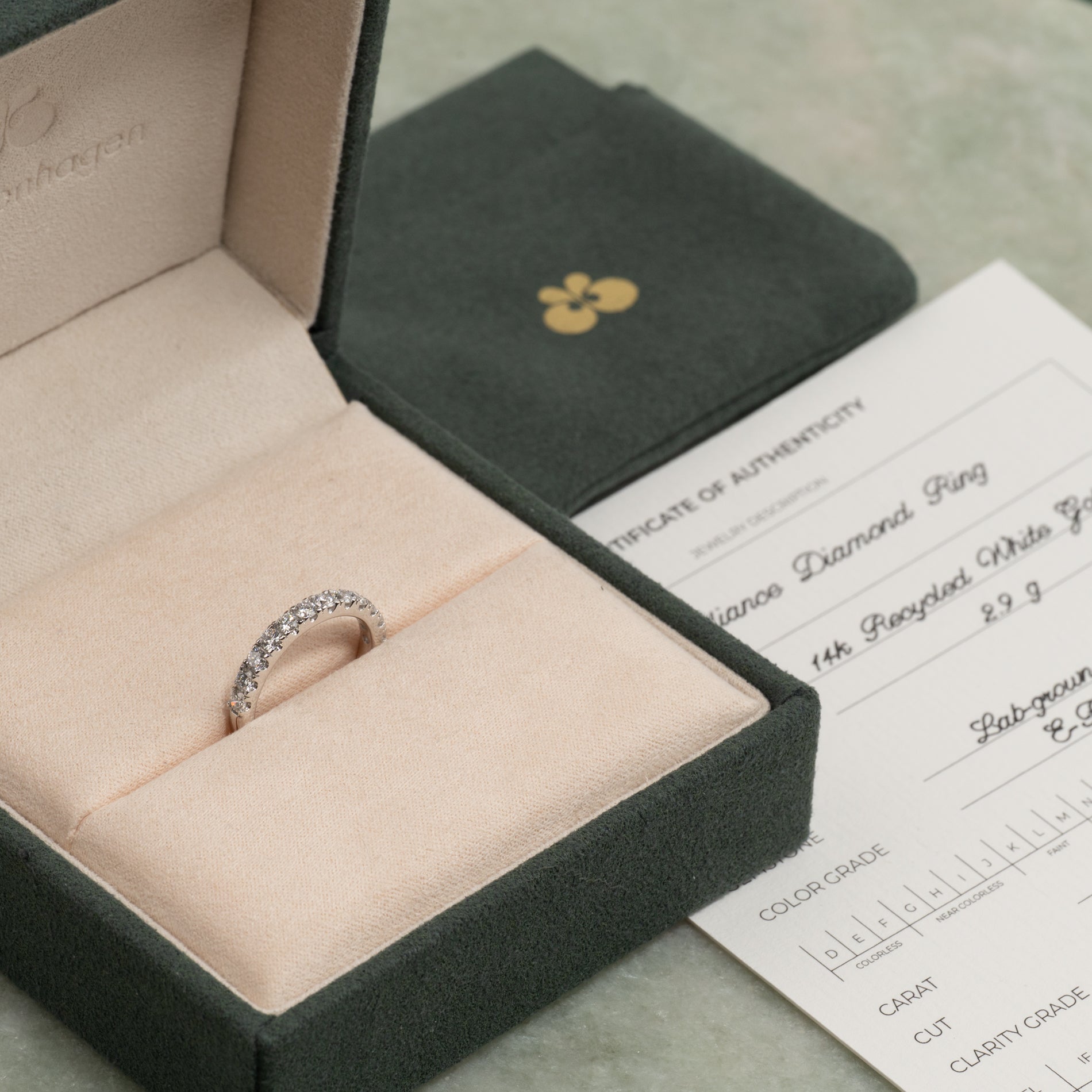 Diamanterne har farven E/F (River) og klarheden VVS. Selve ringskinnen har en bredde på 2,5 mm. Smykket er skabt med omtanke; diamanterne er fremstillet med blandt andet solenergi, og guldet er 100% certificeret genanvendt.