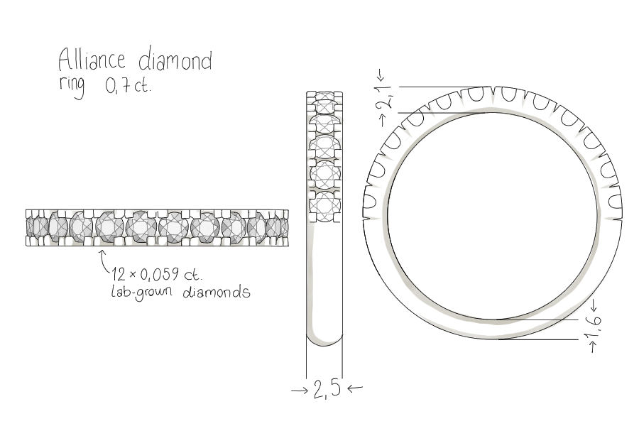 Allianceringen er skabt i 14 kt. massiv guld og 12 lab-grown diamanter på samlet 0,7 ct. ned langs den øvre halvdel af ringskinnen. Materialerne gør ringen let og sikker at bære - selv i en aktiv hverdag.