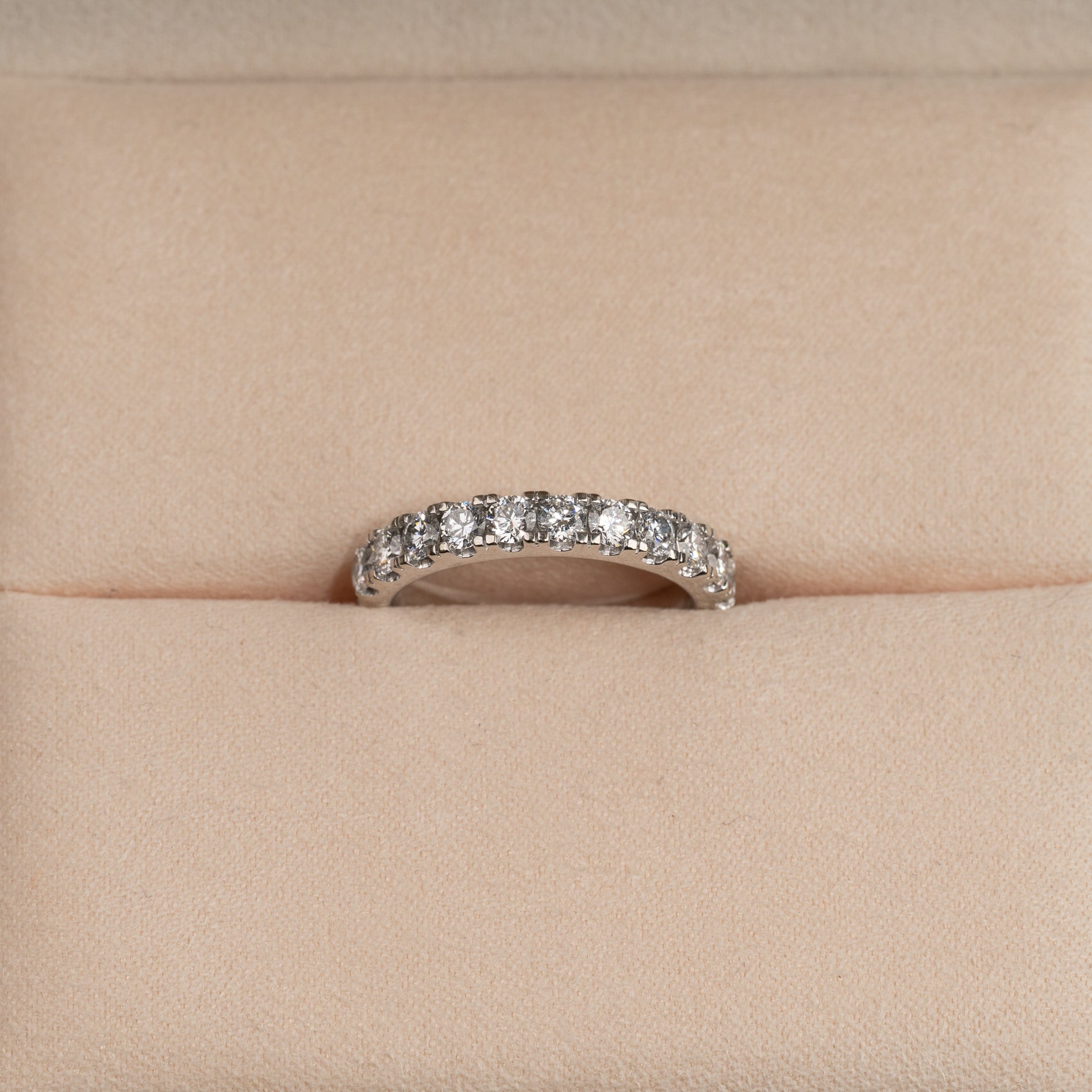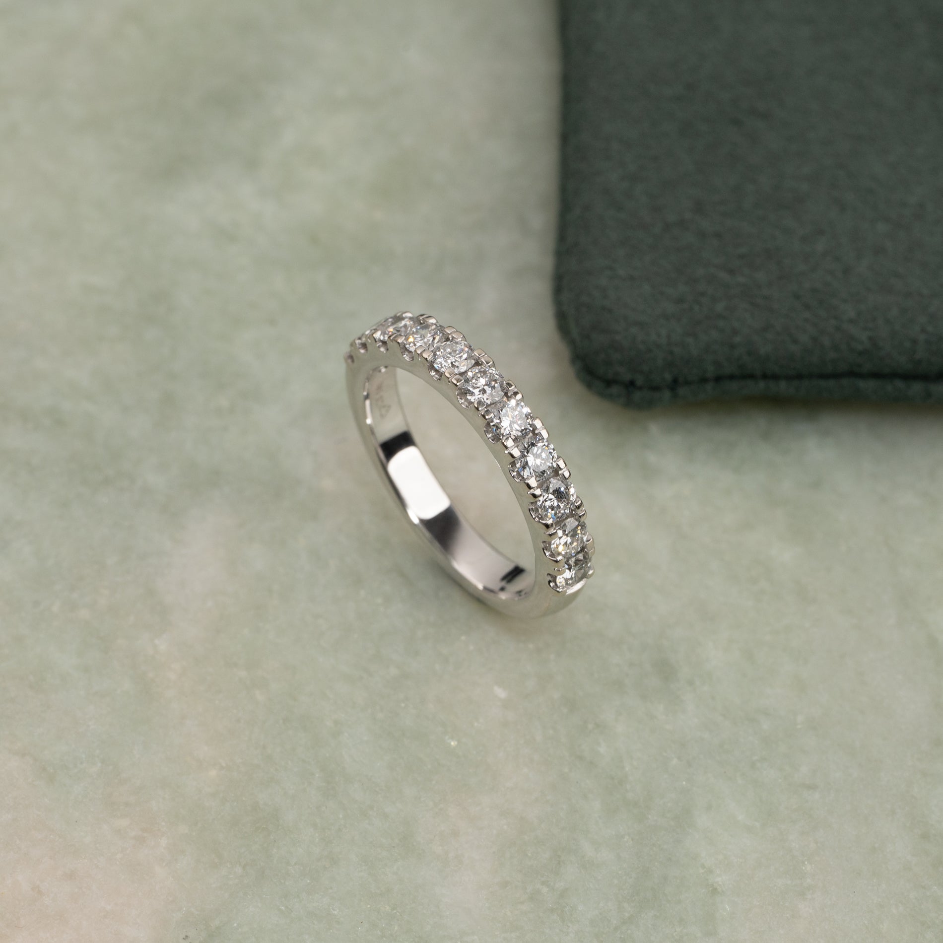Allianceringen er skabt i 14 kt. hvidguld og 11 lab-grown diamanter på samlet 1,0 ct. i den øvre halvdel af ringskinnen.