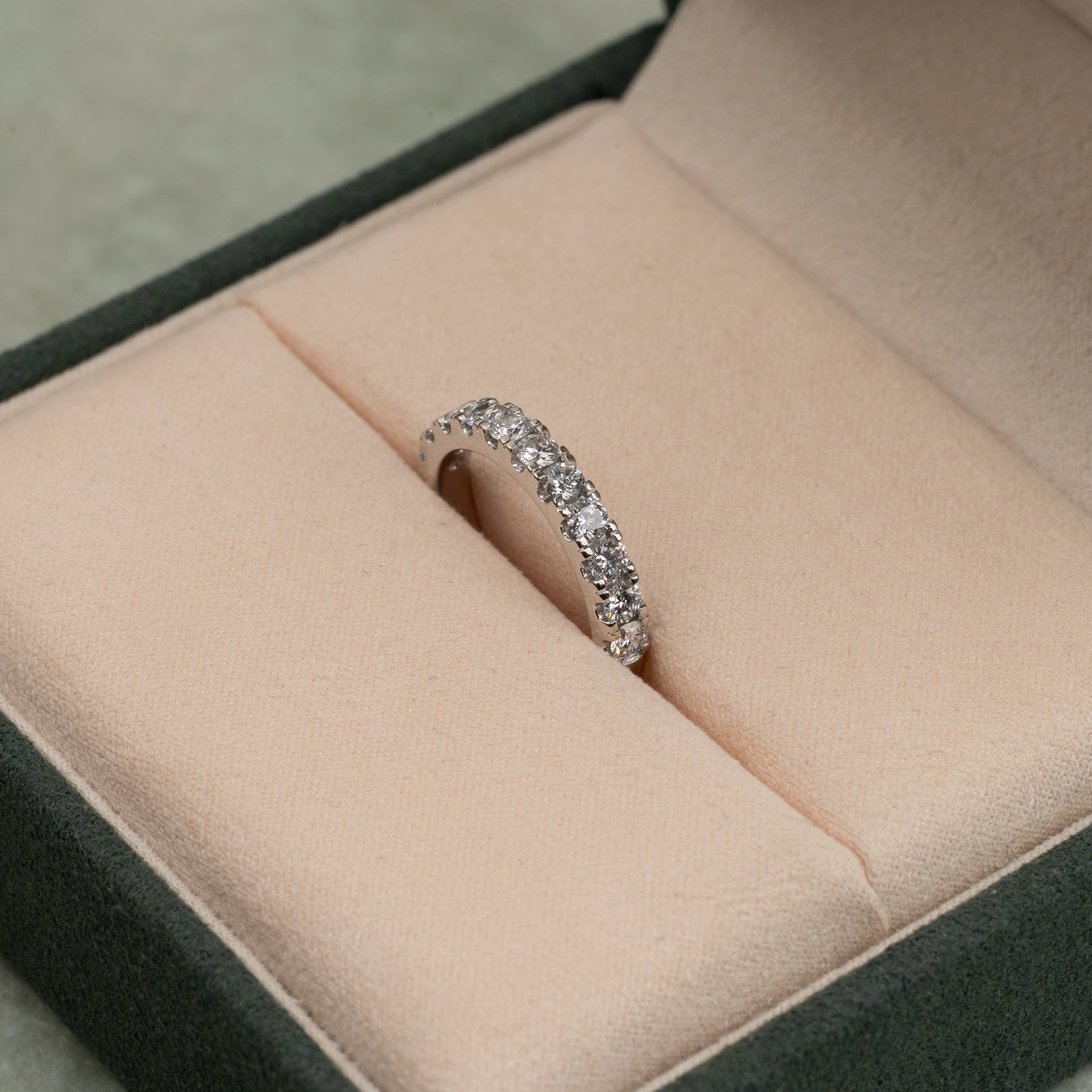 Diamanterne har farven E/F (River) og klarheden VVS. Selve ringskinnen har en bredde på 3,2 mm. Smykket er skabt med omtanke; diamanterne er fremstillet med blandt andet solenergi, og guldet er 100% certificeret genanvendt.