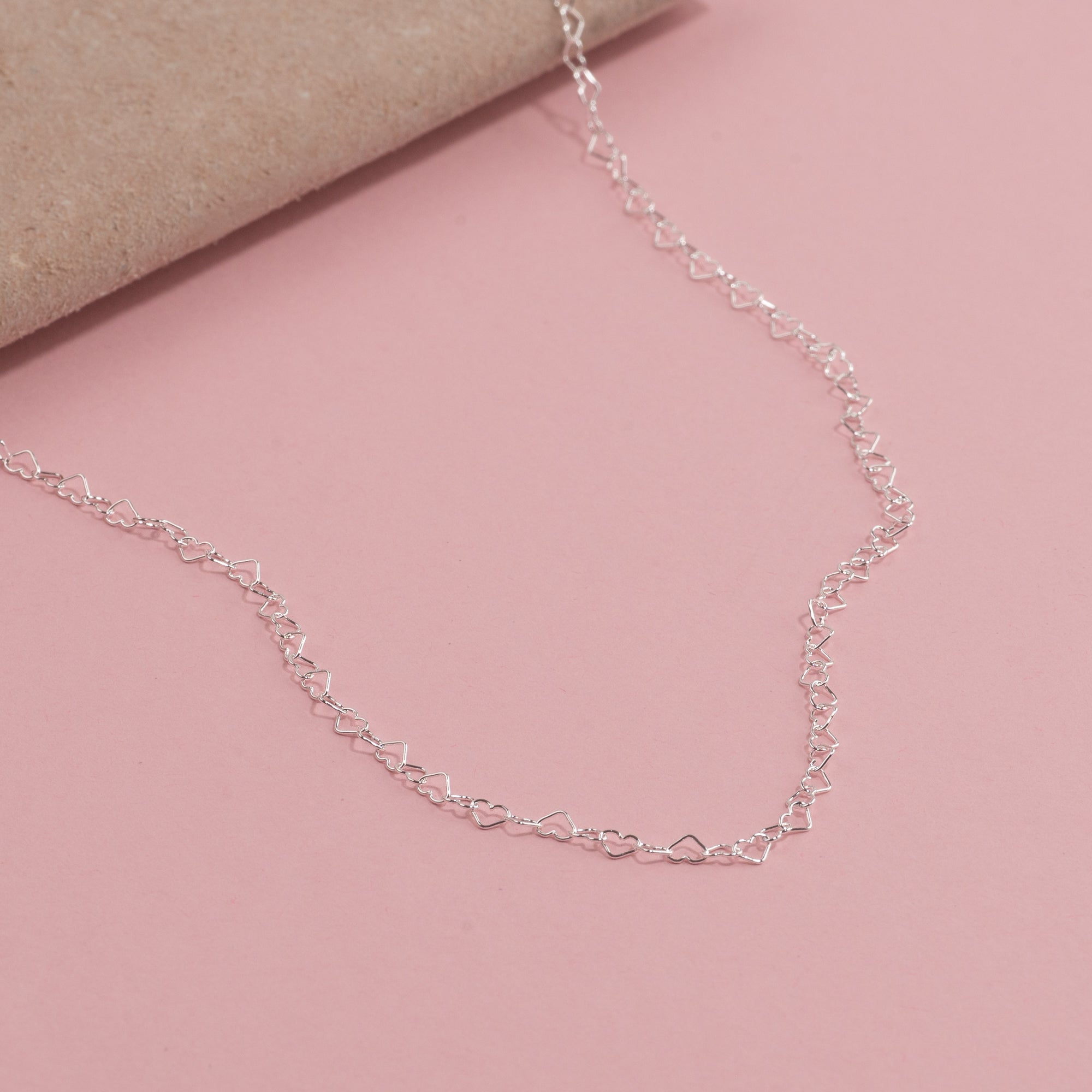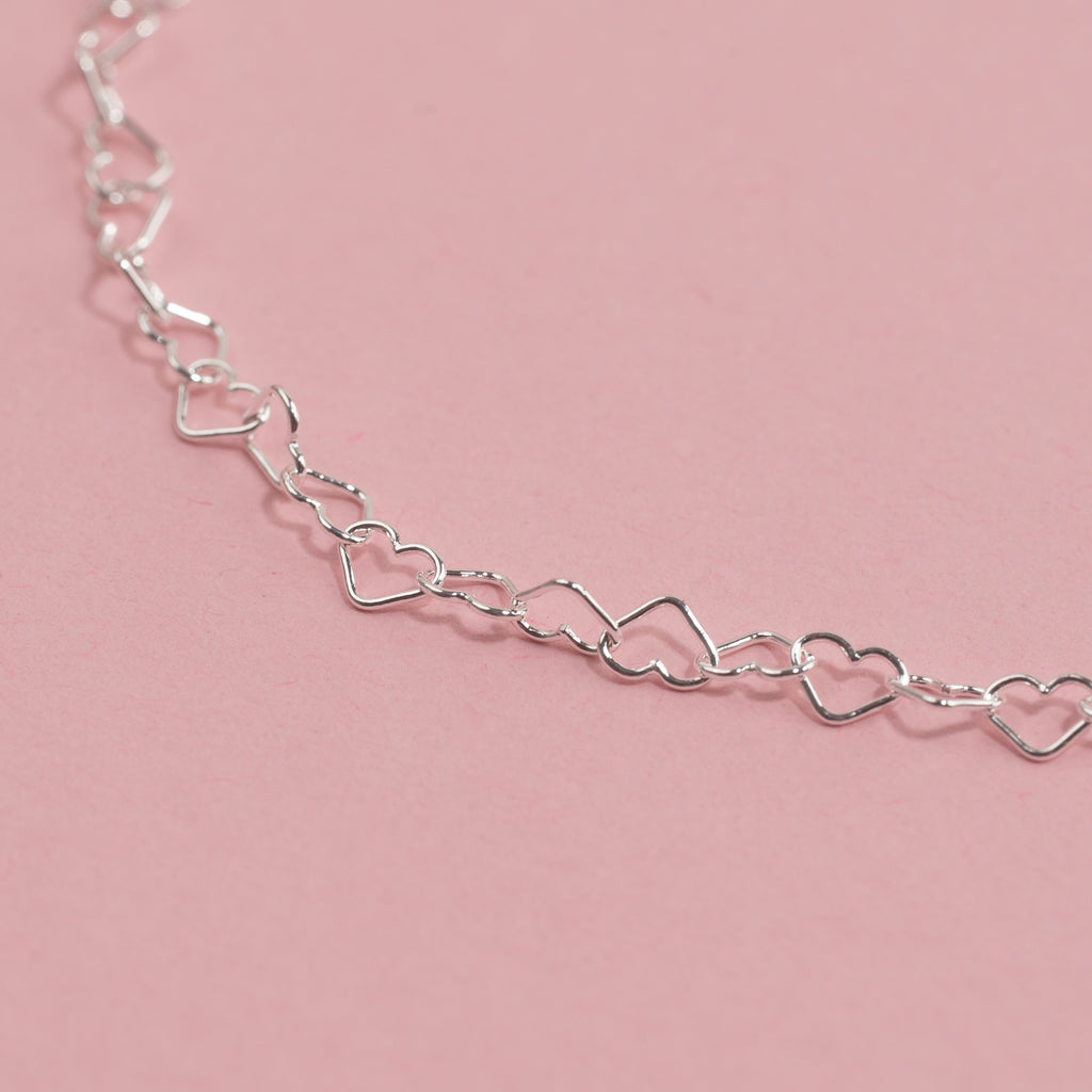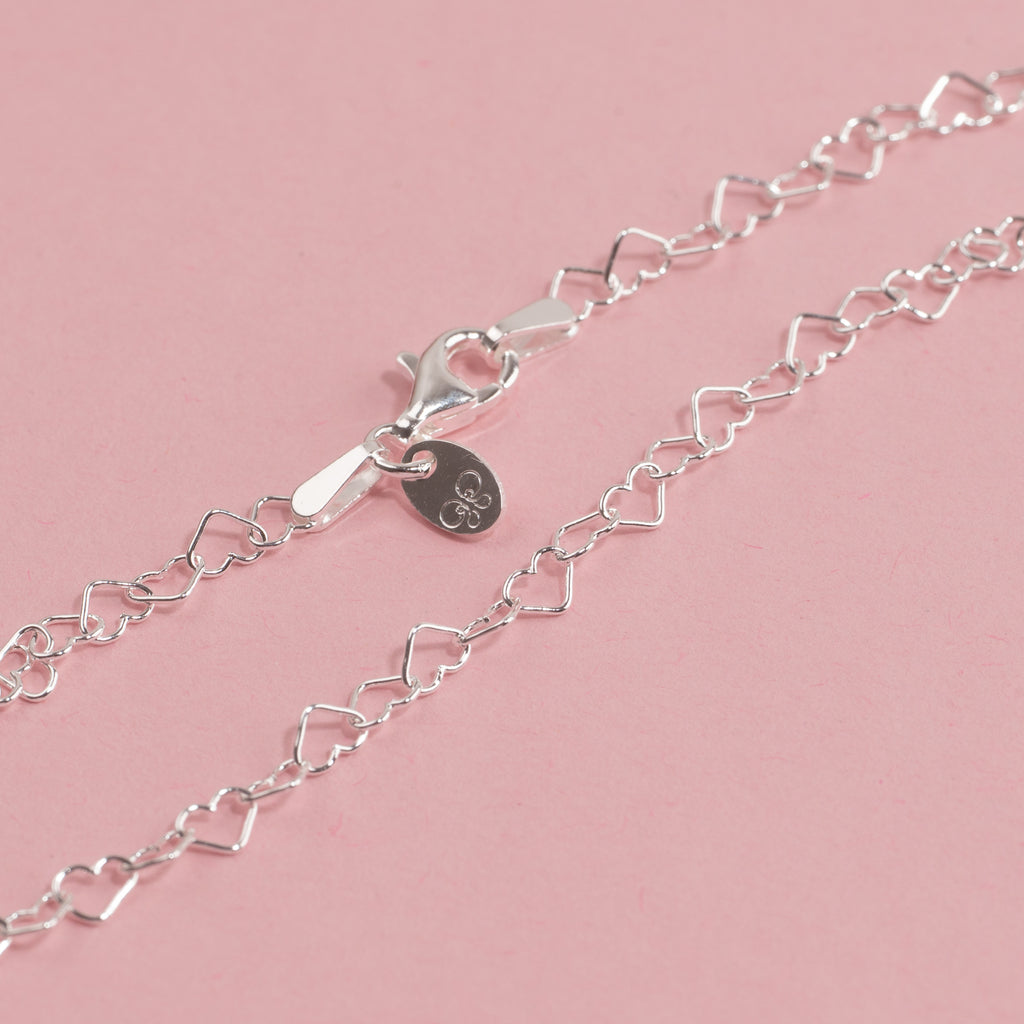 Den fine halskæde er lavet i 100% 925 sterlingsølv og består af kædeled formet som små åbne hjerter hele vejen rundt.