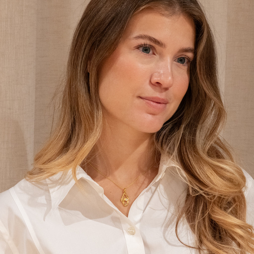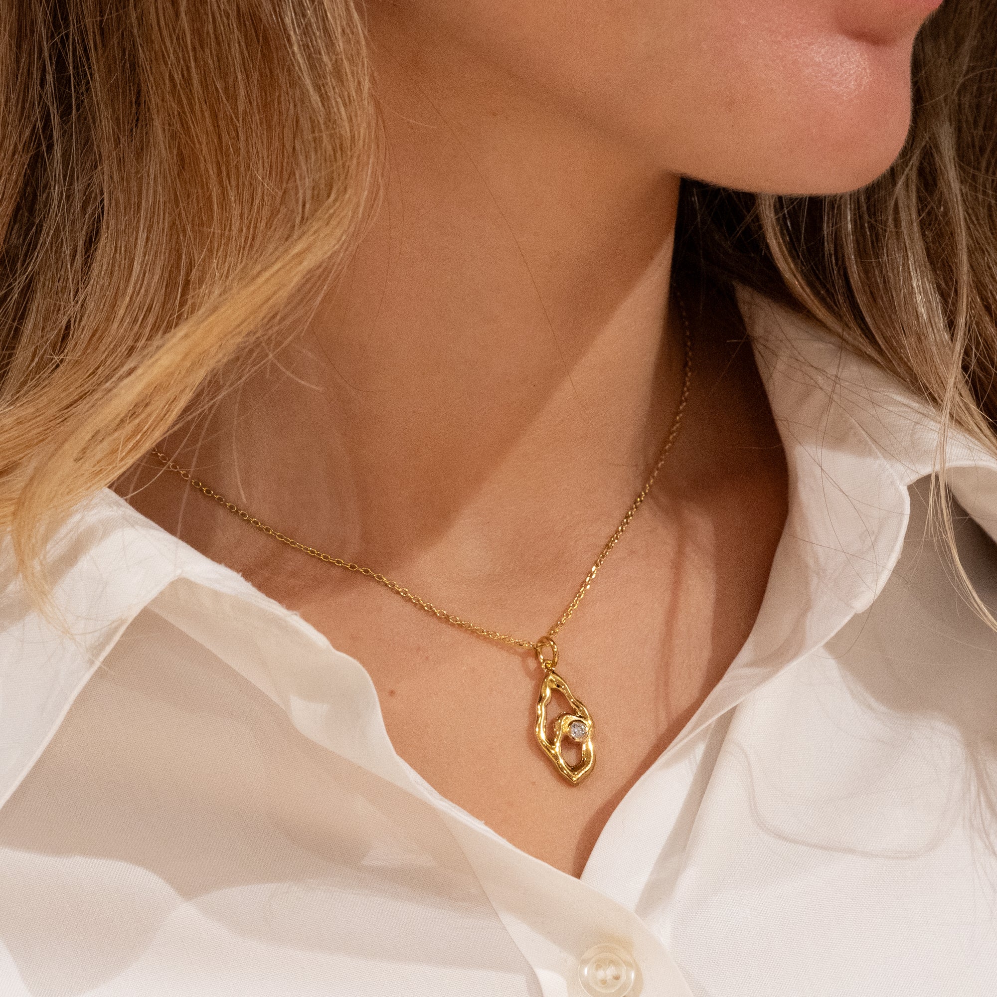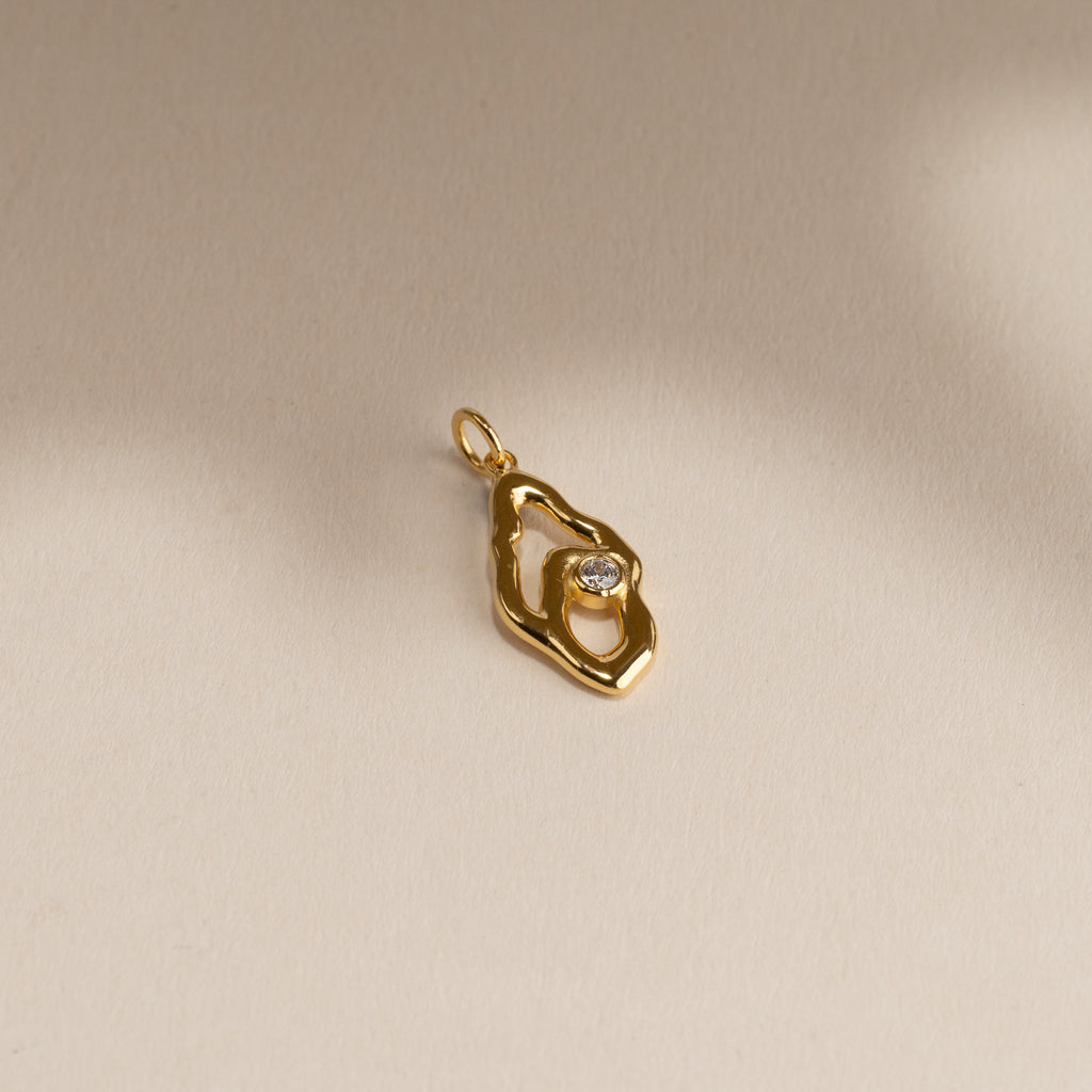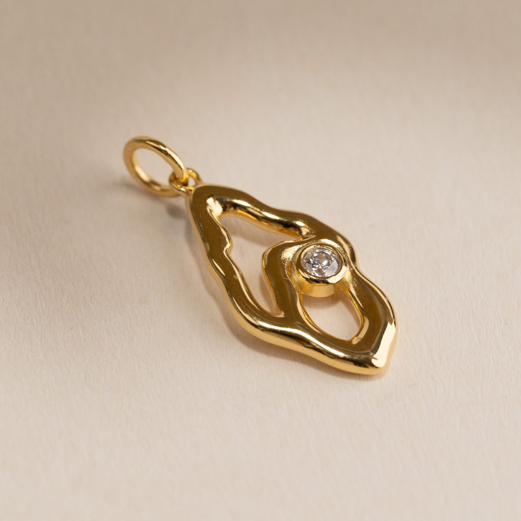 Vedhæng i 100% genanvendt 18 karat forgyldt sterlingsølv med en klar zirkon i et organisk design. De bløde former giver vedhænget et feminint og harmonisk udtryk, der gør det både unikt og iøjnefaldende.