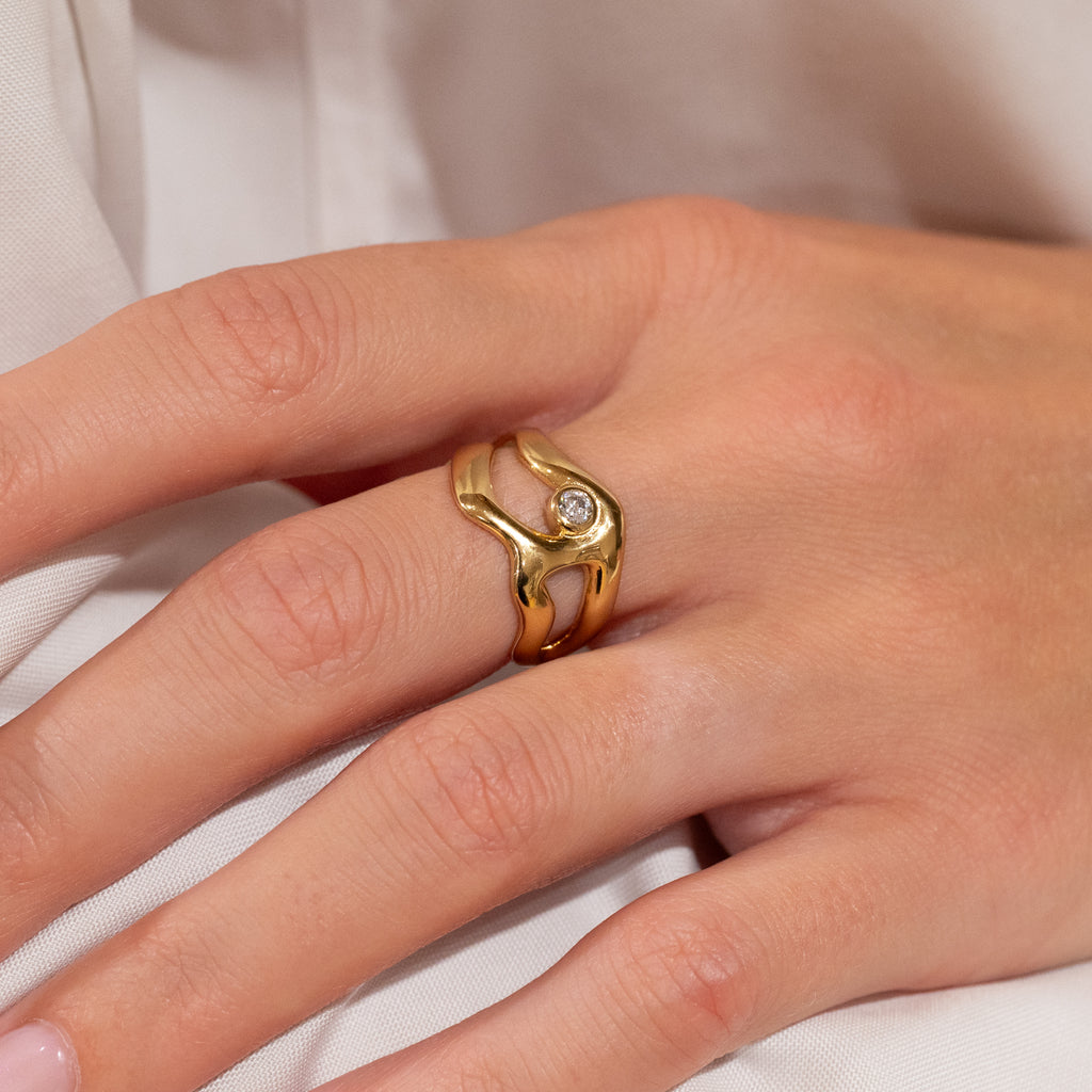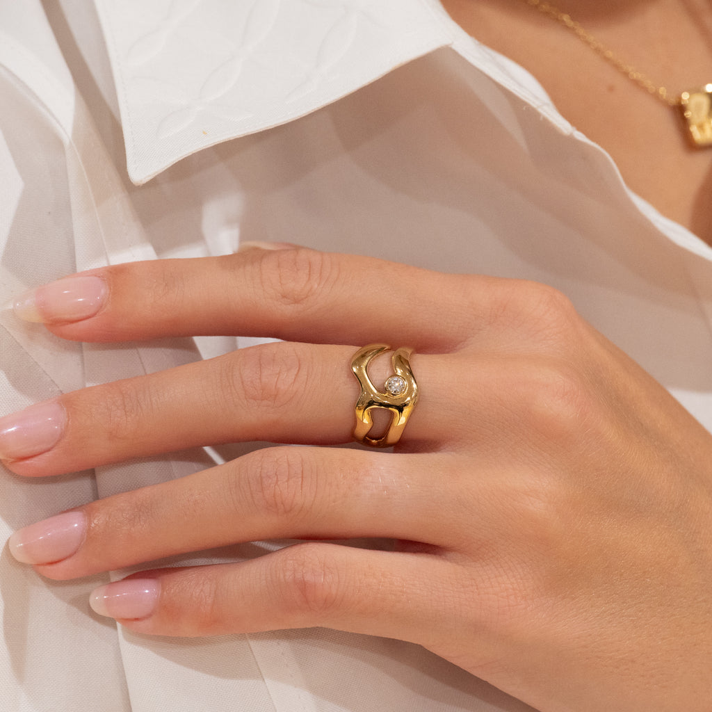 Ring i 100% genanvendt 18 karat forgyldt sterlingsølv med en klar zirkon i et organisk design. De bløde former giver ringen et feminint og unikt udtryk, der gør den både elegant og iøjnefaldende.