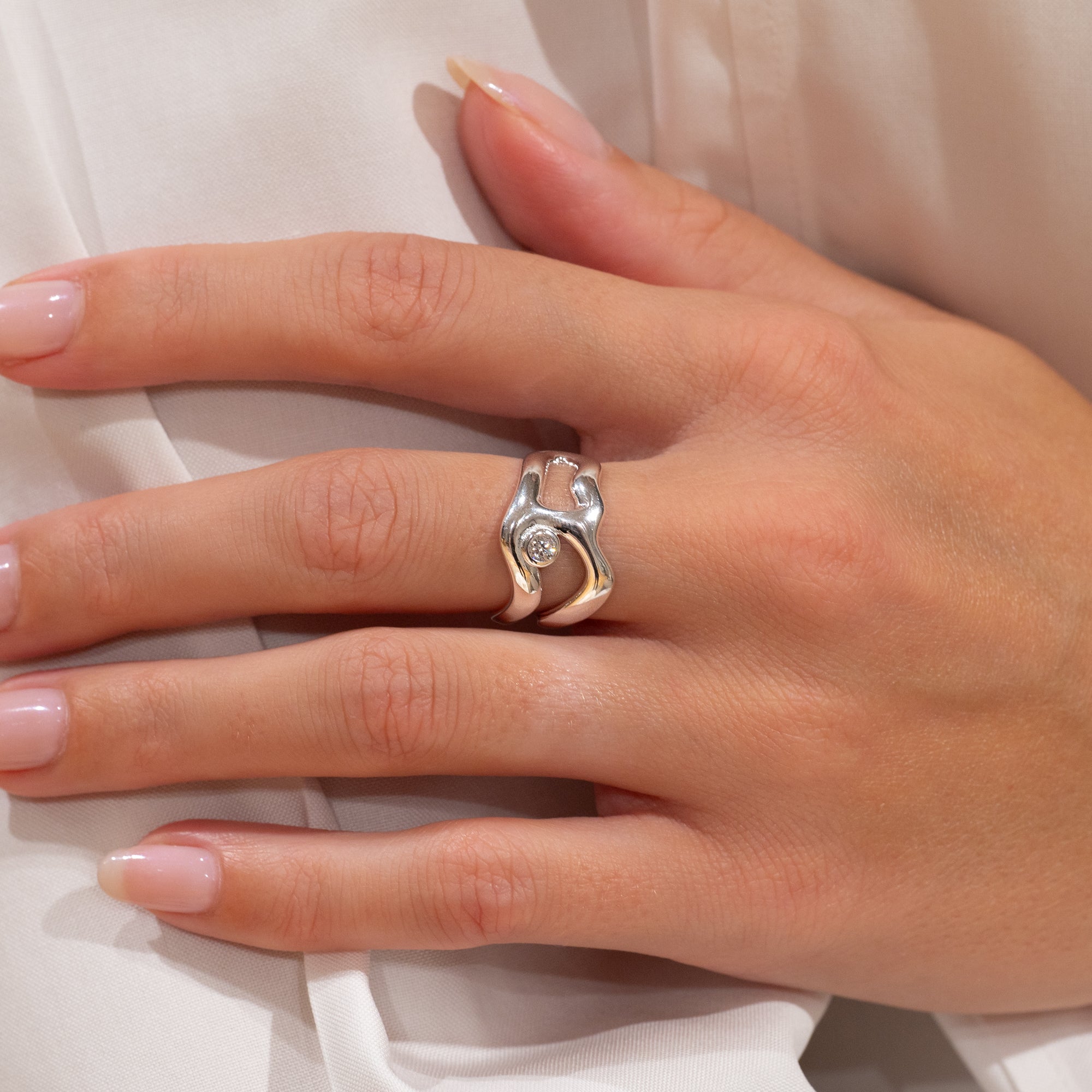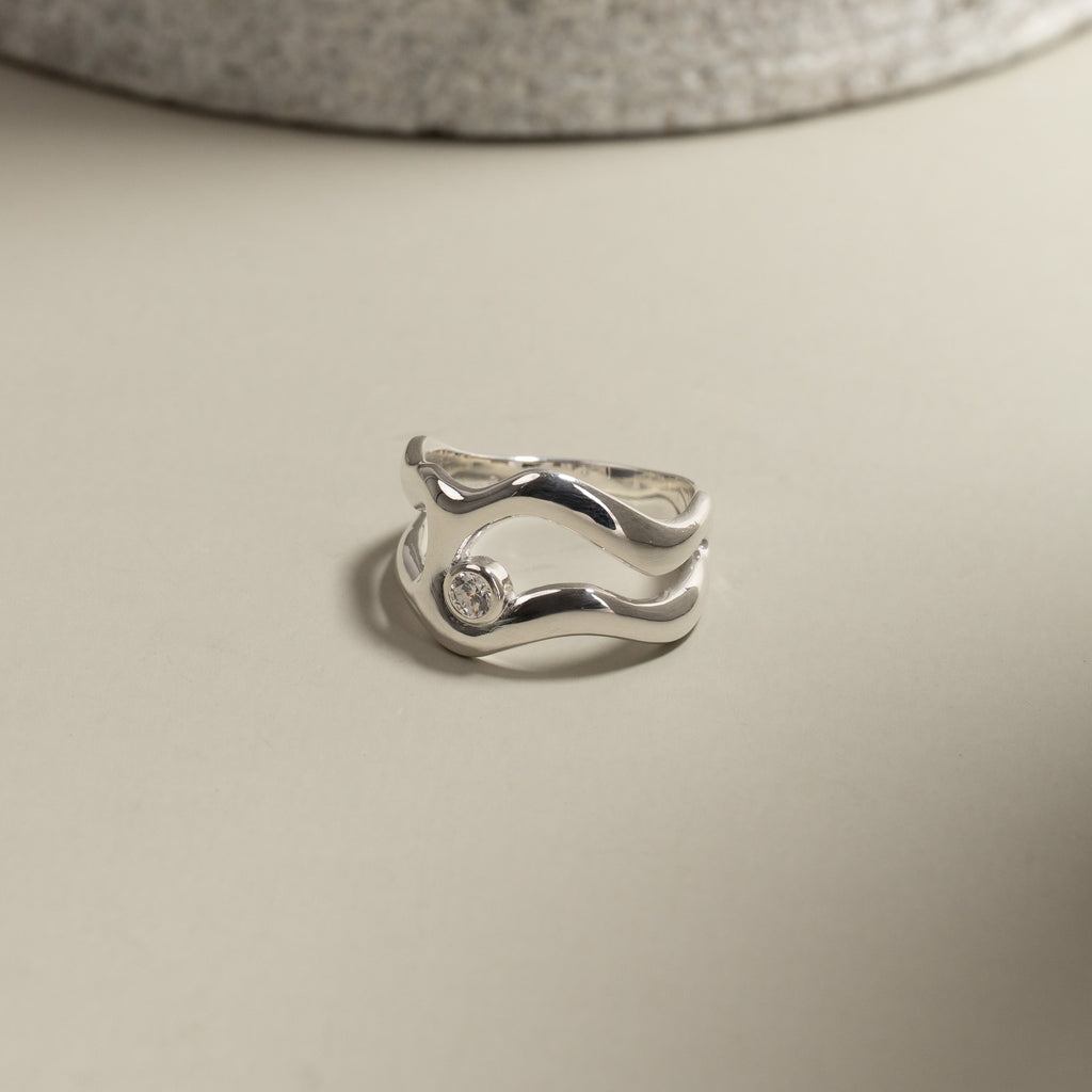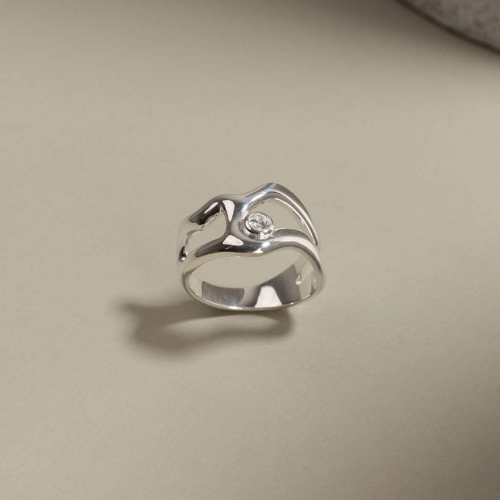 Ring i 100% genanvendt 925 sterlingsølv med en klar zirkon i et organisk design. De bløde former giver ringen et feminint og unikt udtryk, der gør den både elegant og iøjnefaldende.