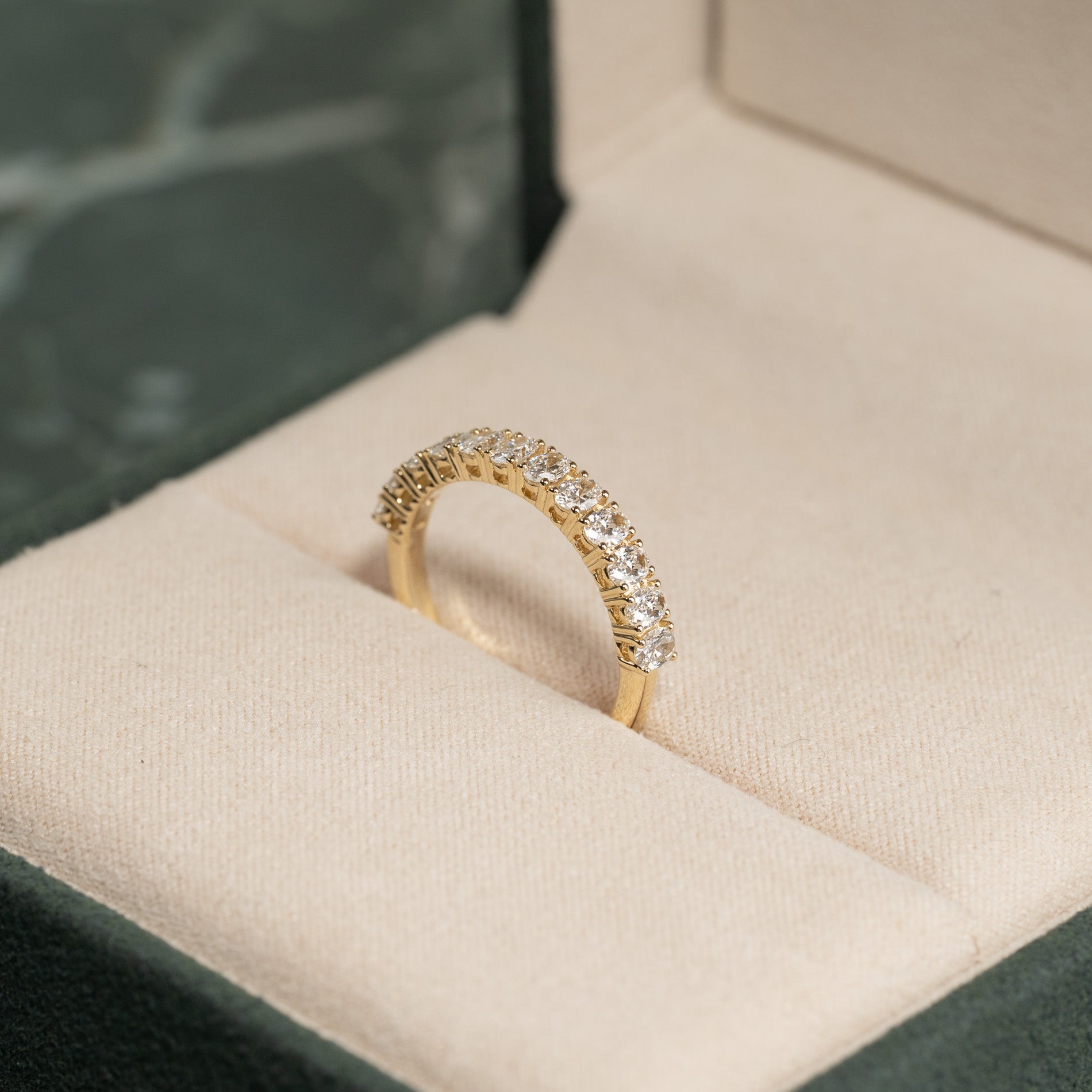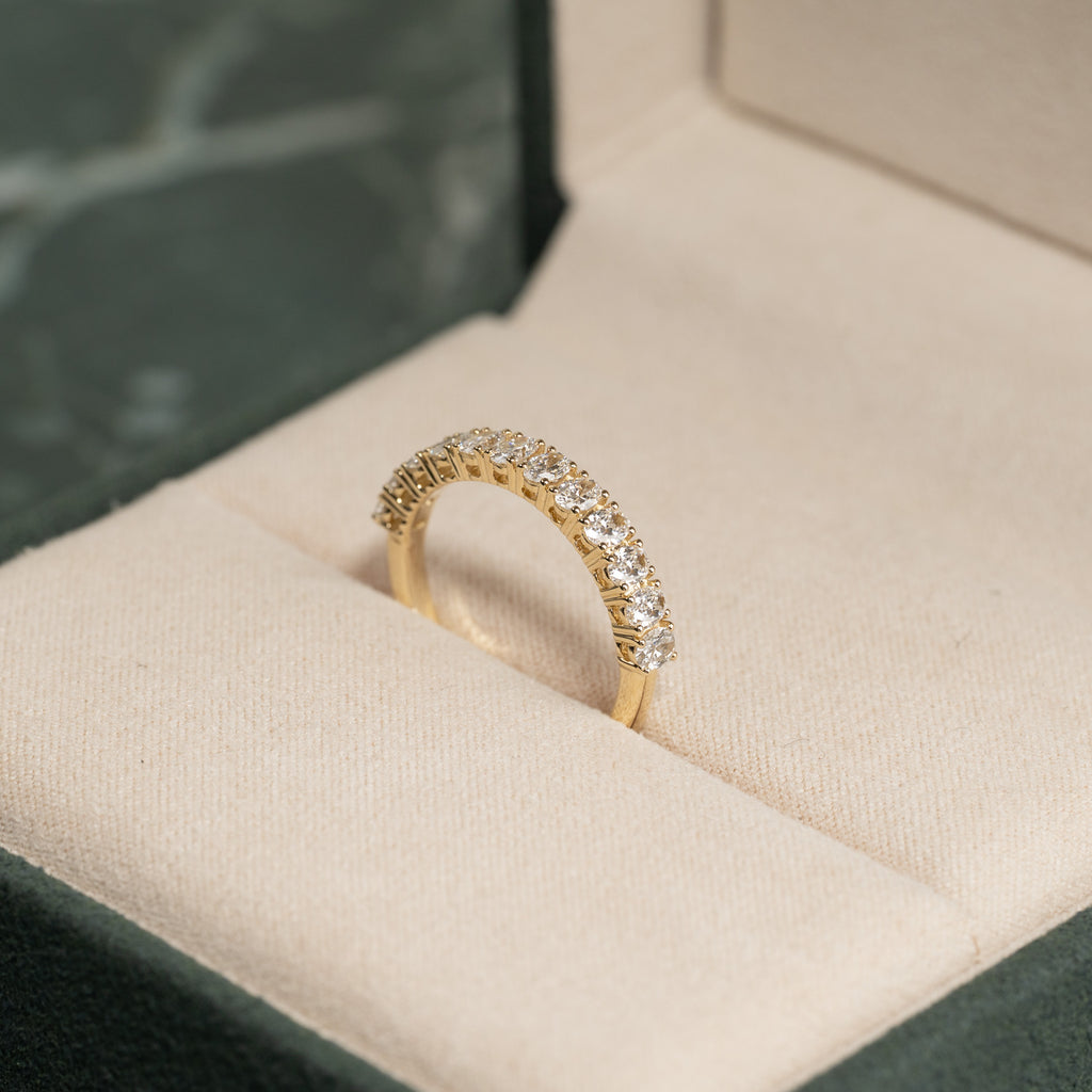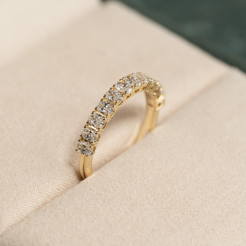 Allianceringen er skabt i 14 kt. massiv guld og 12 ovale lab-grown diamanter på samlet 1,0 ct. ned langs den øvre halvdel af ringskinnen.