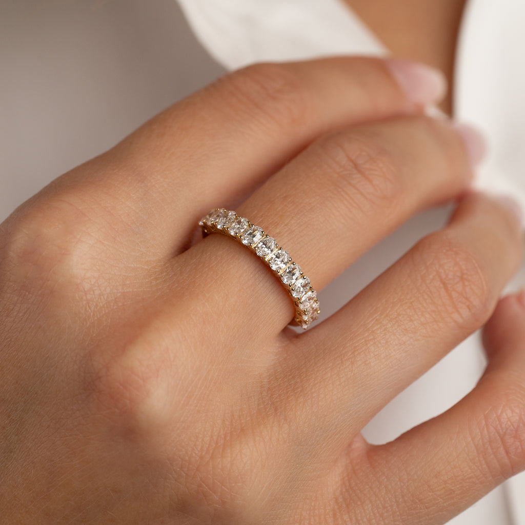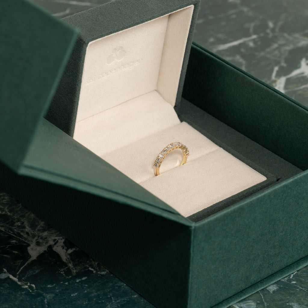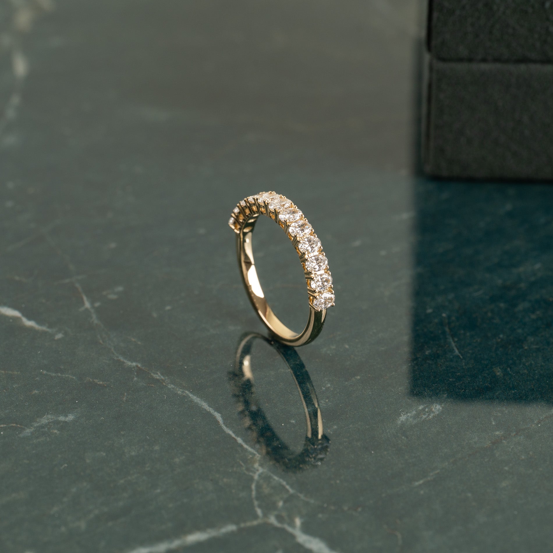 Allianceringen er skabt i 14 kt. massiv guld og 12 ovale lab-grown diamanter på samlet 1,0 ct. ned langs den øvre halvdel af ringskinnen.