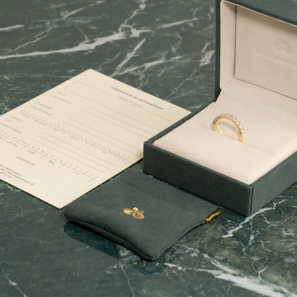 Diamanterne har farven E/F (River) og klarheden VVS. Smykket er skabt med omtanke; diamanterne er produceret med blandt andet solenergi, og guldet er 100% certificeret genanvendt.