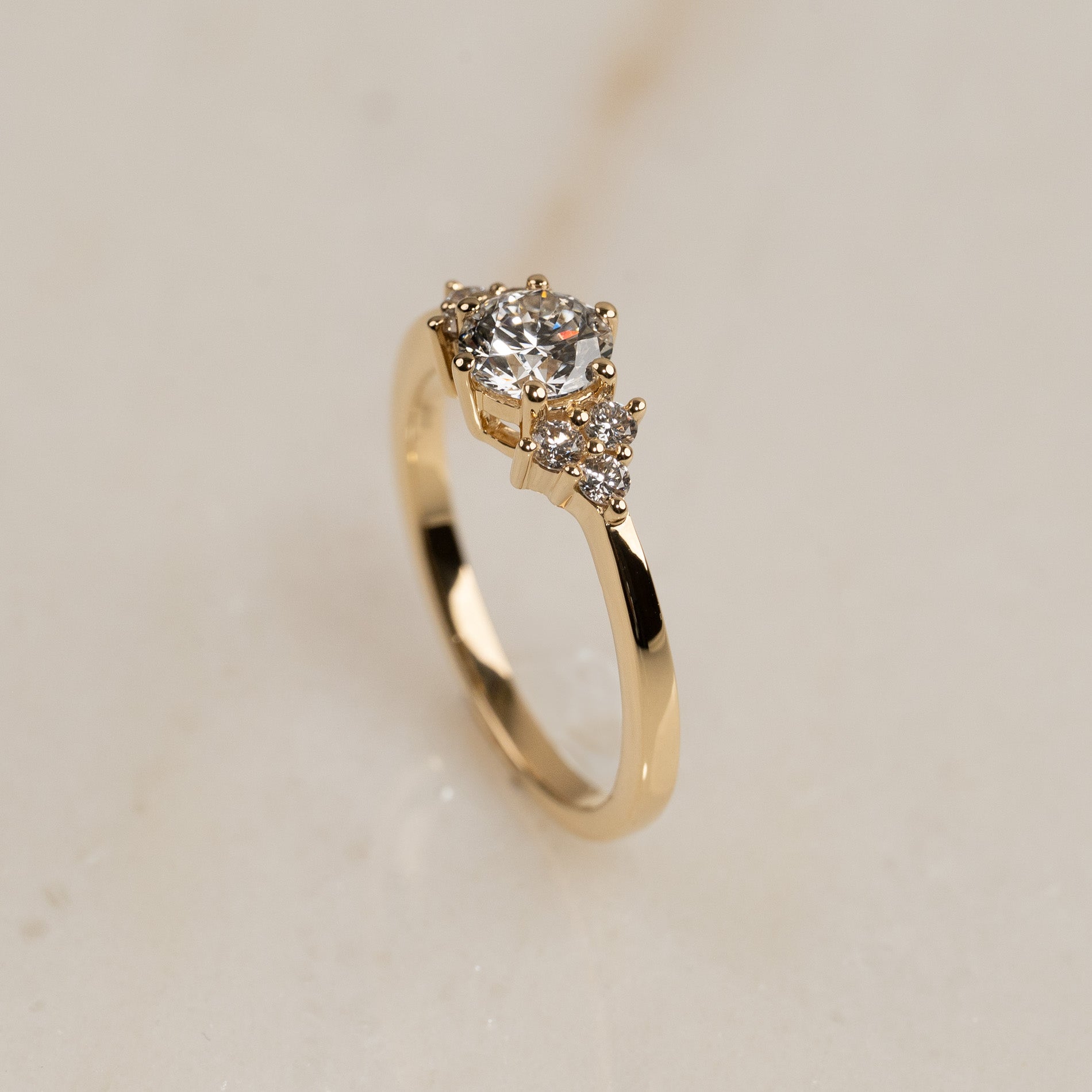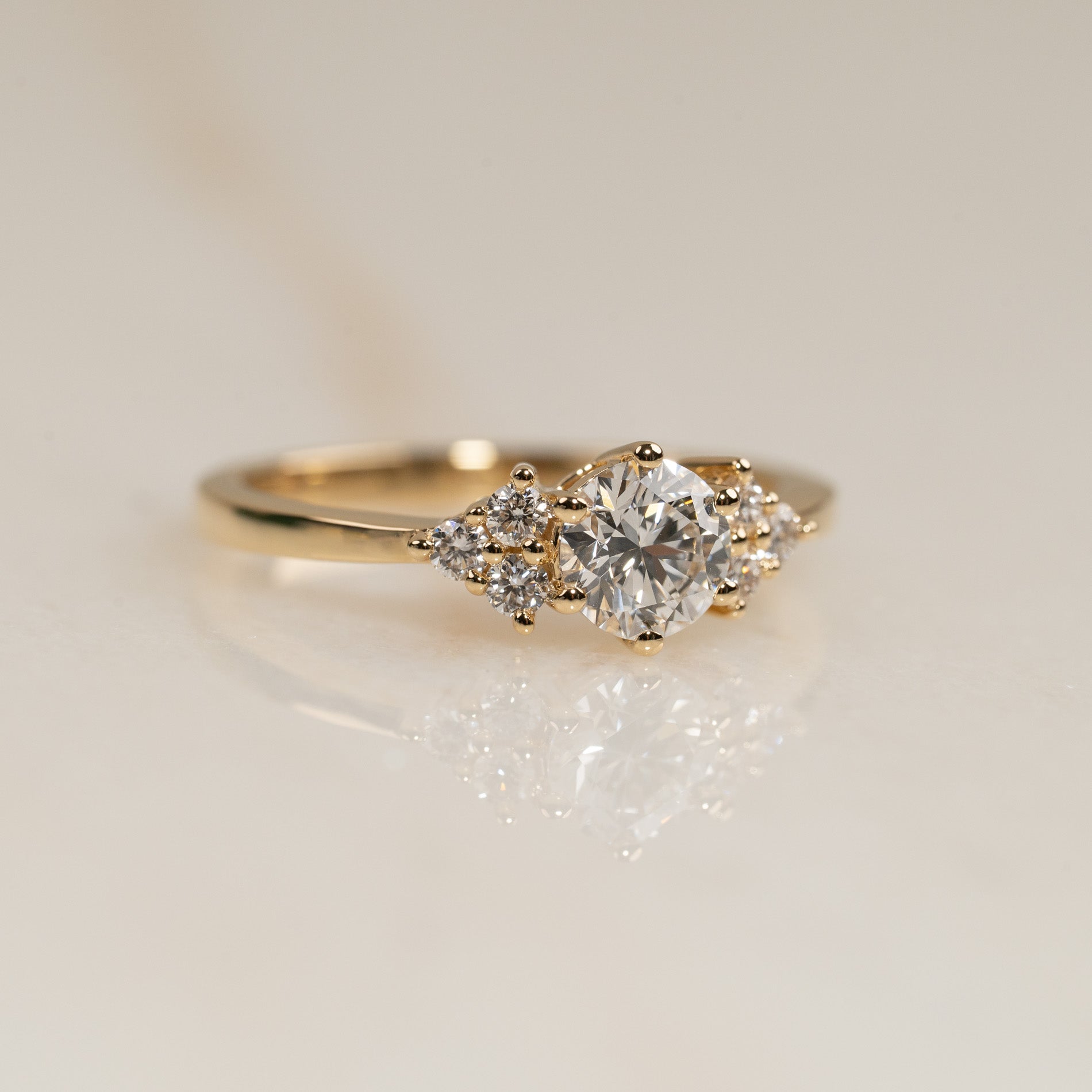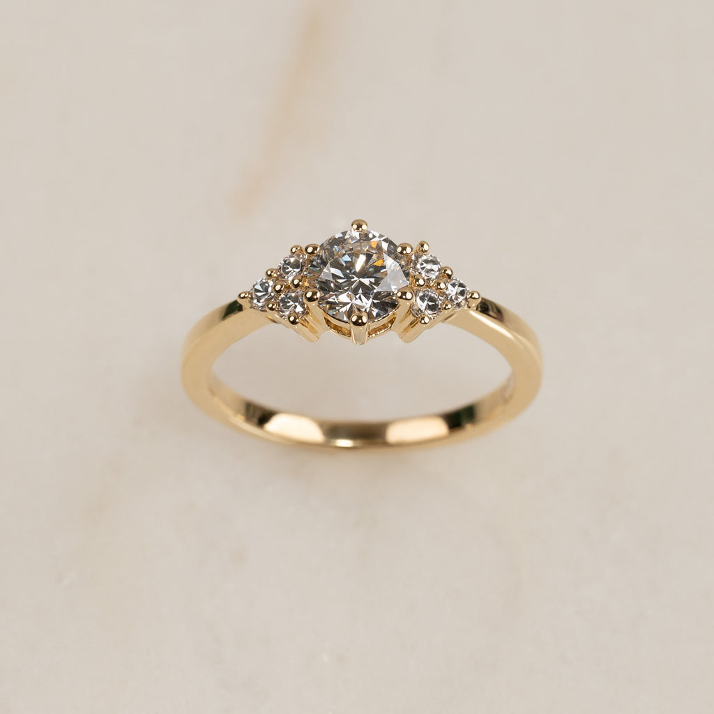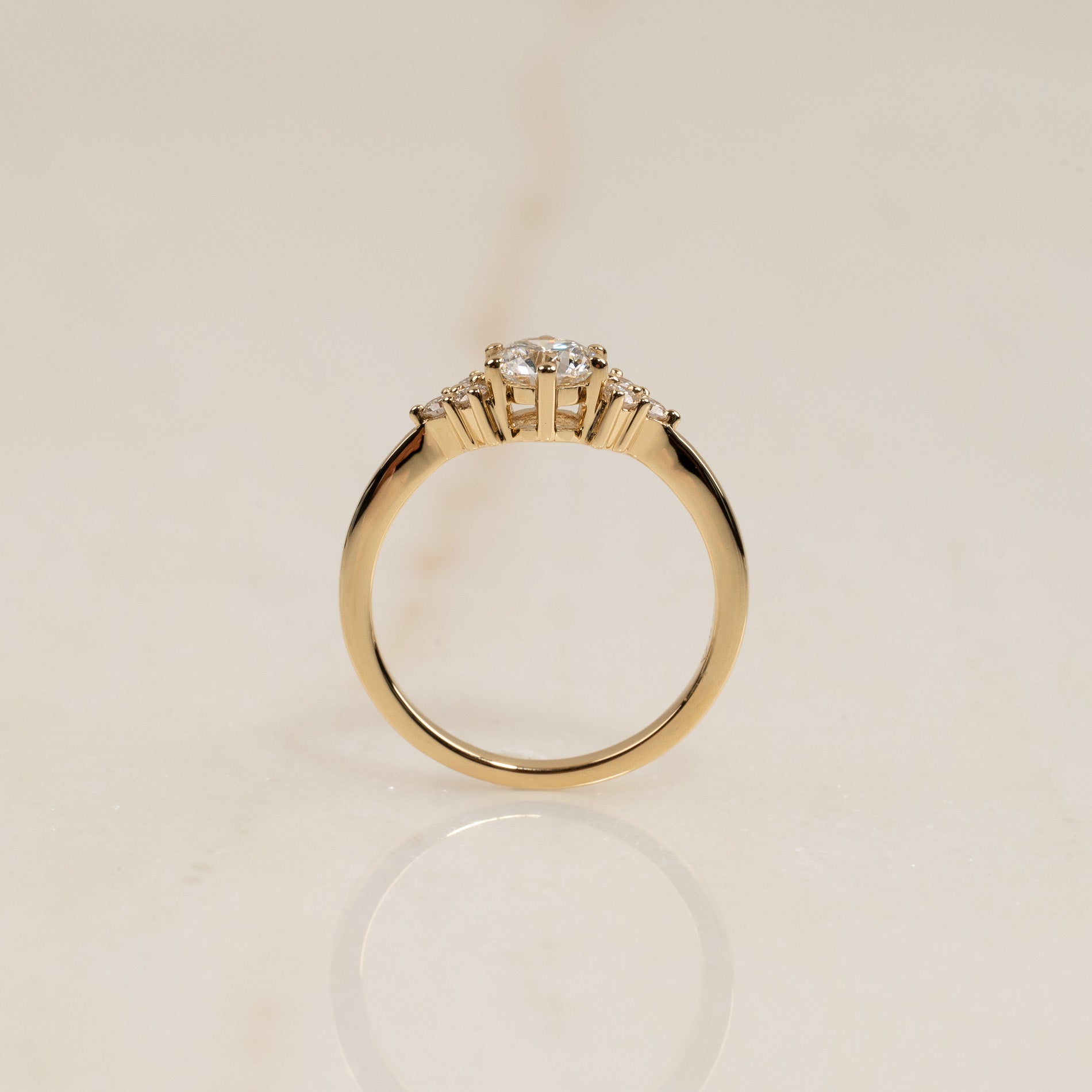 Ringen er fremstillet i 18 karat massivt guld med en 0,7 ct. brillantslebet lab-grown diamant, smukt komplementeret af sidesten, der elegant fremhæver centerstenen og giver maksimal brillans. I alt er ringen sat med 0,90 ct. lab-grown diamanter i farven E/F (River) og klarheden VVS.