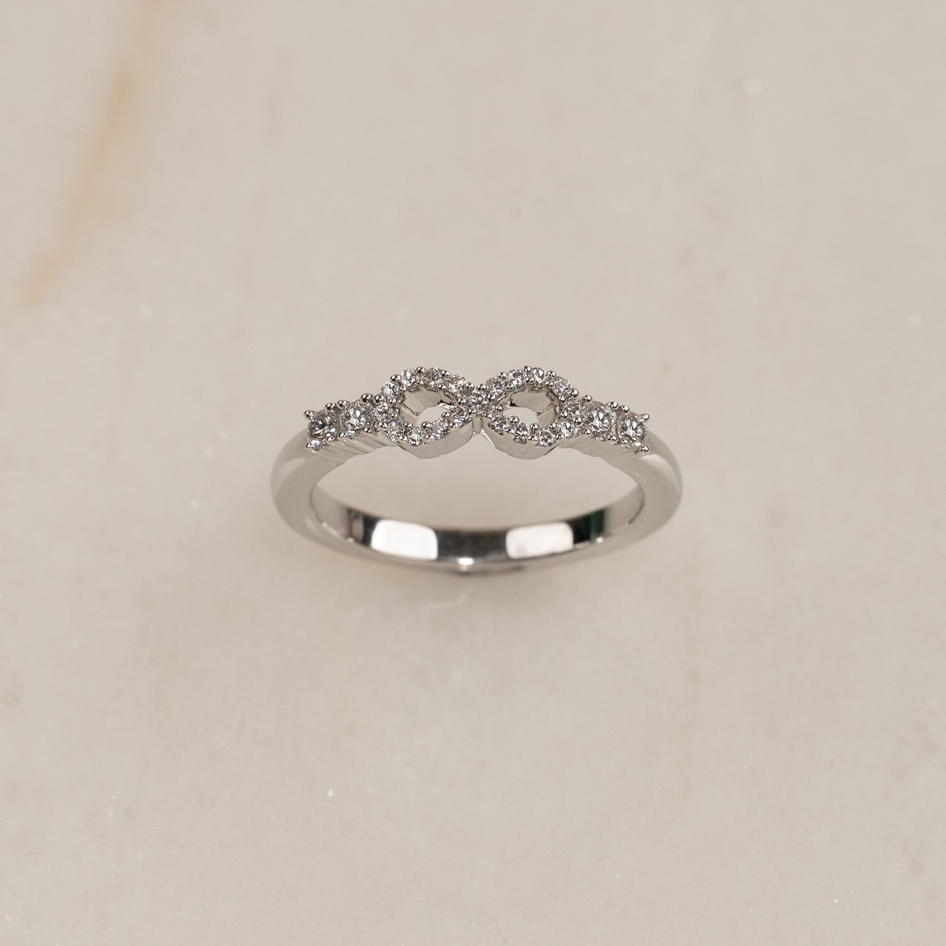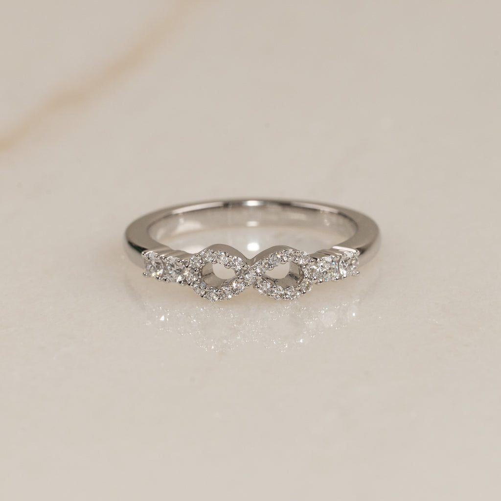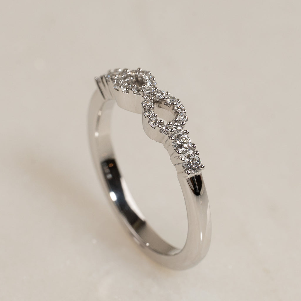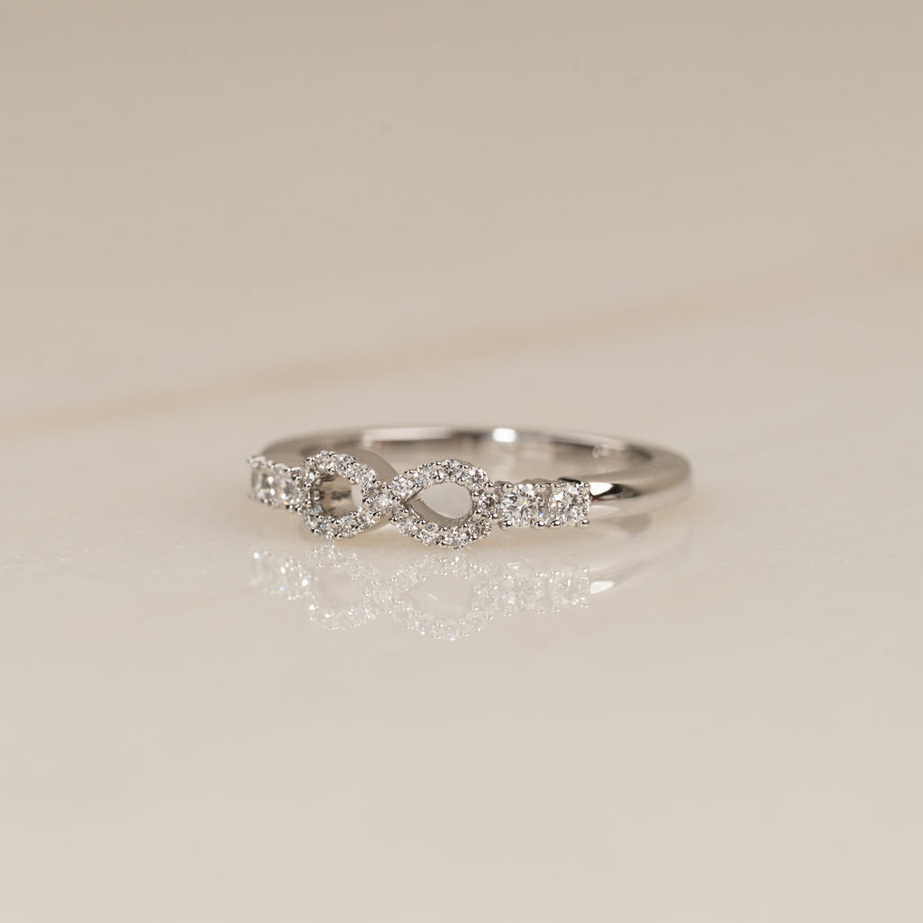 Ringen er skabt i 18 kt. massivt hvidguld og sat med lab-grown diamanter. Det funklende design er gjort personligt med et elegant infinity-motiv i midten, smukt komplementeret af to sidesten på hver side. Tilsammen har ringen en samlet caratvægt på 0,39 ct. Diamanterne er i farven E/F (River) og har klarheden VVS.