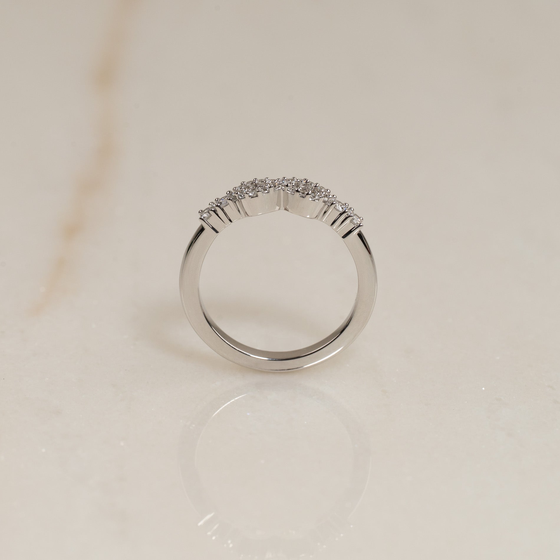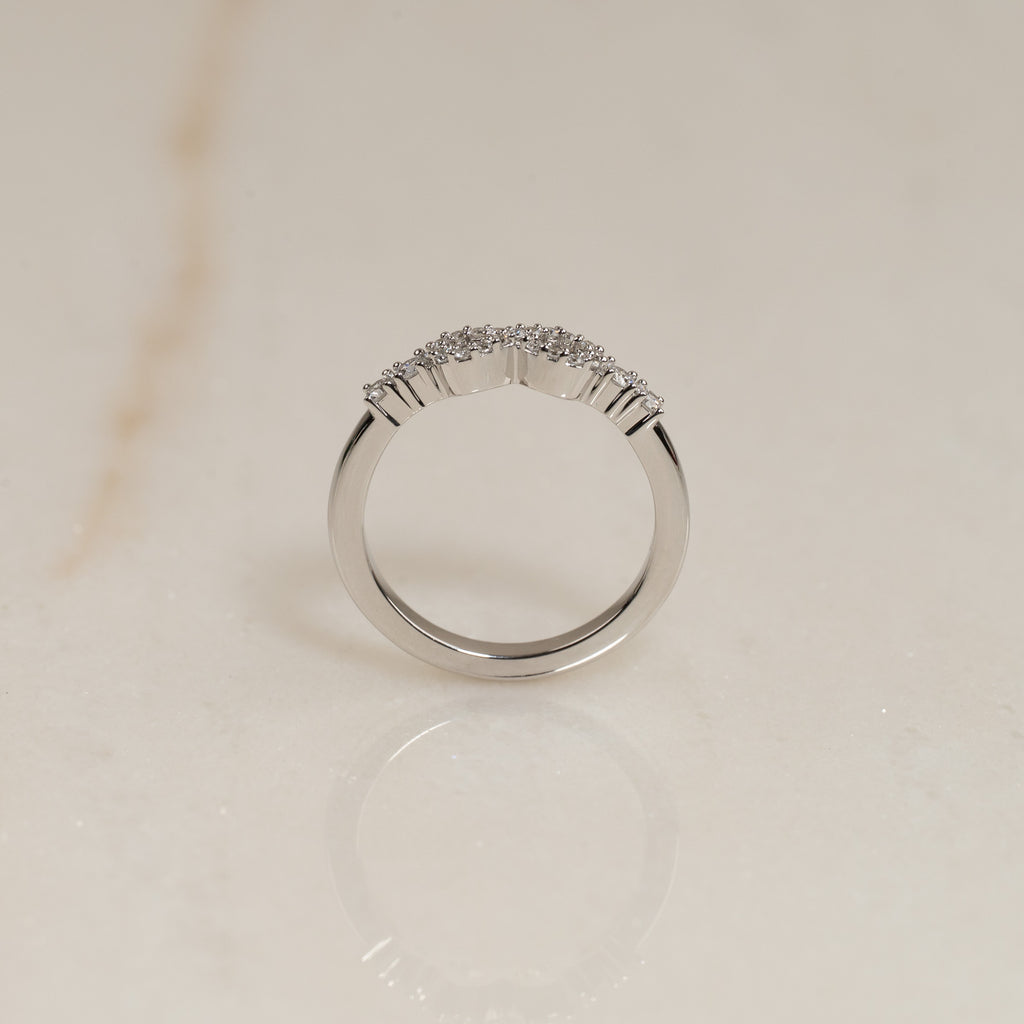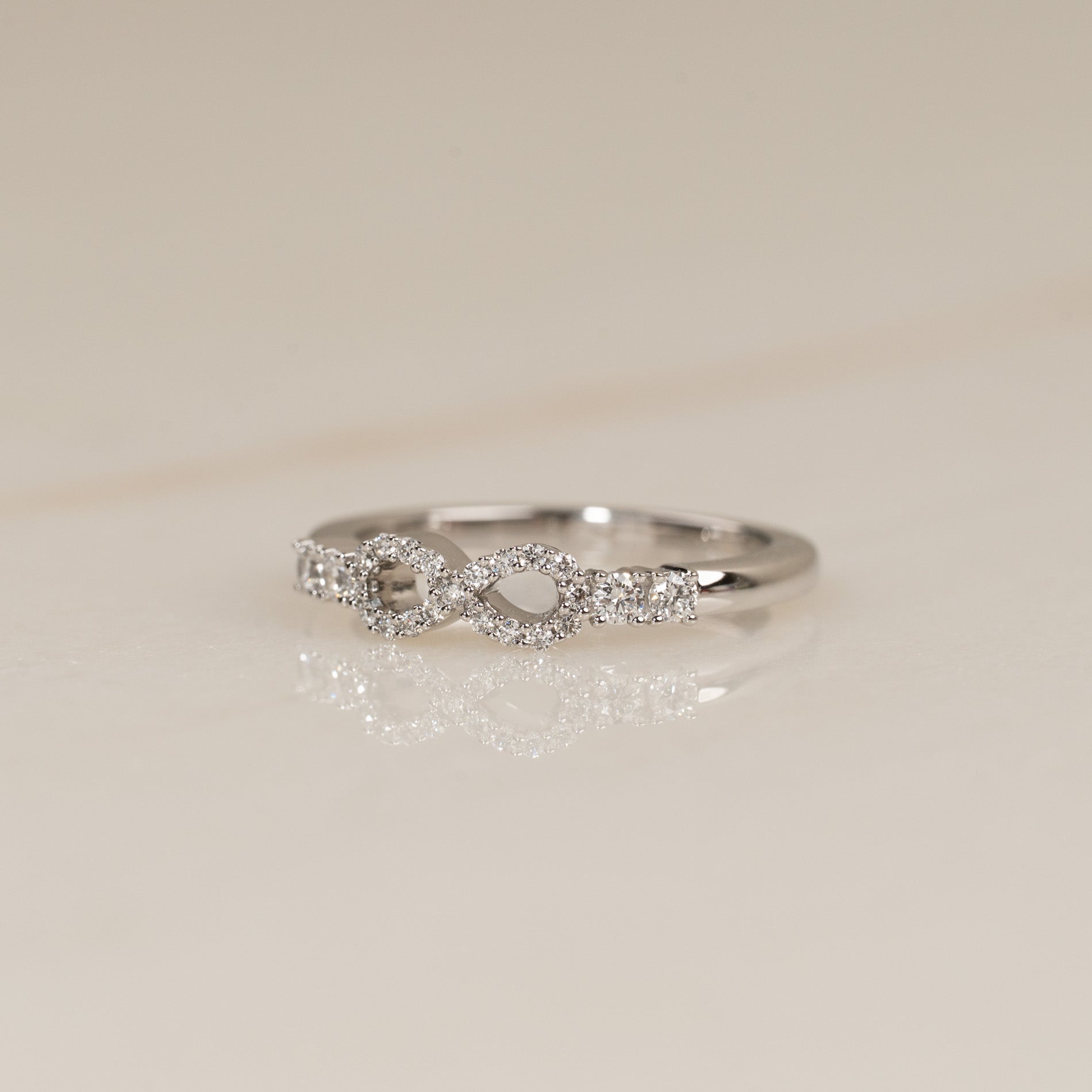 Ringen er skabt i 18 kt. massivt hvidguld og sat med lab-grown diamanter. Det funklende design er gjort personligt med et elegant infinity-motiv i midten, smukt komplementeret af to sidesten på hver side. Tilsammen har ringen en samlet caratvægt på 0,39 ct. Diamanterne er i farven E/F (River) og har klarheden VVS.
