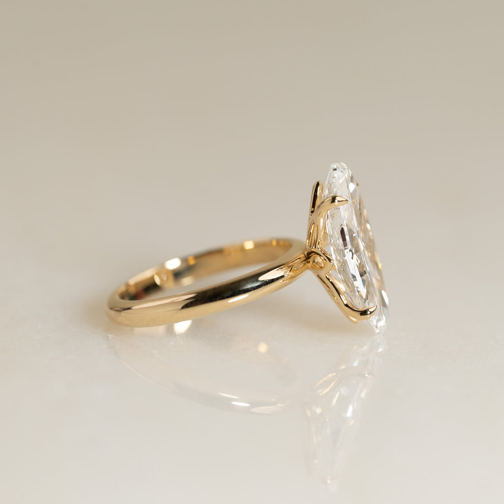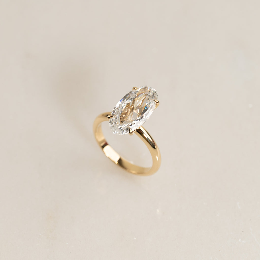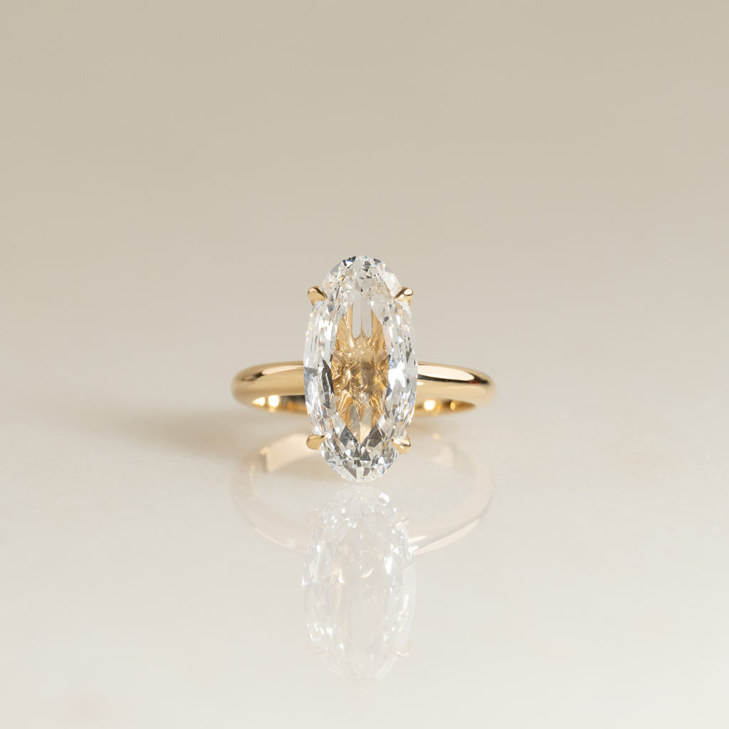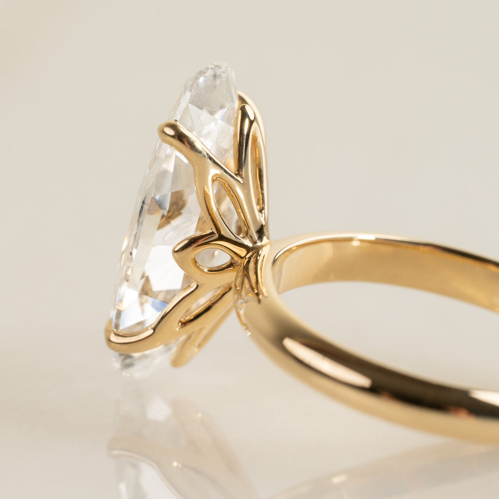 Ringen er fremstillet i 18 karat massivt guld og emmer af eksklusivitet. I centrum sidder en betagende 4,0 ct. moval-slebet lab-grown diamant, en unik slibning, der kombinerer det elegante fra en marquise-cut med den bløde oval-cut. Den imponerende centersten er smukt fattet i en tulip-fatning, som fremhæver diamantens unikke form og giver ringen et romantisk og eksklusivt udtryk.