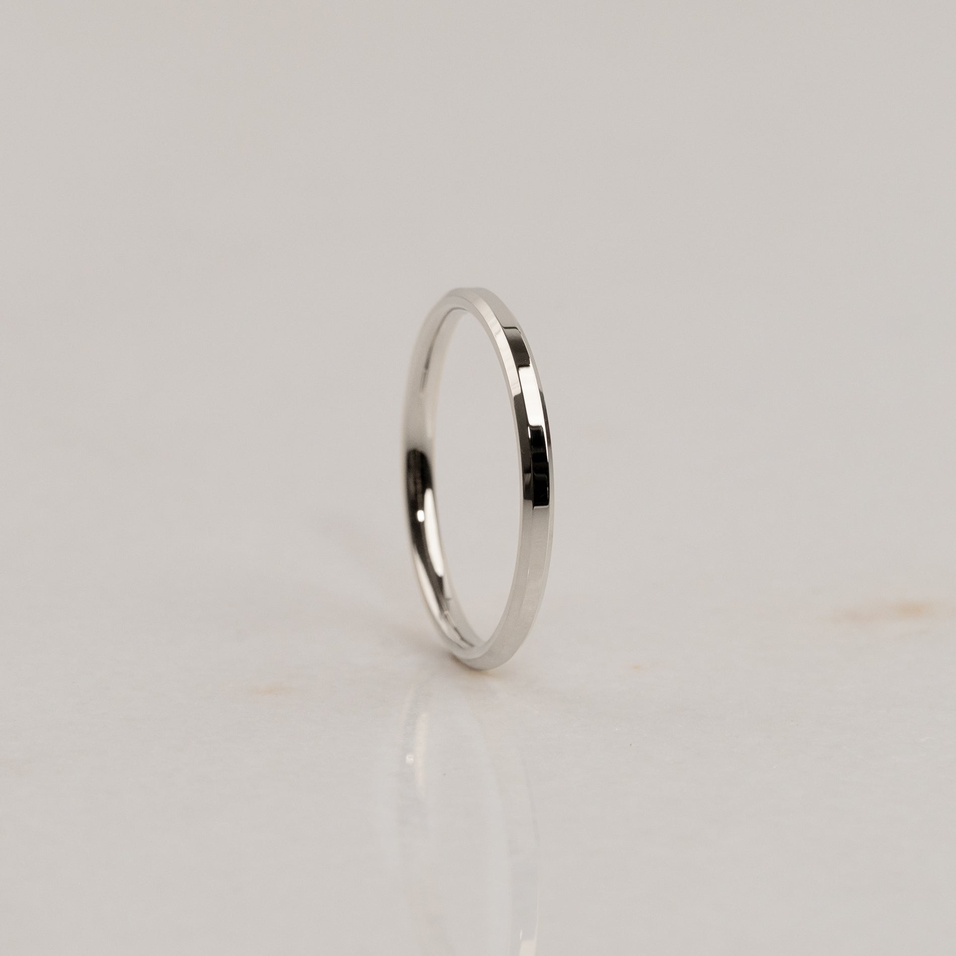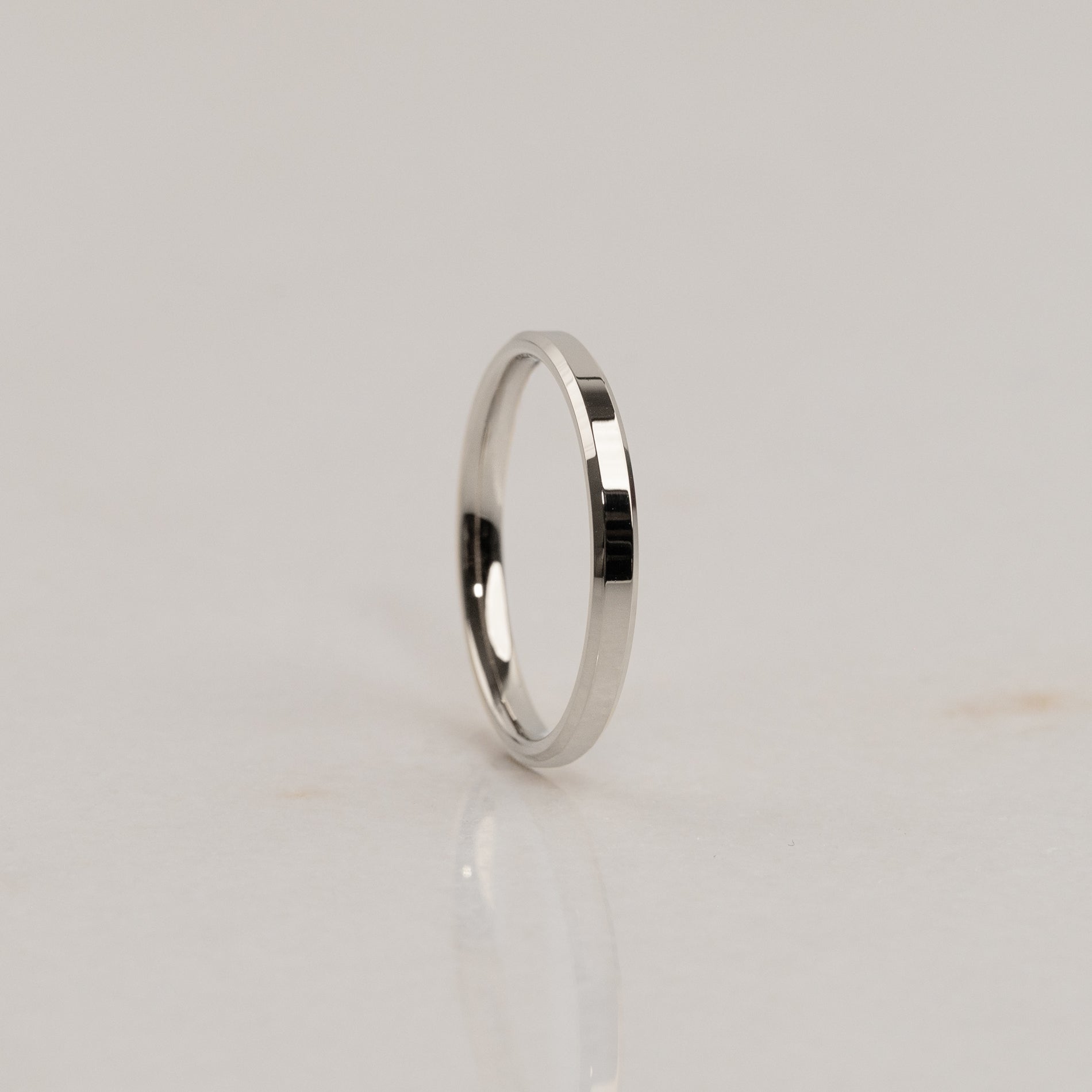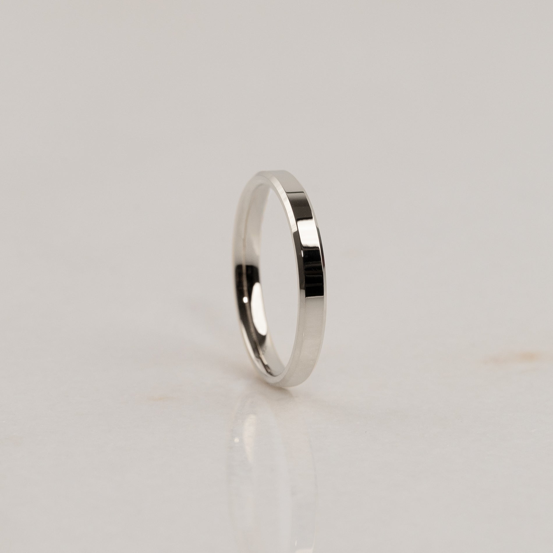 Vores Beveled Flat Comfort-design er en moderne vielsesring med et minimalistisk udtryk. Den flade yderside kombineret med de affasede kanter giver ringen et skarpt udtryk, mens den let rundede inderside sikrer en komfortabel pasform.