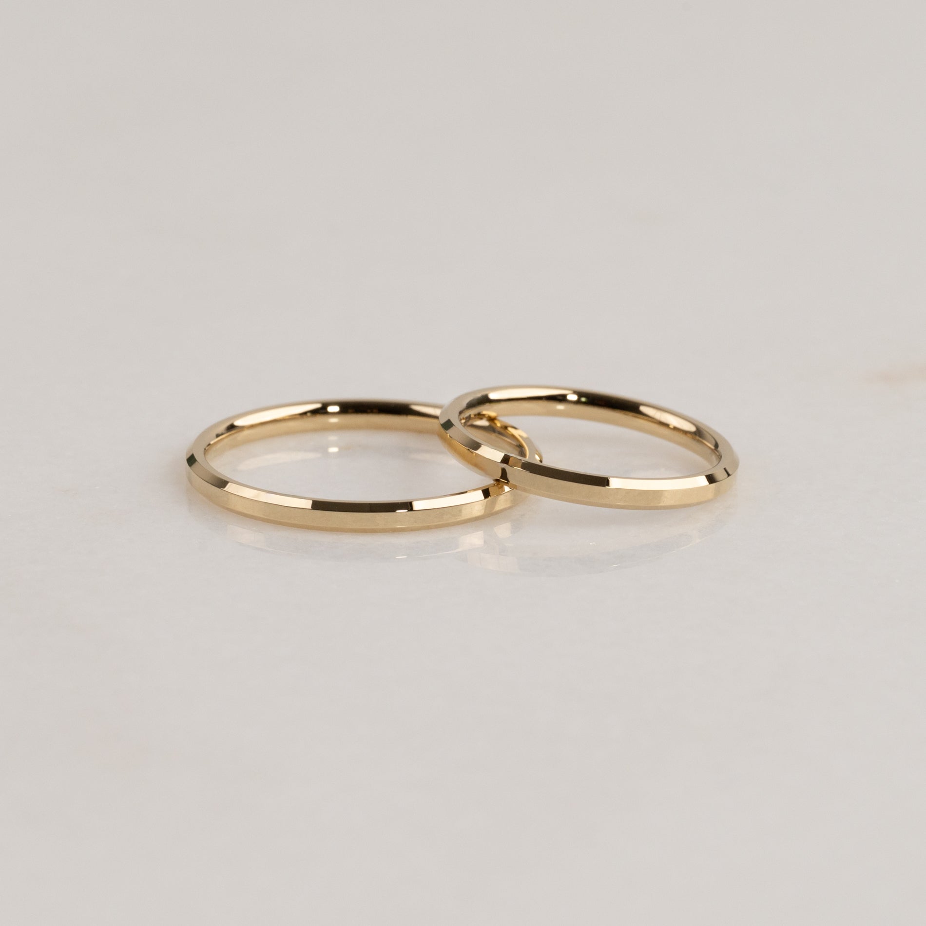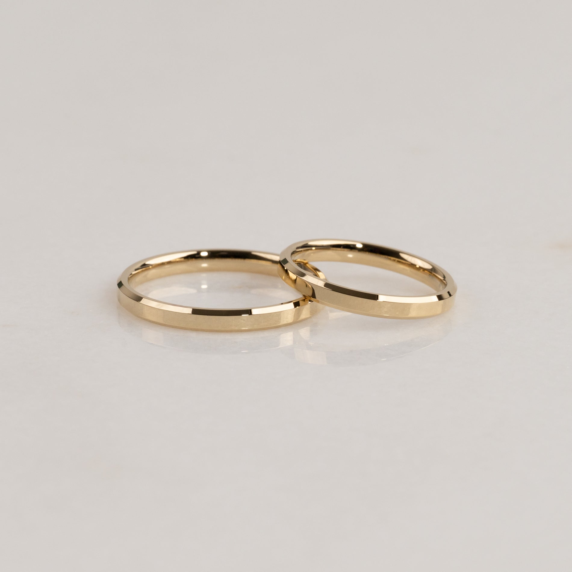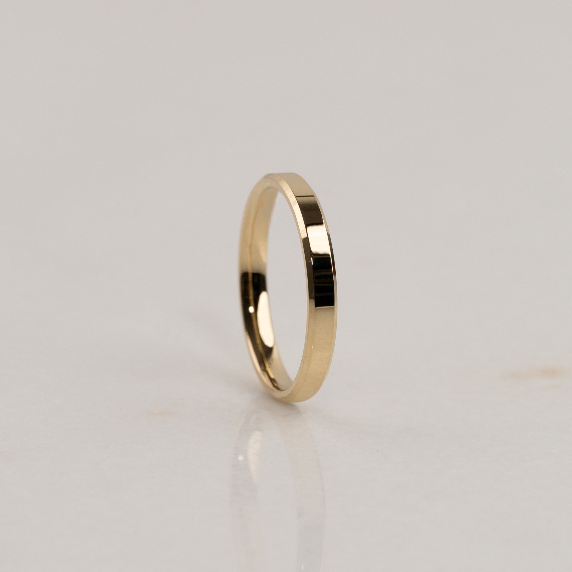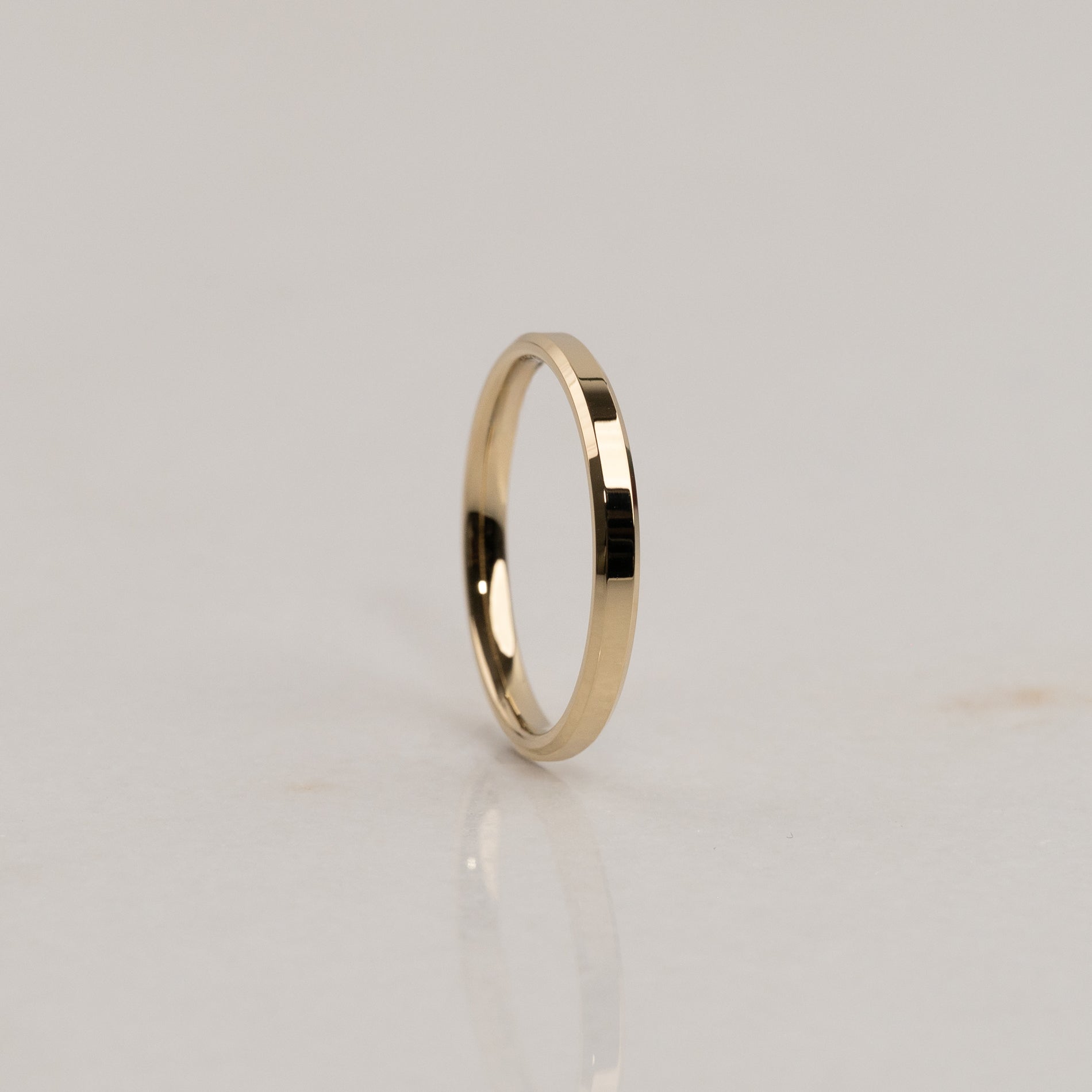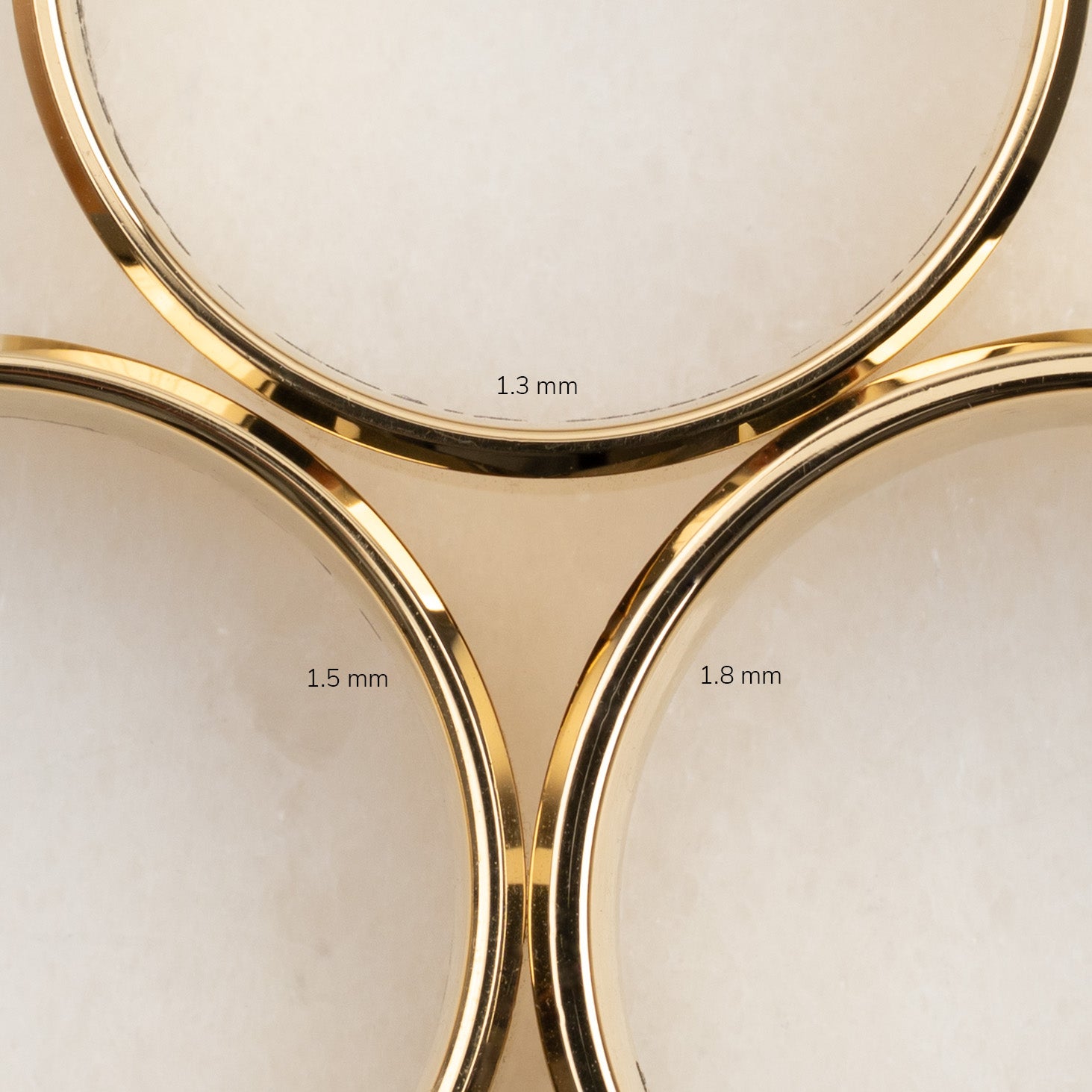 Ringen i 2 mm bredde er den slankeste profil. Til denne bredde anbefaler vi en tykkelse på 1,5 mm for en balanceret proportion og så ringen ikke bliver for spinkel, særligt ved ringstørrelser over 54.