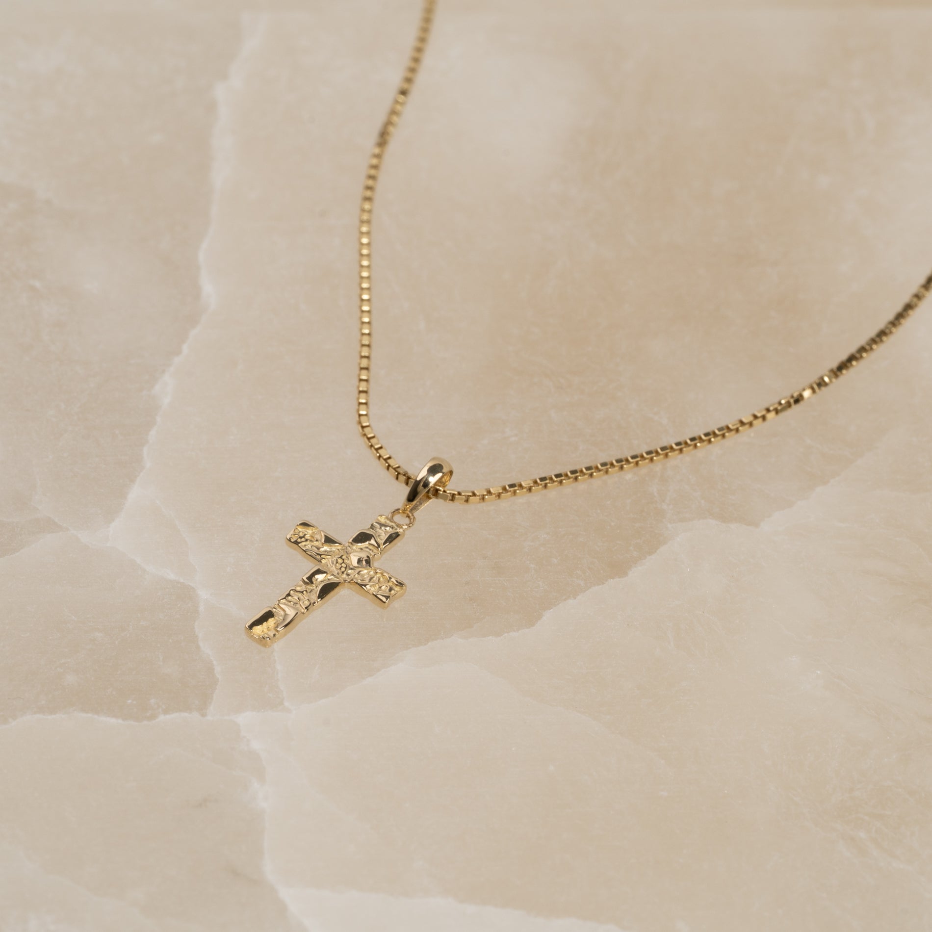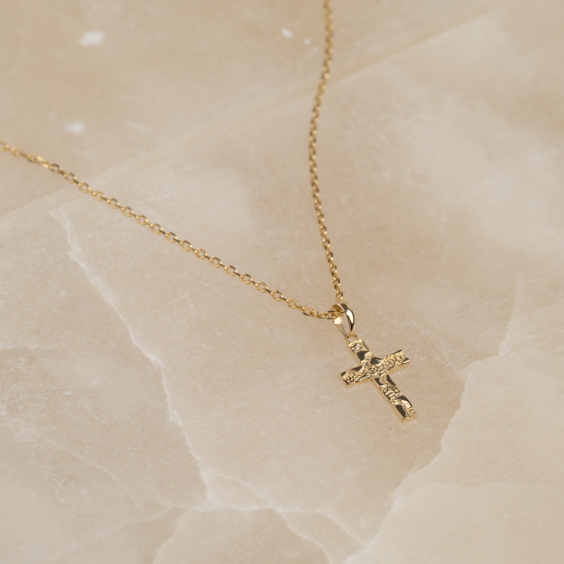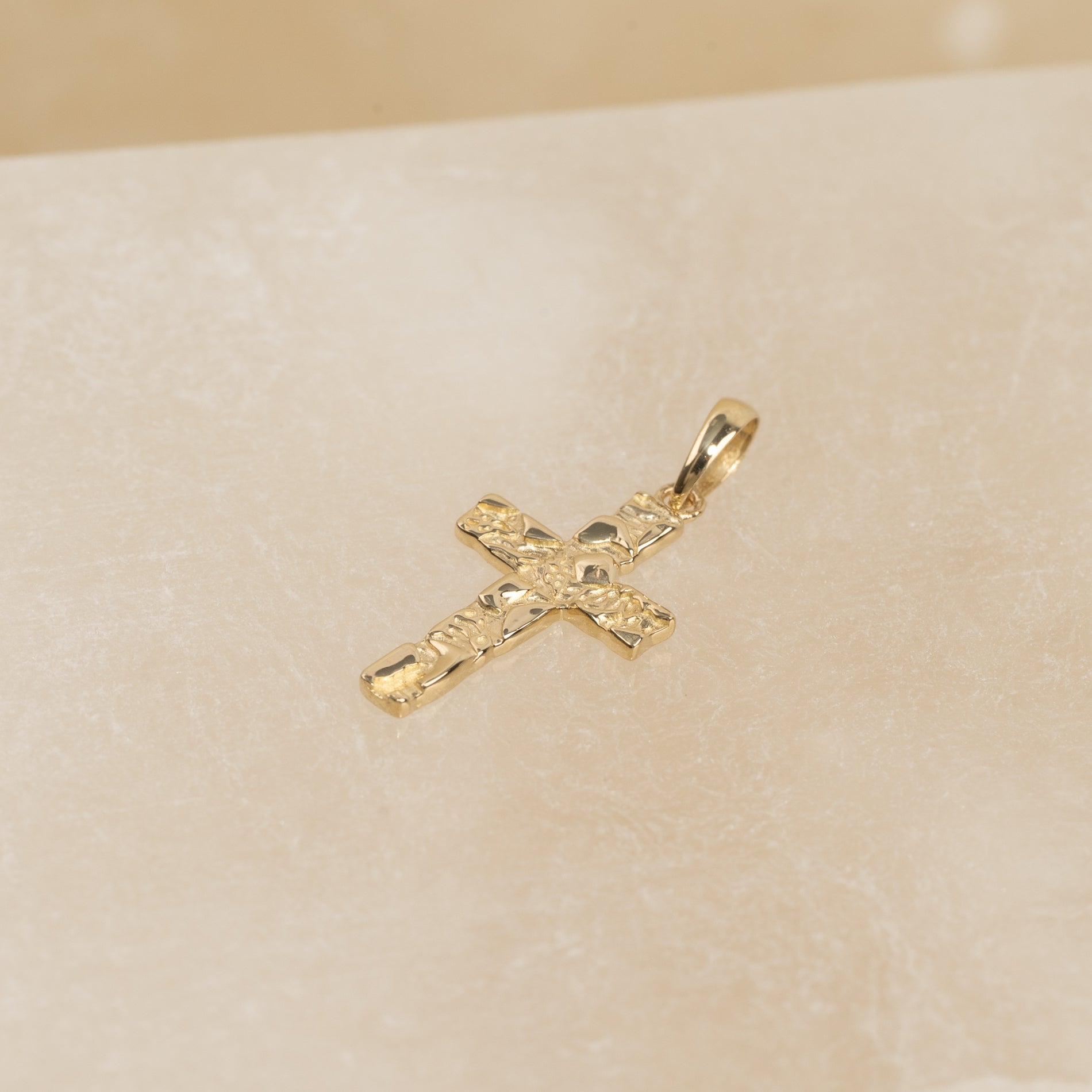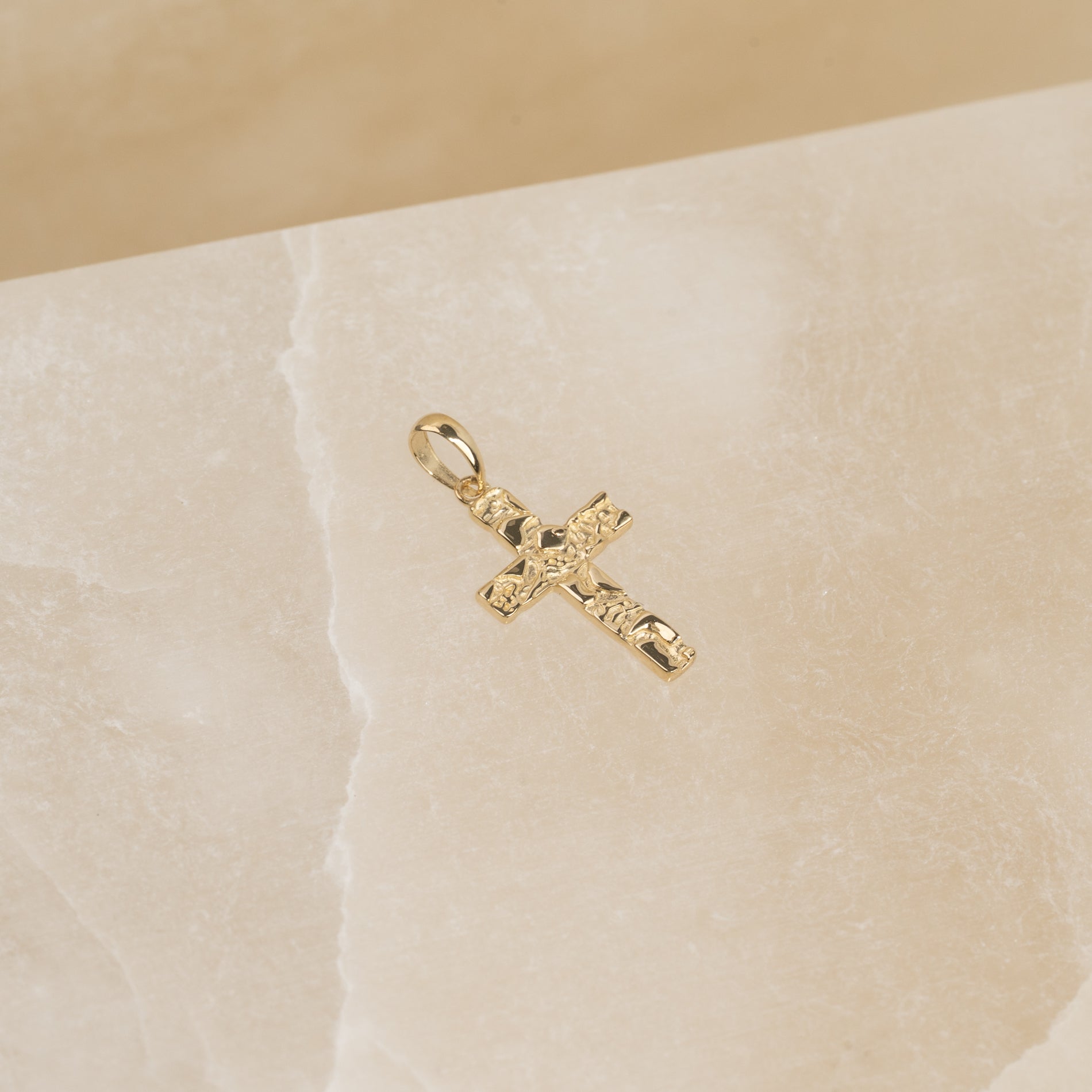 Graverbart korsvedhæng i massiv guld i rustikt design