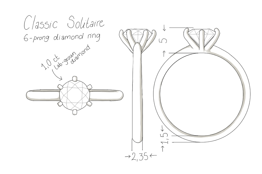 Ringen er udført i 14 karat massiv hvidguld med skabt lab-grown diamant, der har en vægt på 1 ct. Diamanten har farven E/F (River) og klarheden VVS. Smykket er skabt med omtanke; diamanterne er fremstillet med blandt andet solenergi, og guldet er 100% certificeret genanvendt.
