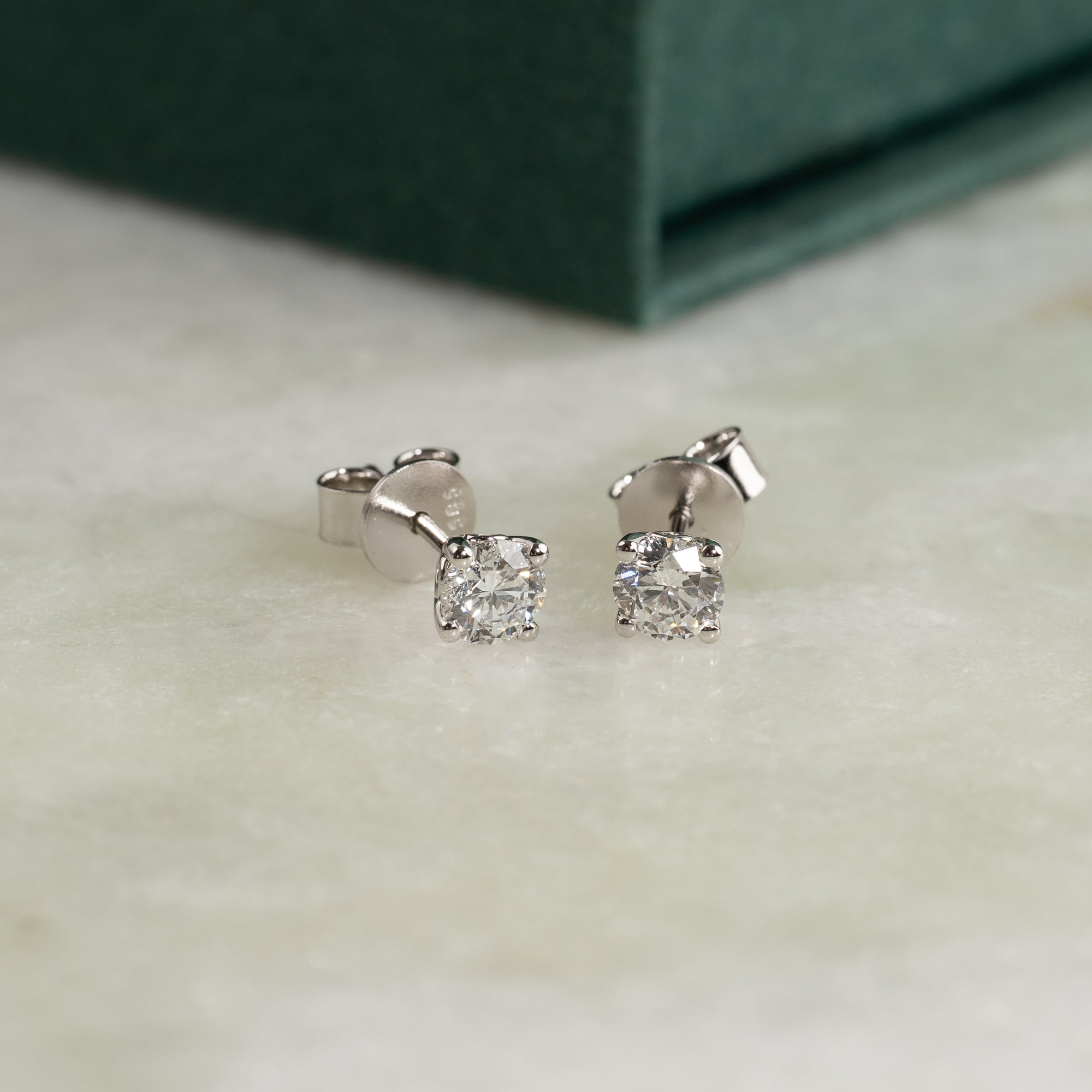 Vores solitaire diamantørestikkere er lavet i 14 karat massiv hvidguld med lab-grown diamanter på hver 0,4 ct. - derved en samlet vægt på 0,8 ct. De har farven E/F (River) og klarheden VVS. Smykket er skabt med omtanke; diamanterne er fremstillet med blandt andet solenergi, og guldet er 100% certificeret genanvendt.