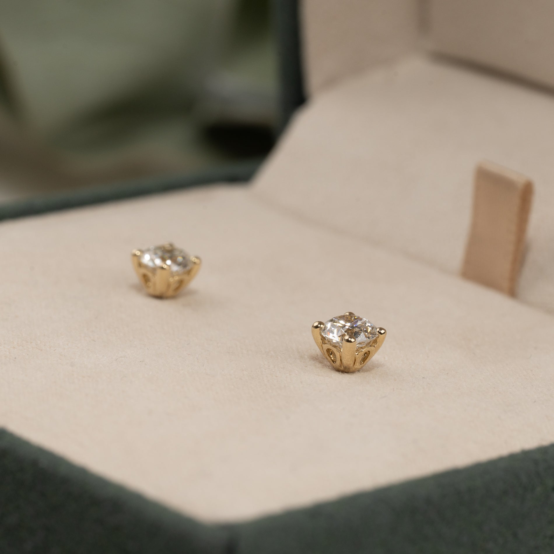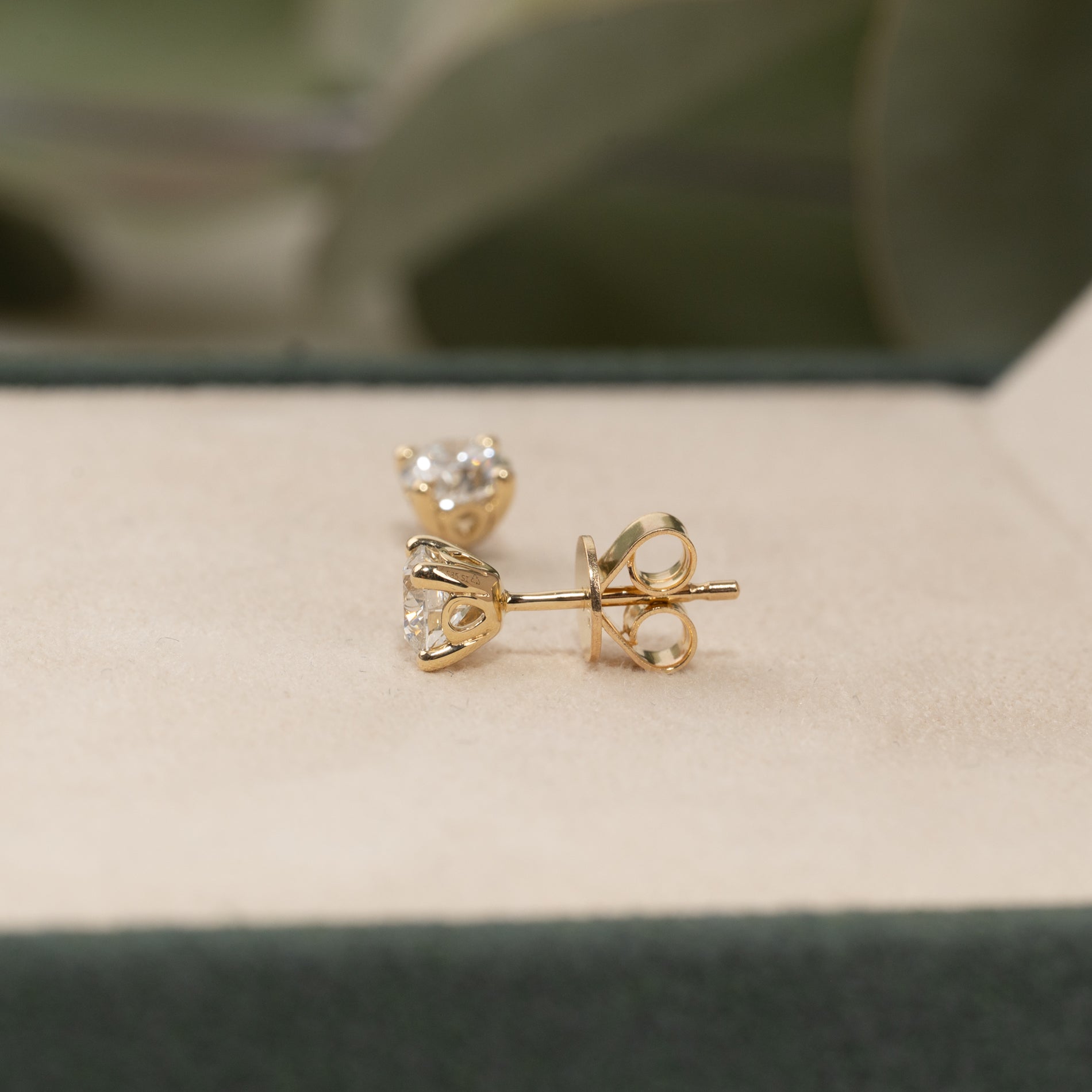 Vores solitaire diamantørestikkere er lavet i 14 karat massiv guld med lab-grown diamanter på hver 0,5 ct. - derved en samlet vægt på 1,0 ct. De har farven E/F (River) og klarheden VVS. Smykket er skabt med omtanke; diamanterne er fremstillet med blandt andet solenergi, og guldet er 100% certificeret genanvendt.