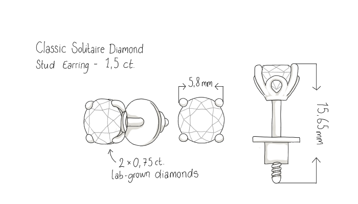 Vores solitaire diamantørestikkere er lavet i 14 karat massiv guld med lab-grown diamanter på hver 0,75 ct. - derved en samlet vægt på 1,5 ct. De har farven E-F (River) og klarheden VVS. Smykket er skabt med omtanke; diamanterne er fremstillet med blandt andet solenergi, og guldet er 100% certificeret genanvendt.