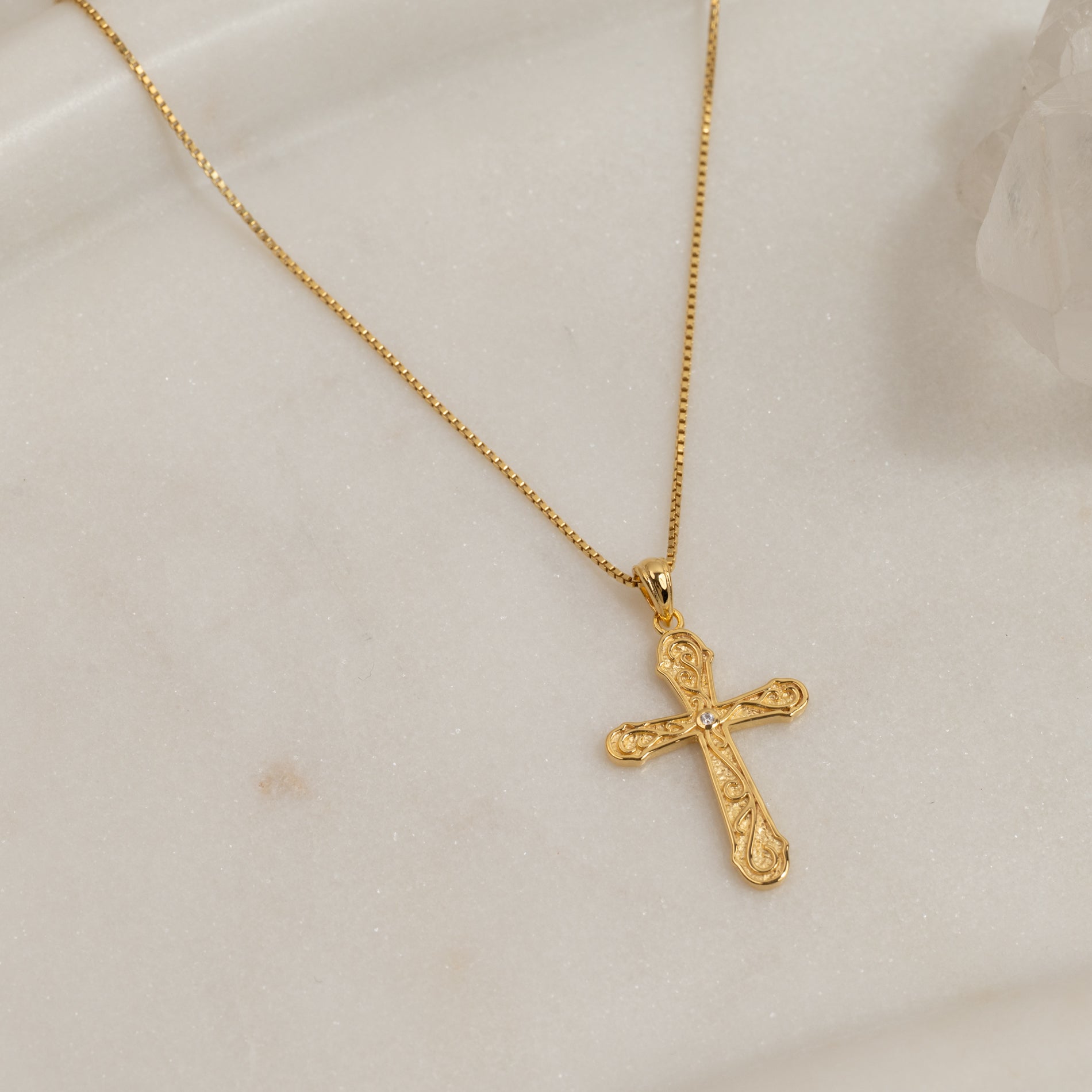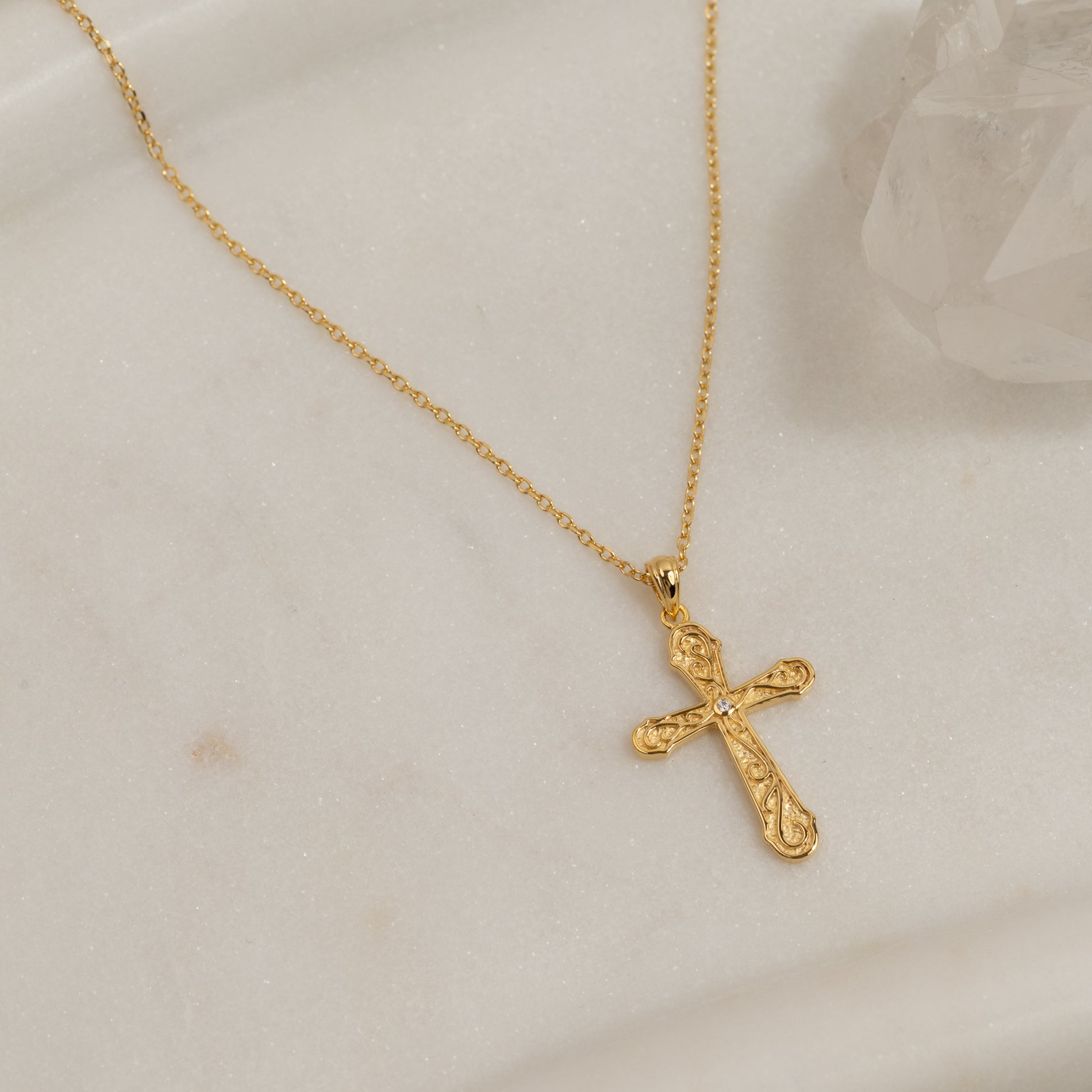 Korsvedhæng i 100% genanvendt 18 karat forgyldt sterlingsølv med en klar kubisk zirkon i midten.