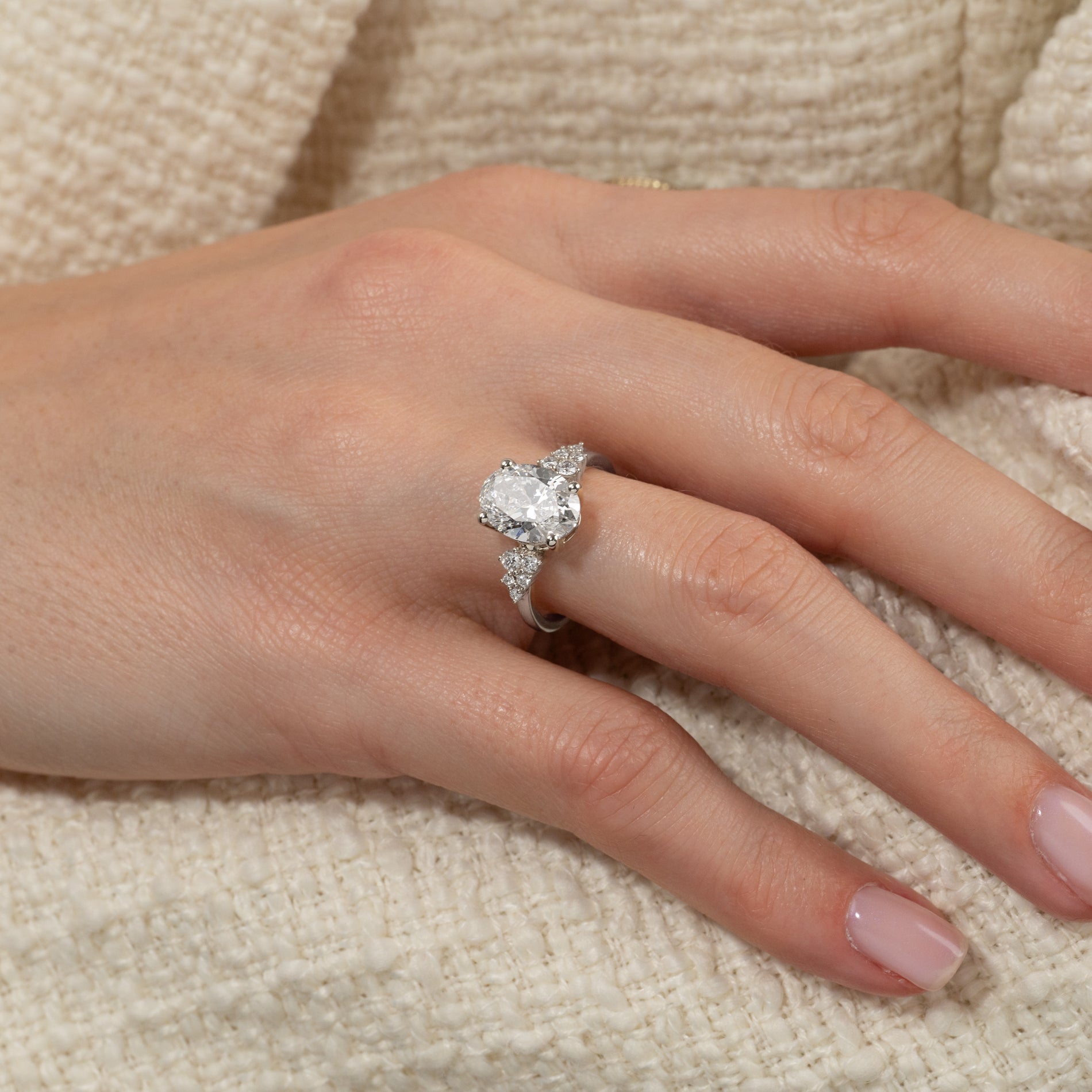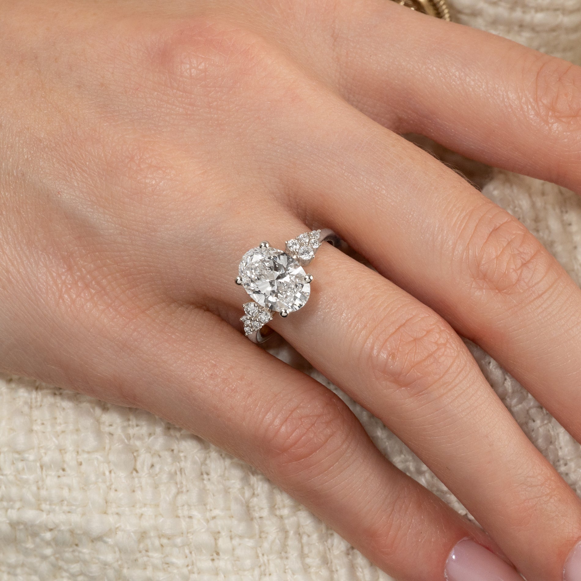 Oval cluster ring i 14 karat hvidguld med en 3,0 ct. oval lab-grown centersten og delikate sidesten