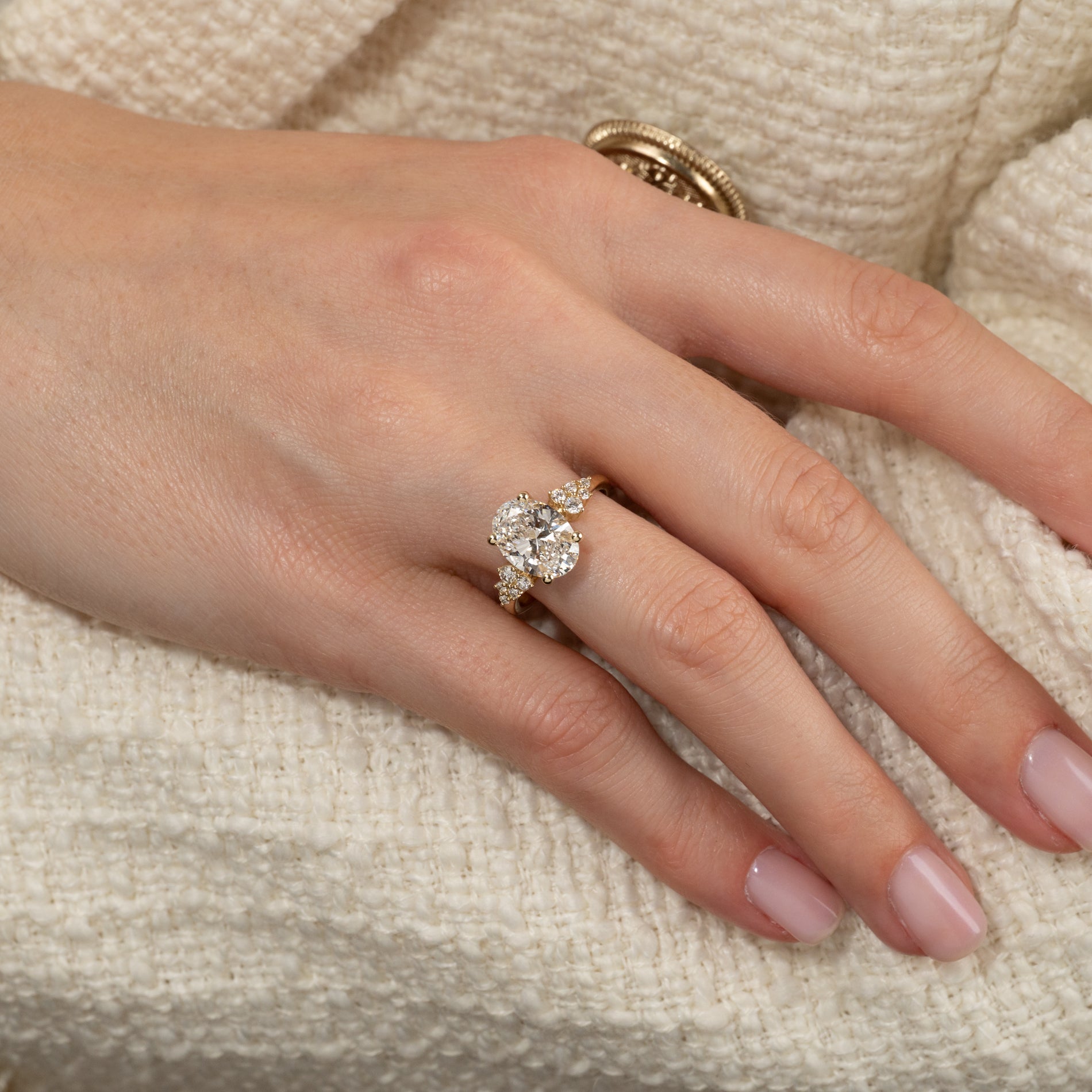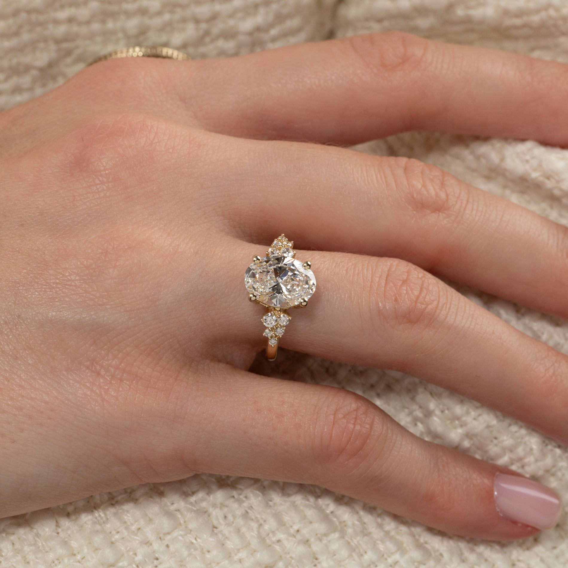 Oval cluster ring i 14 karat guld med 3,0 ct. oval lab-grown centersten og delikate sidesten