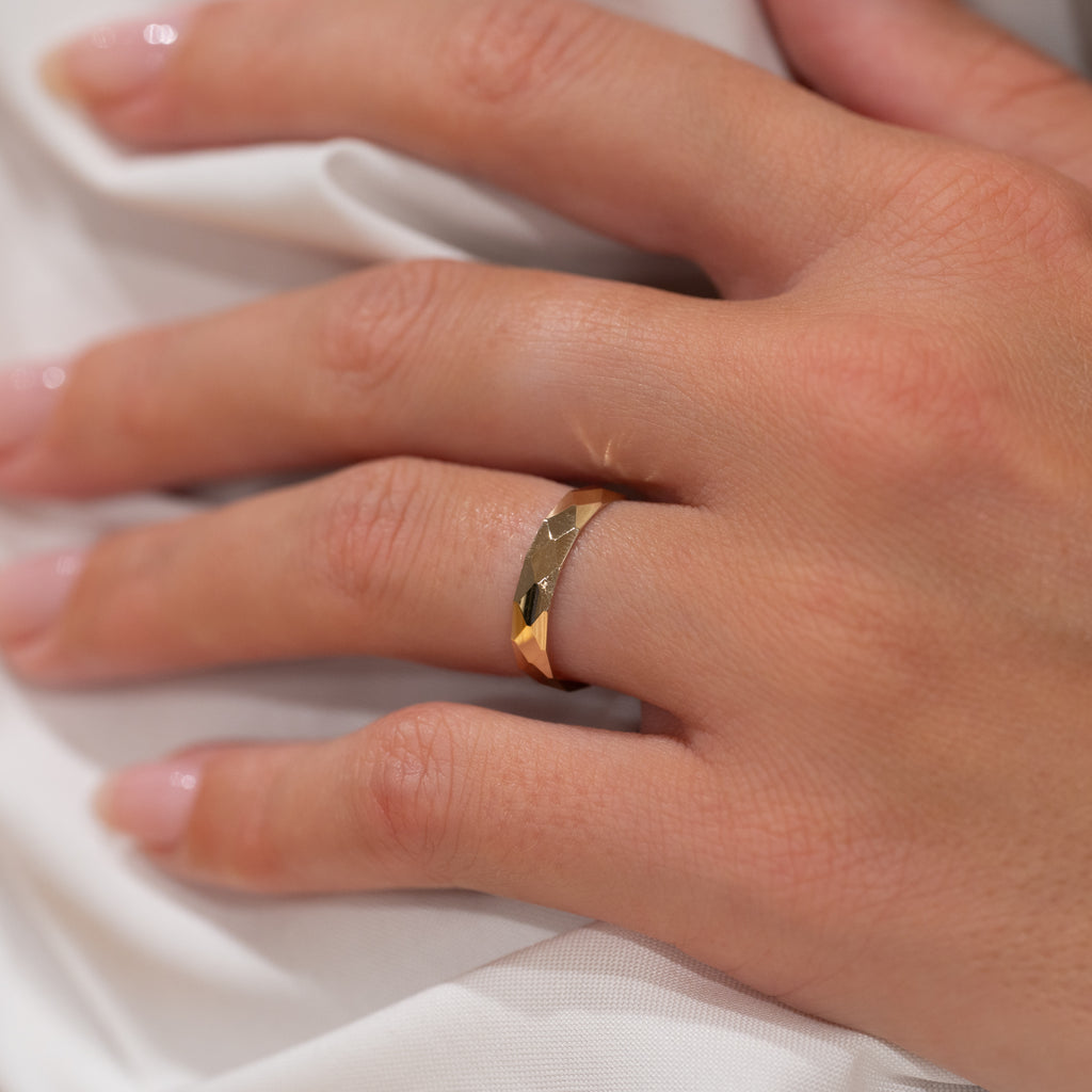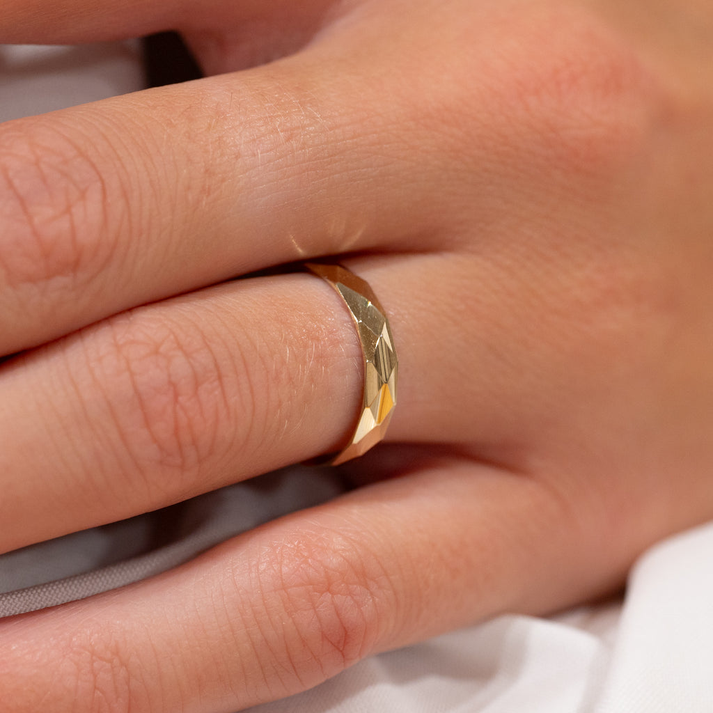 Denne elegante ring har en facetteret overflade, der giver en unik struktur og smukke detaljer. Den brede ringskinne skaber et markant udtryk og gør ringen perfekt til dig, der elsker et mere chunky smykkedesign.