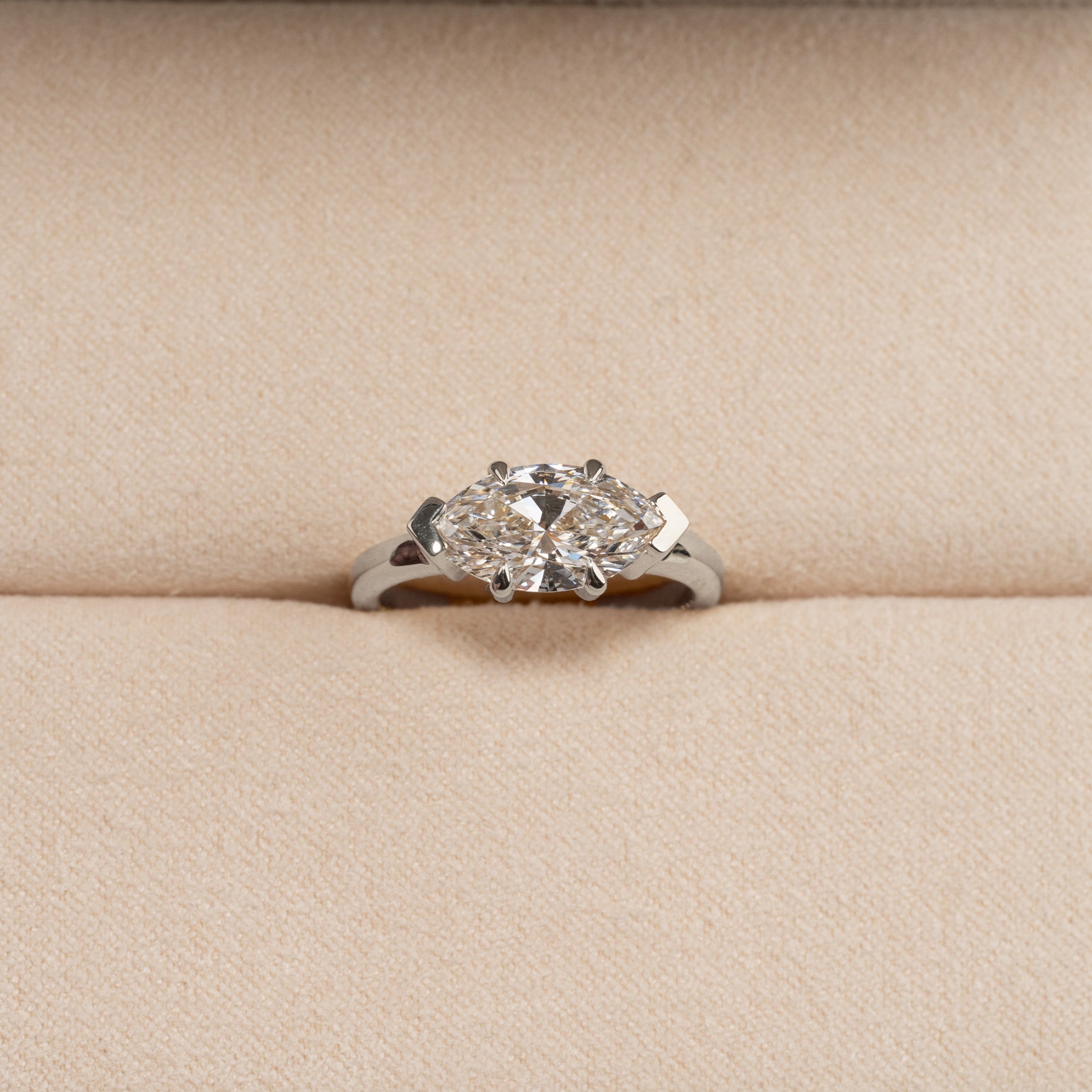 Ring i 14 karat hvidguld med en 2,0 ct. marquise-slebet lab-grown diamant. Stenen er smukt fattet i en East To West basket-fatning, med 4 talon- og 2 V-klør, der komplimenterer den elegante sten. Ringen er en perfekt cocktailring, den perfekte gave til en, man elsker og holder af eller som den perfekte forlovelsesring.