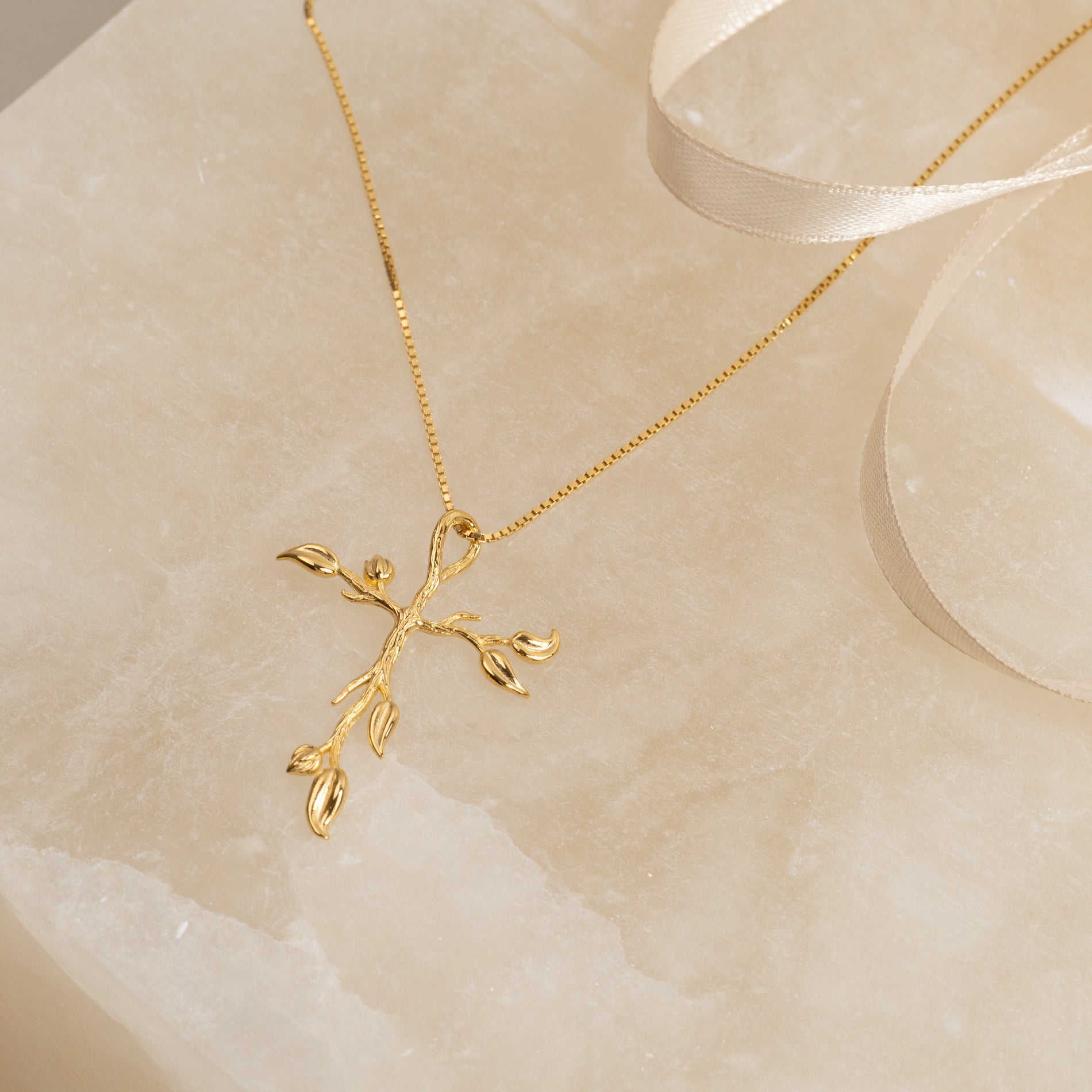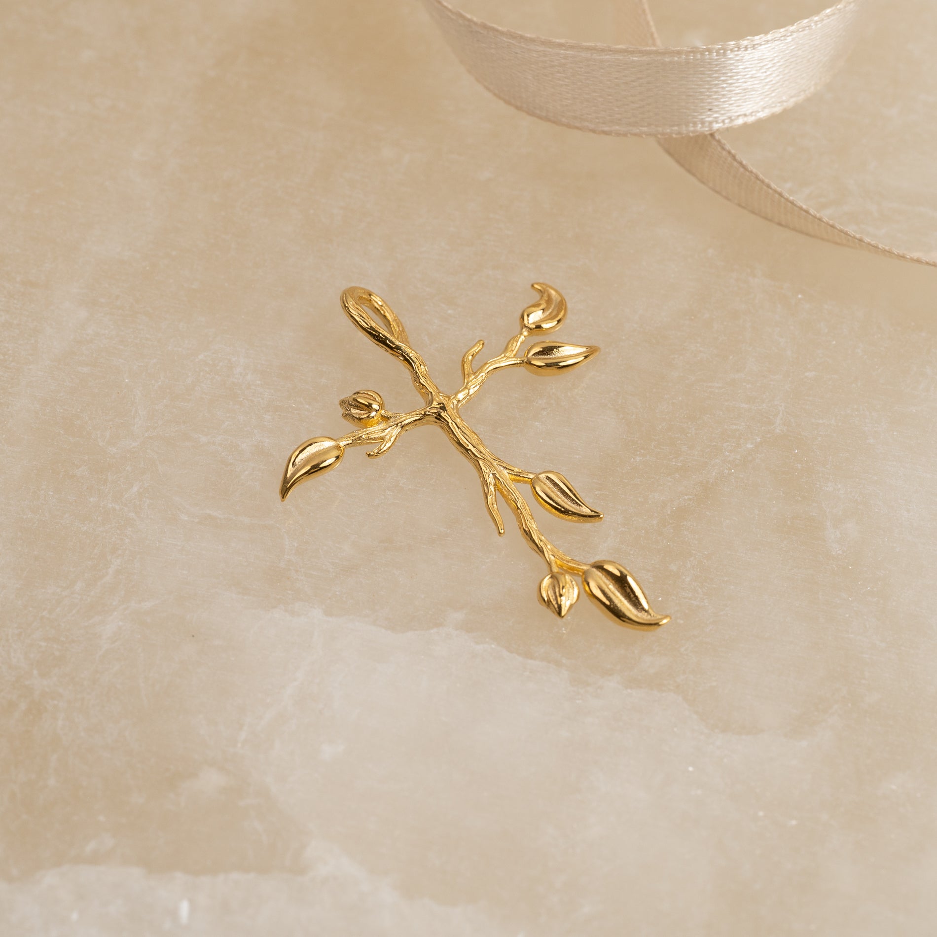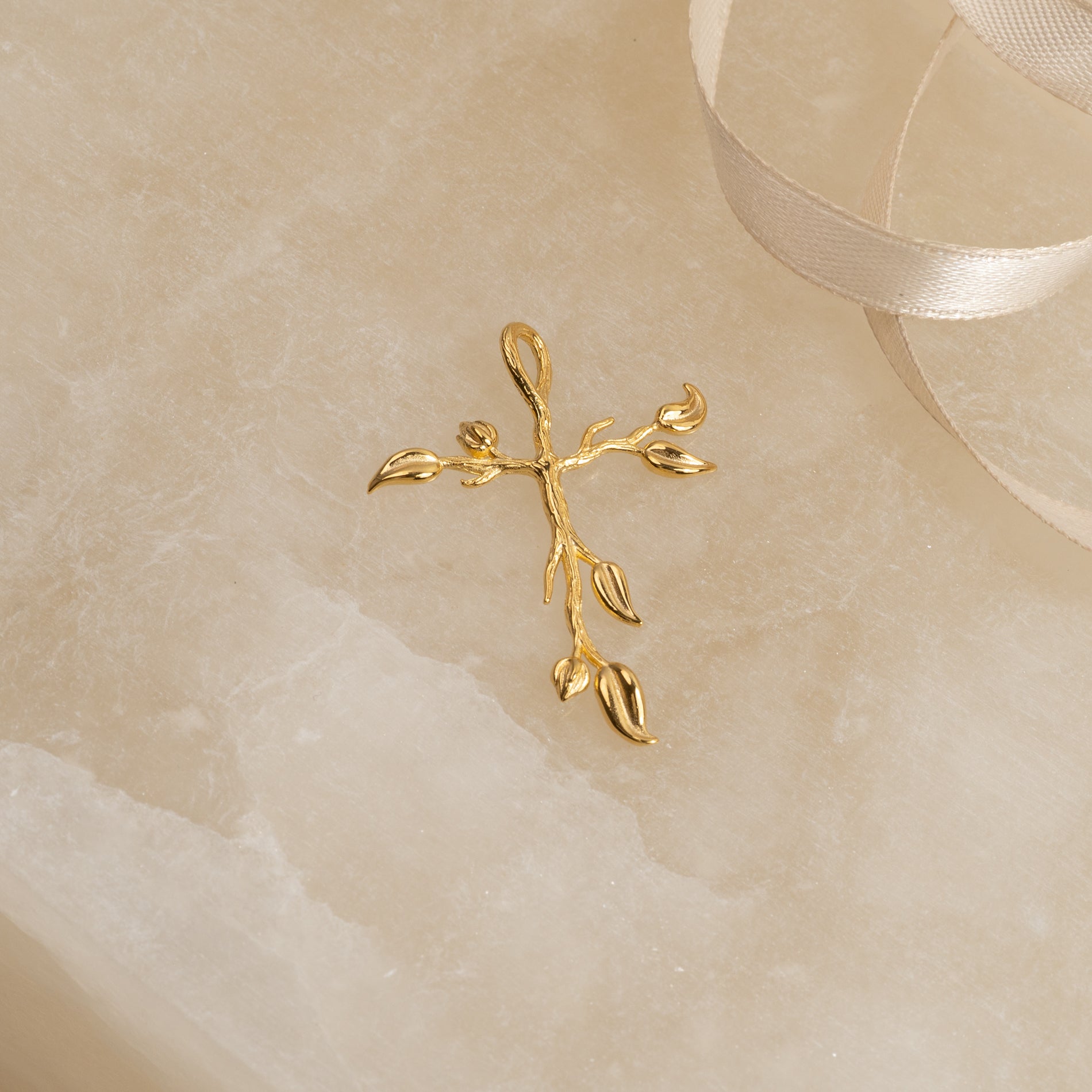 Korsvedhæng med træ-inspirerede detaljer, fremstillet i 100% genanvendt 18 karat forgyldt sterlingsølv.