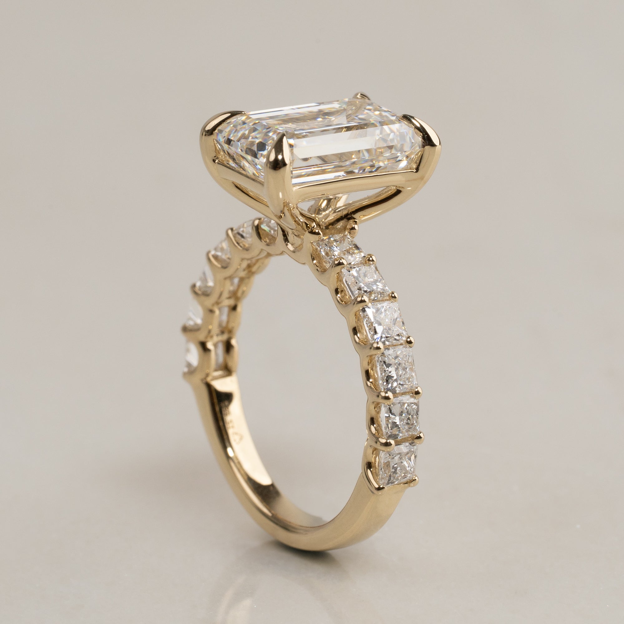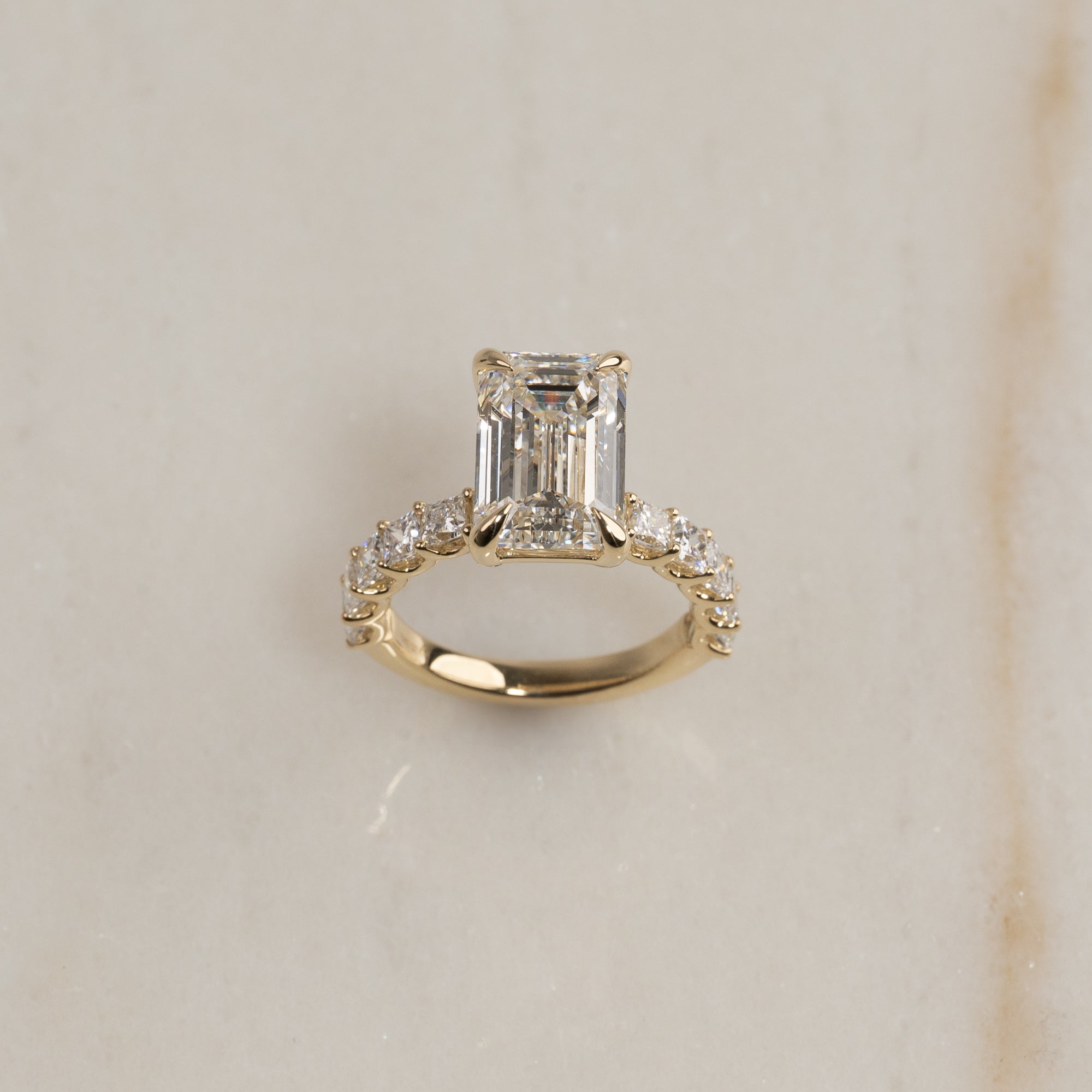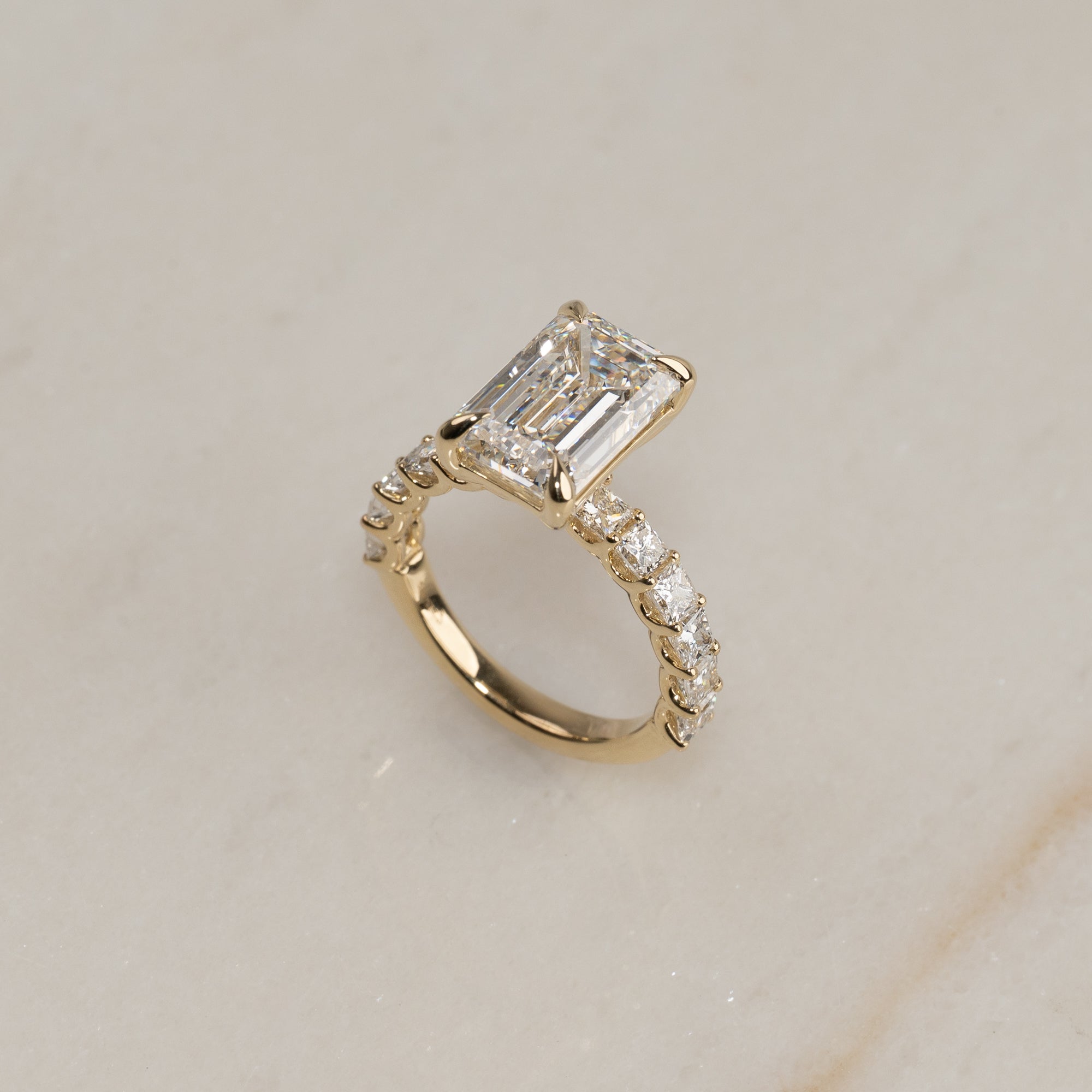 Ringen er fremstillet i 14 karat massivt guld og emmer af eksklusivitet. I centrum sidder en imponerende 5,0 ct. emerald-cut lab-grown diamant – en sofistikeret slibning med trappefacettering, der skaber en klar, spejlende glans.