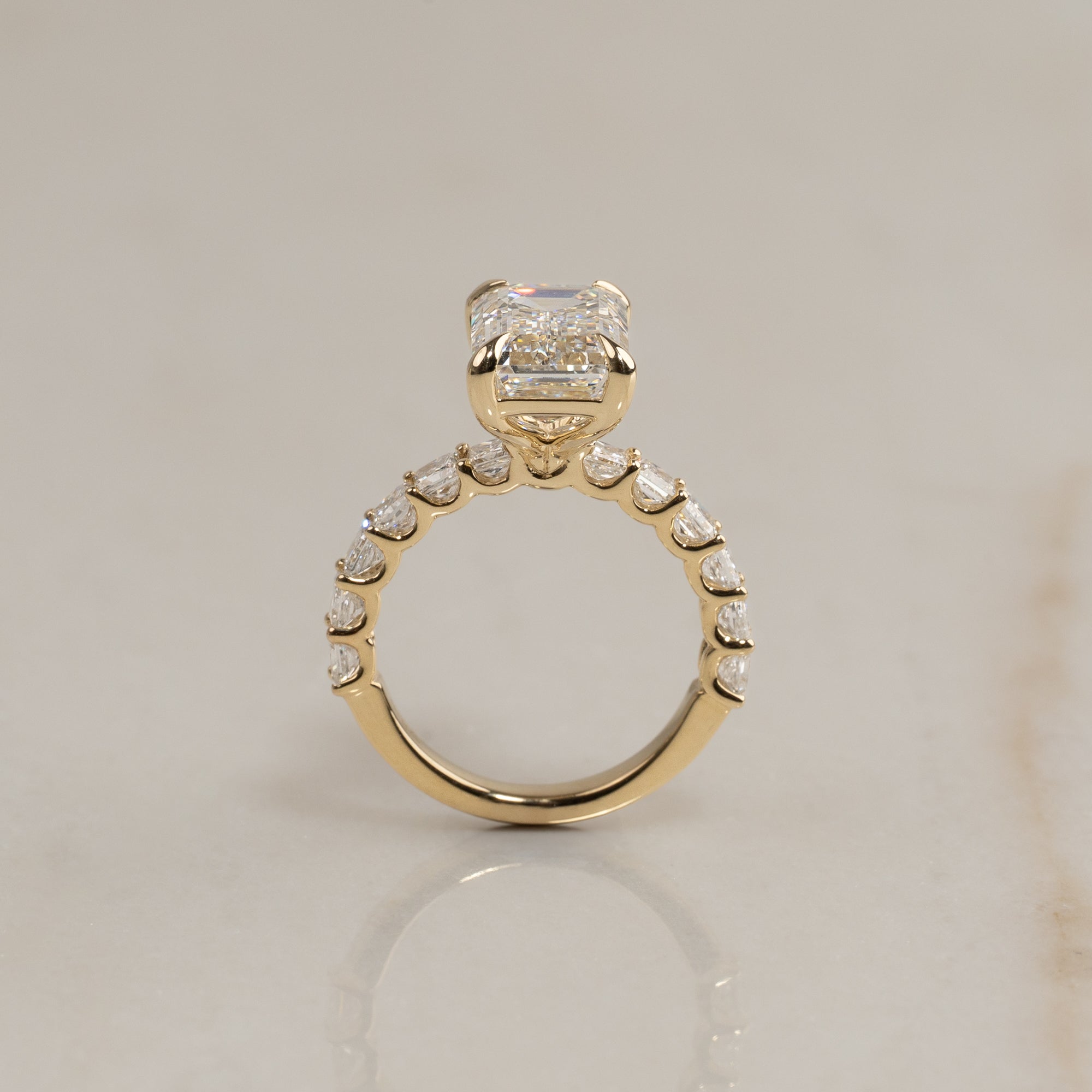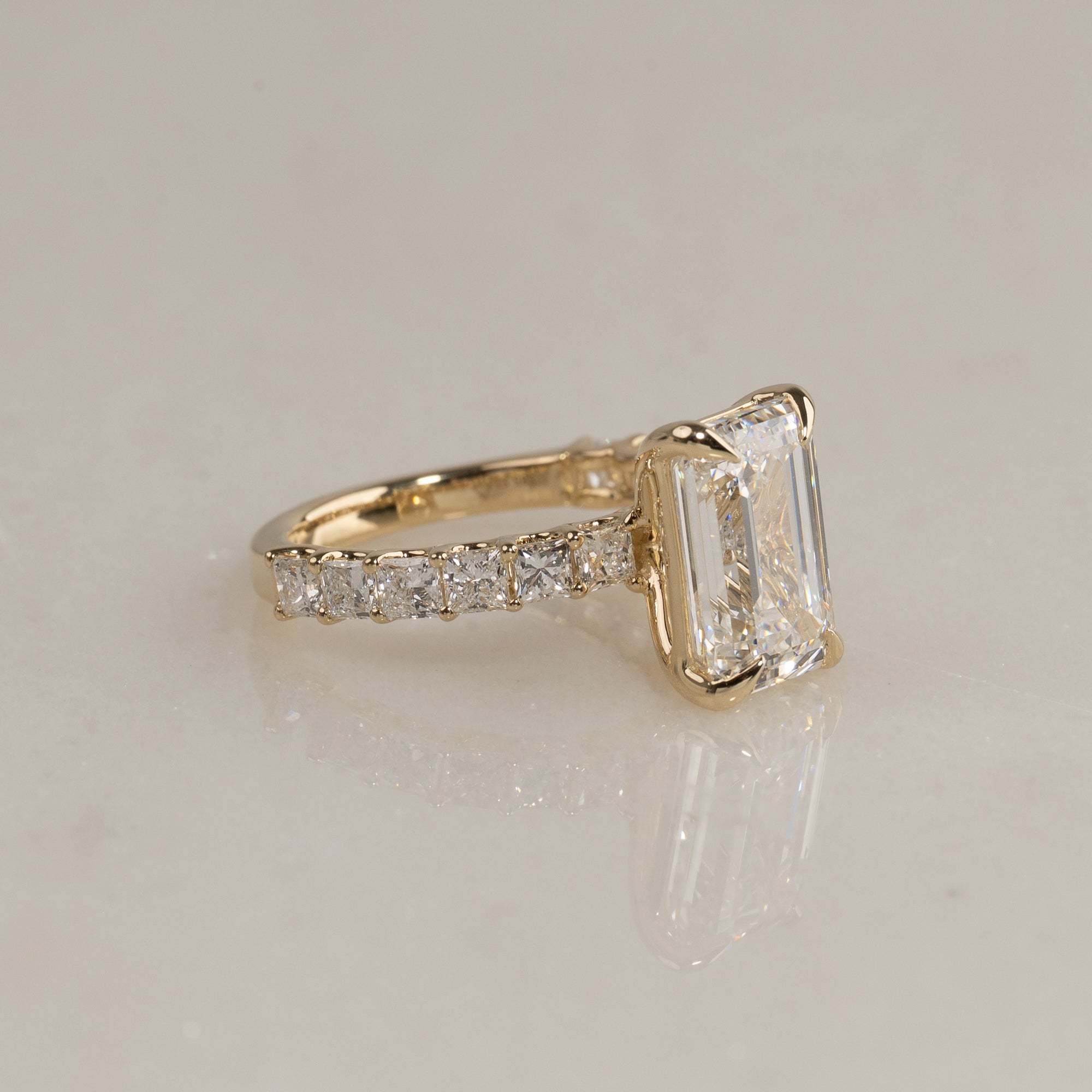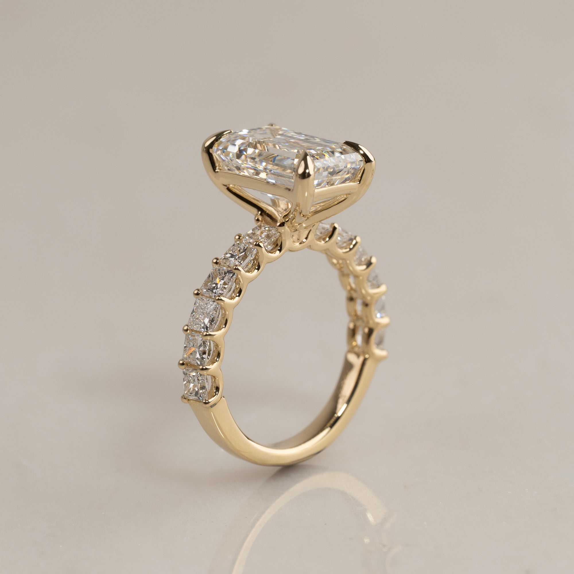 Ringen er fremstillet i 14 karat massivt guld og emmer af eksklusivitet. I centrum sidder en imponerende 5,0 ct. emerald-cut lab-grown diamant – en sofistikeret slibning med trappefacettering, der skaber en klar, spejlende glans.