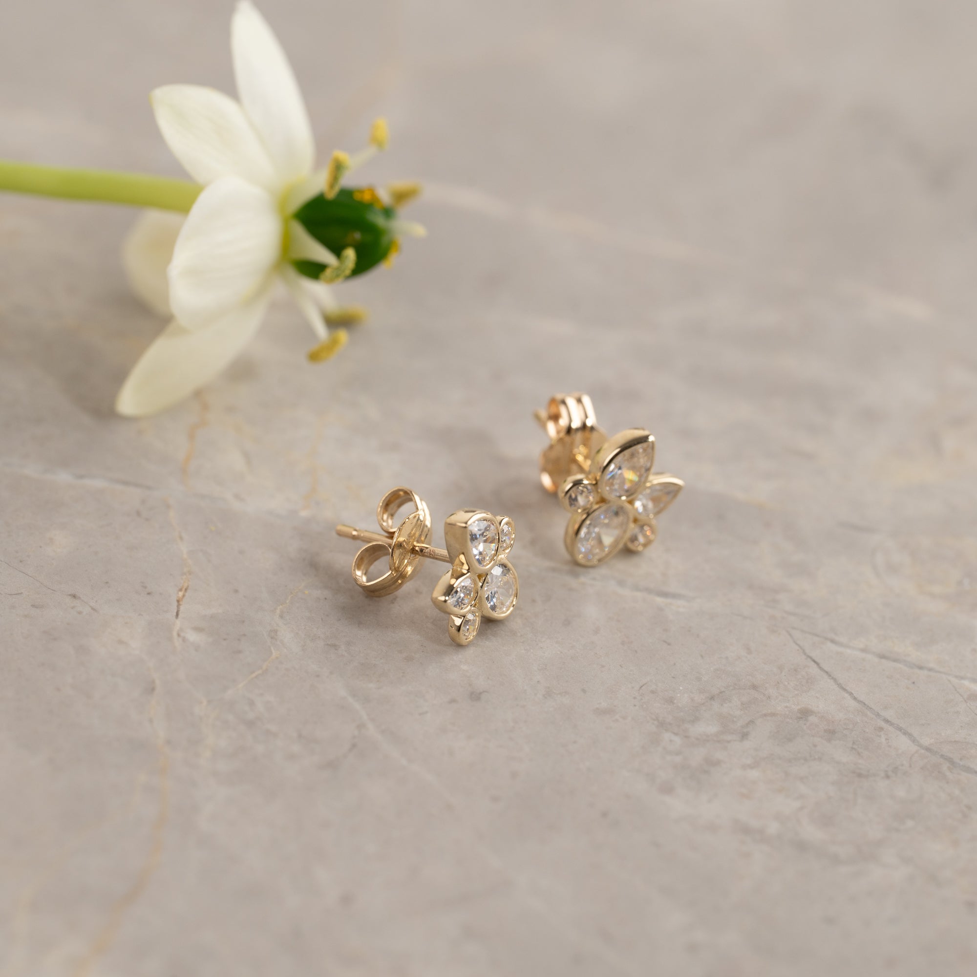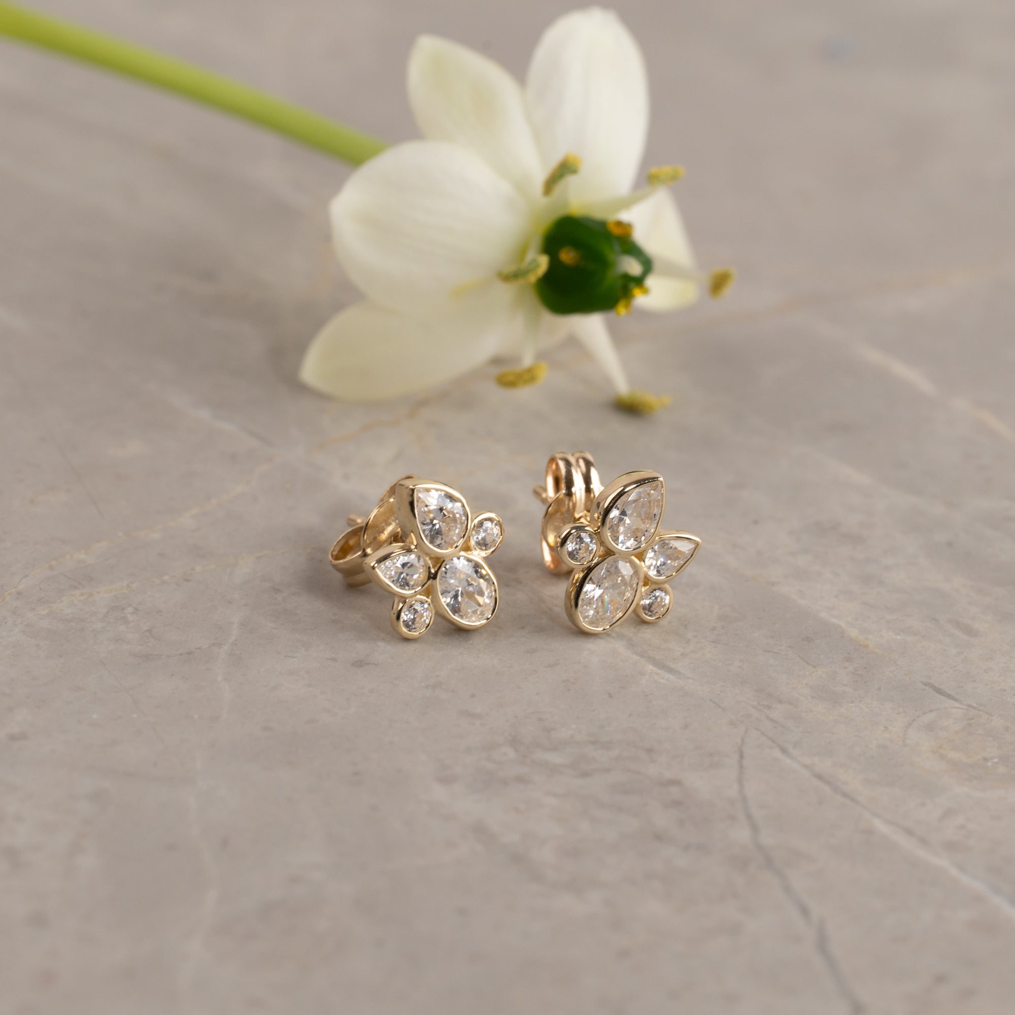 Disse feminine ørestikker er designet med en blomstret-inspireret silhuet af klare zirkoner, der danner et elegant og funklende udtryk. Kombinationen af dråbe- og runde sten giver dem et let og organisk præg, som gør dem både romantiske og tidløse.
