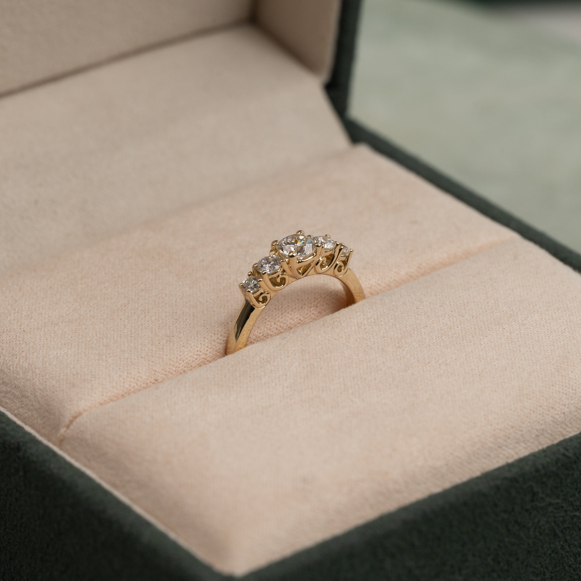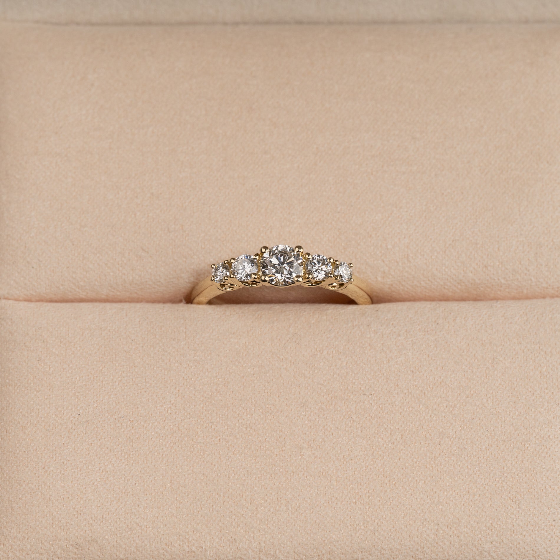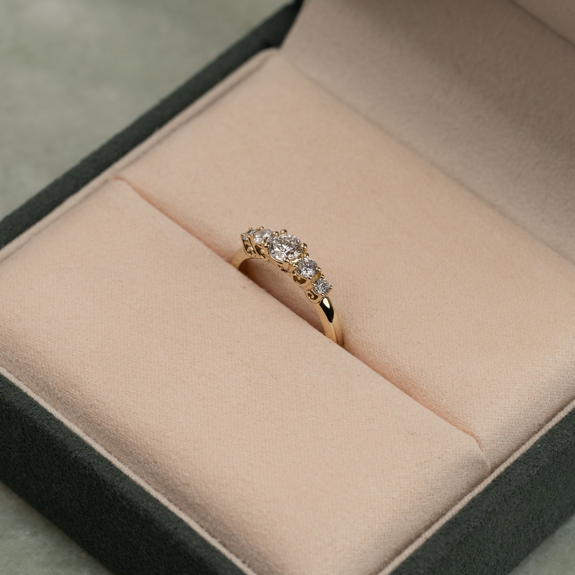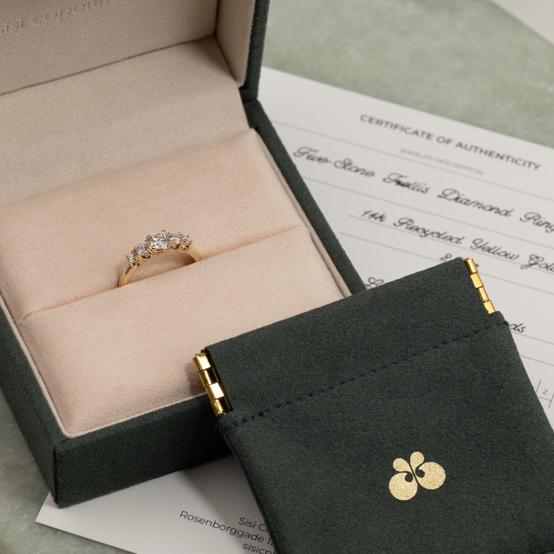 Ringen er i 14 karat massiv guld med fem lab-grown diamanter på samlet 0,7 ct. Diamanterne har farven E/F (River) og klarheden VVS. Smykket er skabt med omtanke; diamanterne er fremstillet med blandt andet solenergi, og guldet er 100% certificeret genanvendt.