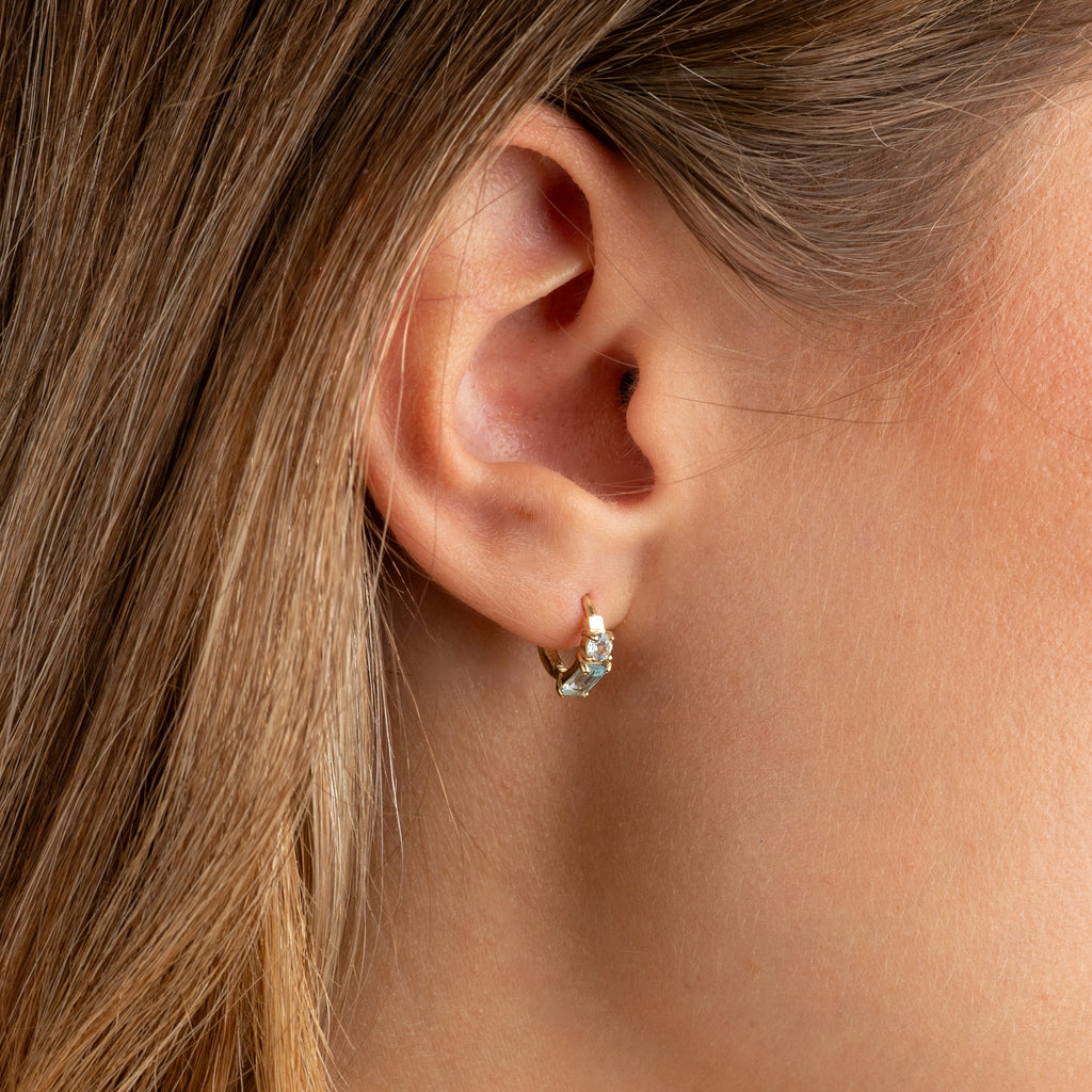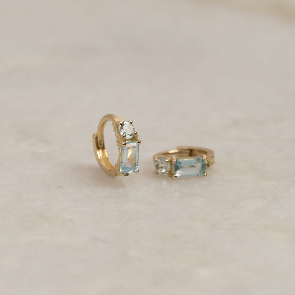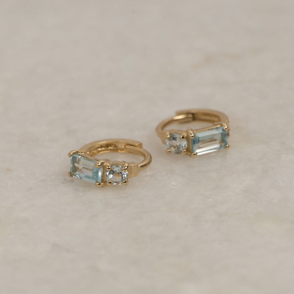 Vores Gemina øreringe er skabt i 100% recycled 9 karat massiv guld med en baguette-sleben london blå topaz og rund himmelblå topaz på hver ørering. Øreringe er lavet som hængslede huggies med klik-lås. De har en diameter på 12mm.