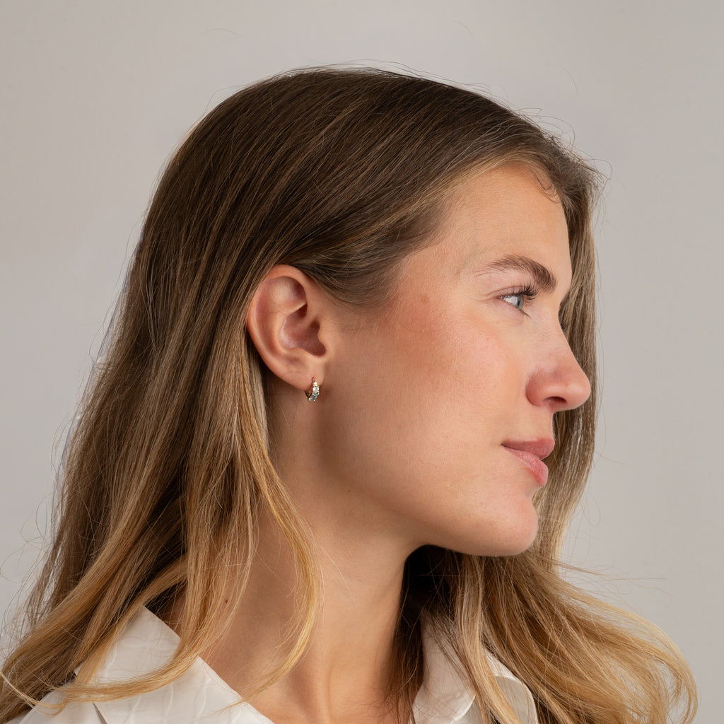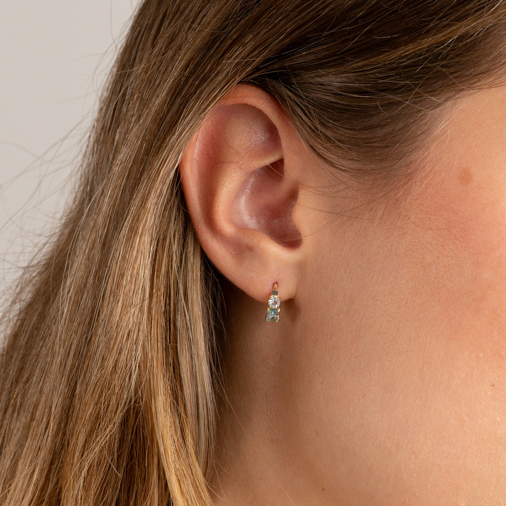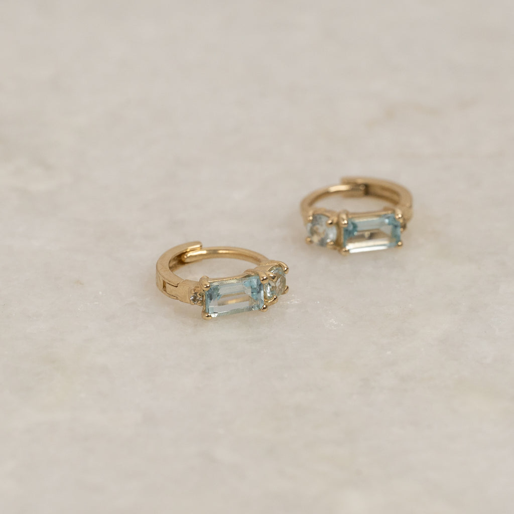 Vores Gemina øreringe er skabt i 100% recycled 9 karat massiv guld med en baguette-sleben london blå topaz og rund himmelblå topaz på hver ørering. Øreringe er lavet som hængslede huggies med klik-lås. De har en diameter på 12mm.