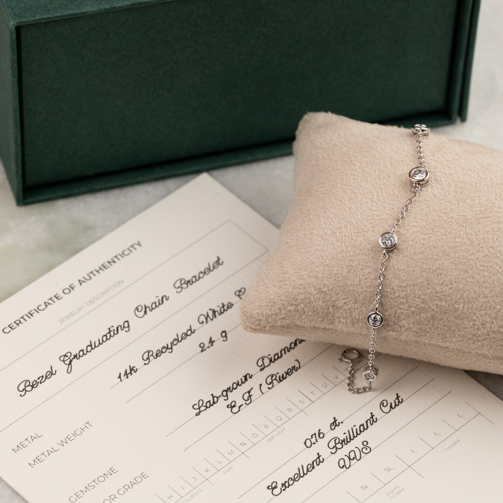 Armbåndet er lavet i 14 karat massivt hvidguld med lab-grown diamanter, der har en samlet vægt på 0,75 ct. Diamanterne har farven E/F (River) og klarheden VVS. Smykket er skabt med omtanke; diamanterne er fremstillet med blandt andet solenergi, og guldet er 100% certificeret genanvendt.