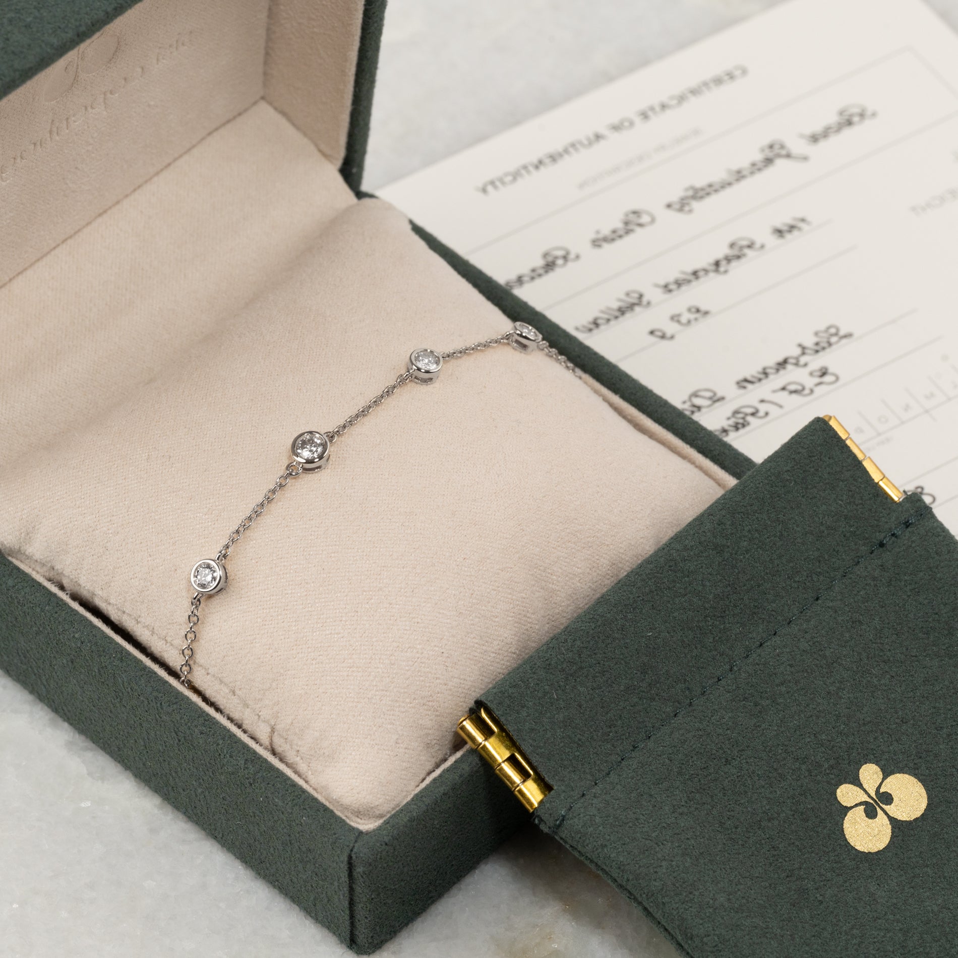 I boksen finder du en smykkeæske, pouch og 'certificate of authenticity'