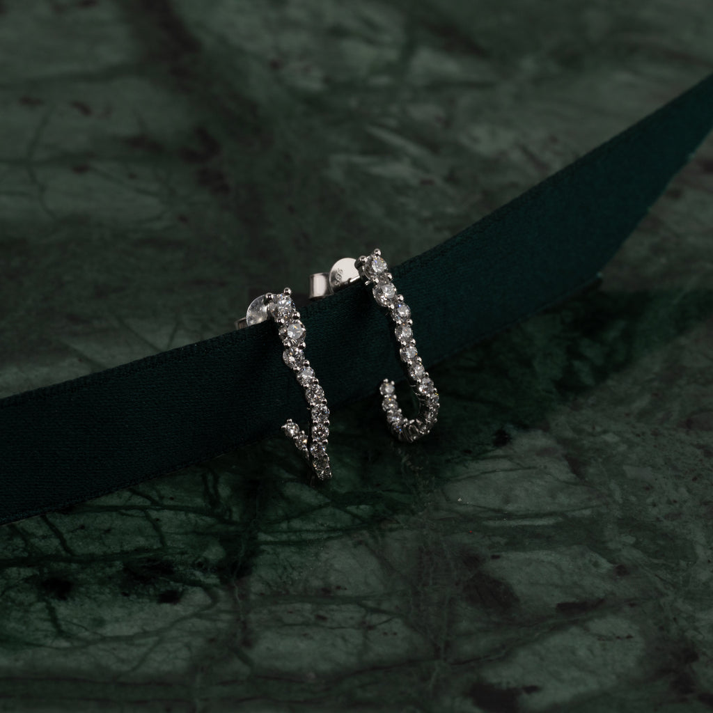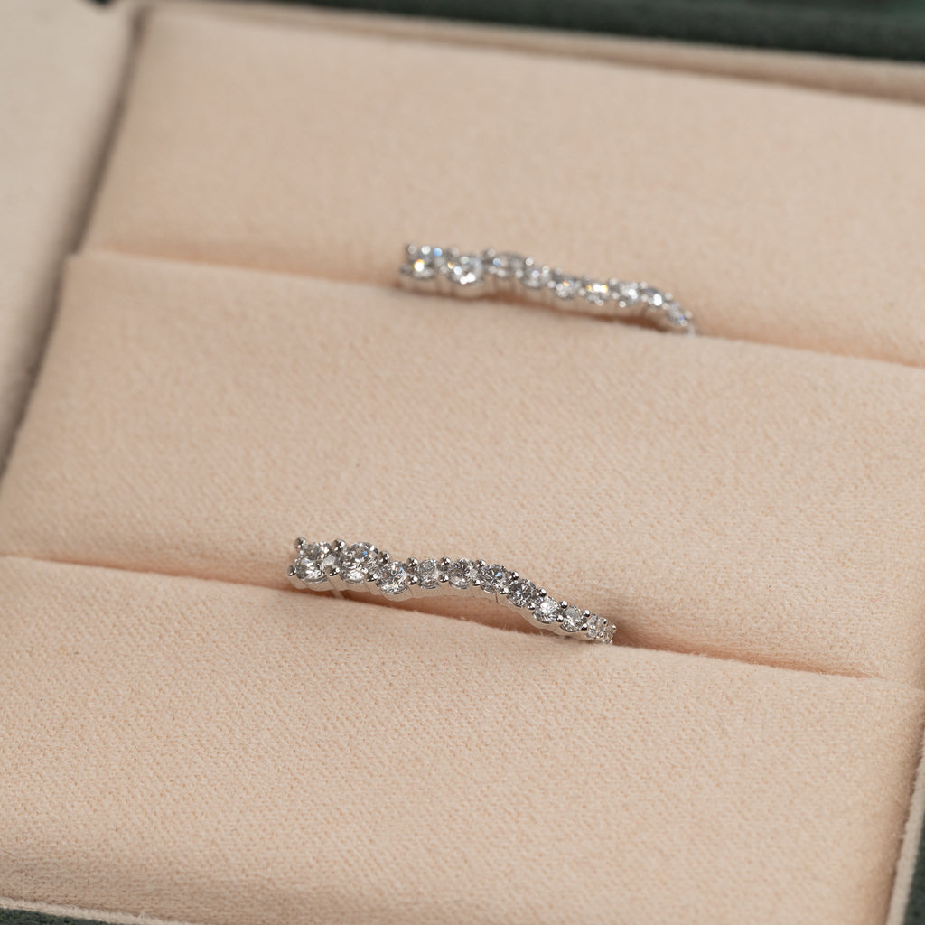 Øreringene er fremstillet i 14 karat massivt hvidguld med lab-grown diamanter, der har en samlet caratvægt på 0,9 ct. De 30 diamanter har forskellige størrelser, som smukt følger creolens organiske og kurvede form.