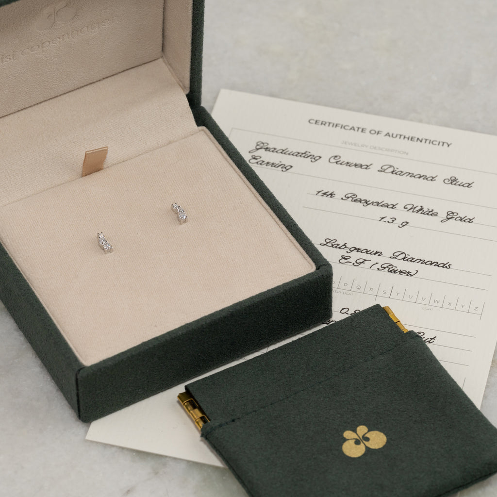 Vi gør brug af lab-grown diamanter der er dyrket i kontrolleret laboratoriemiljø ved hjælp af avancerede teknologier og vedvarende energi. Lab-grown diamanter har samme fysiske, kemiske og optiske egenskaber som minede diamanter, hvilket betyder, at de er ægte diamanter på alle måder. Du kan læse mere om lab-grown diamanter her.