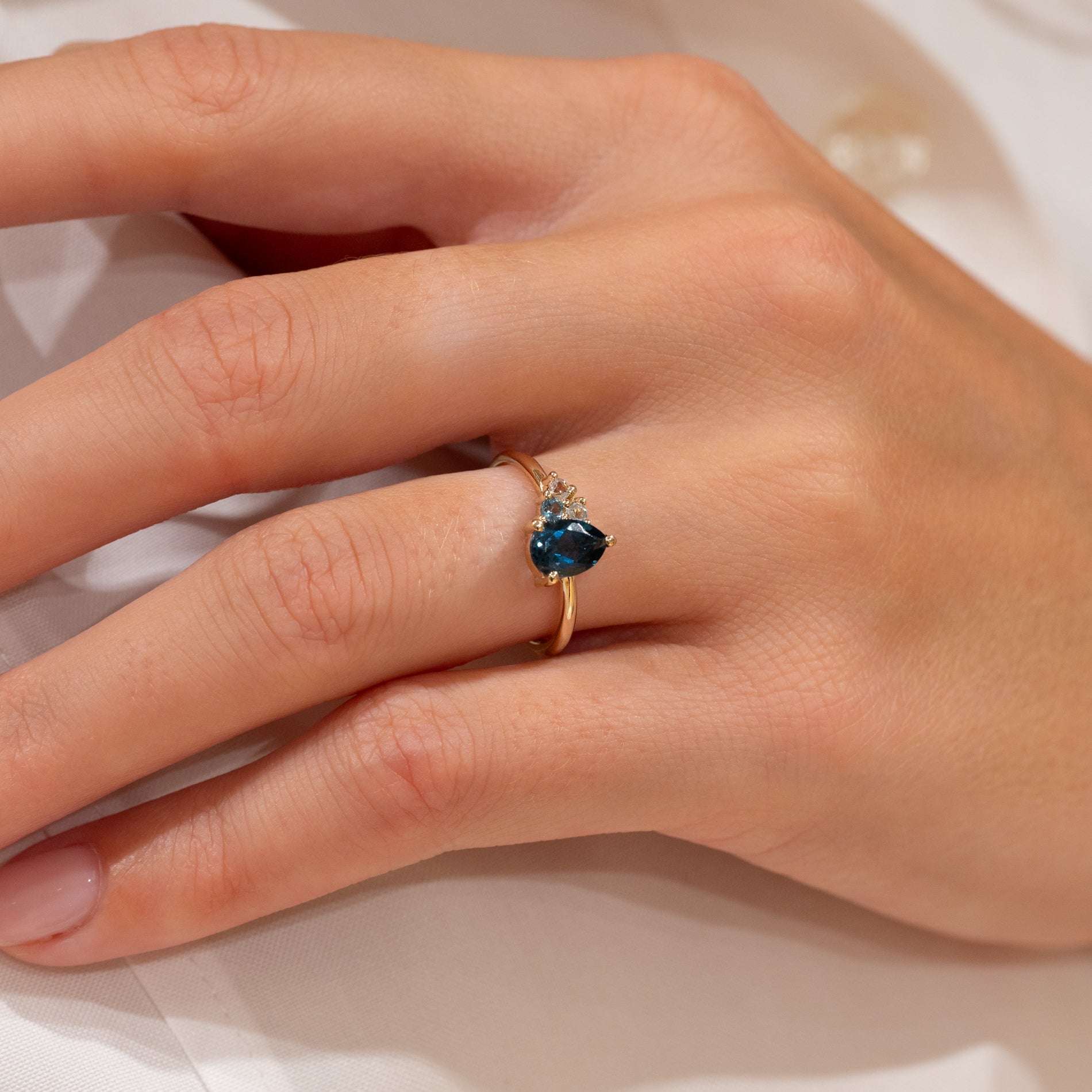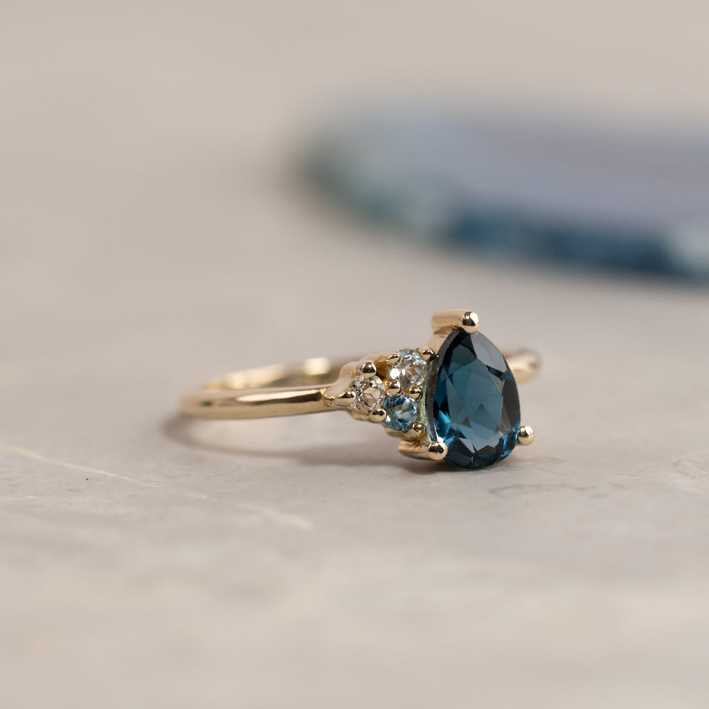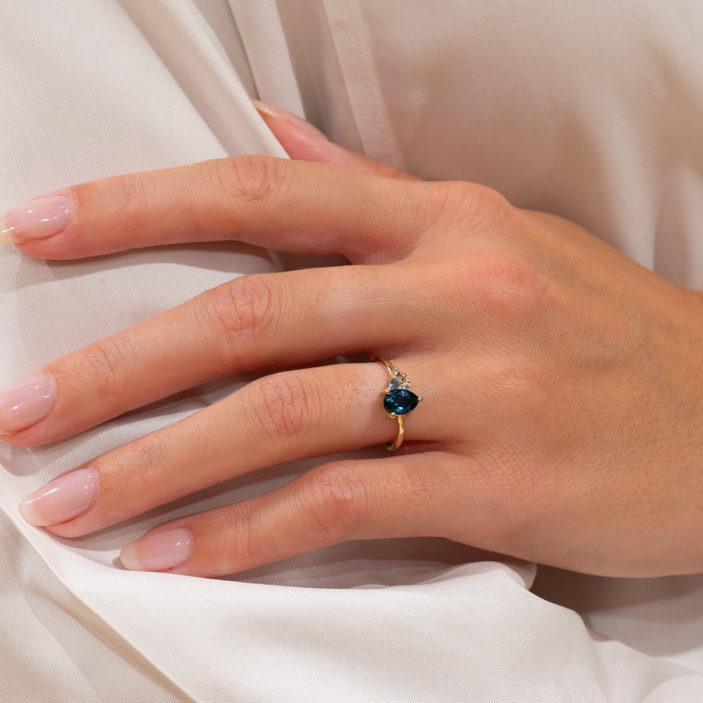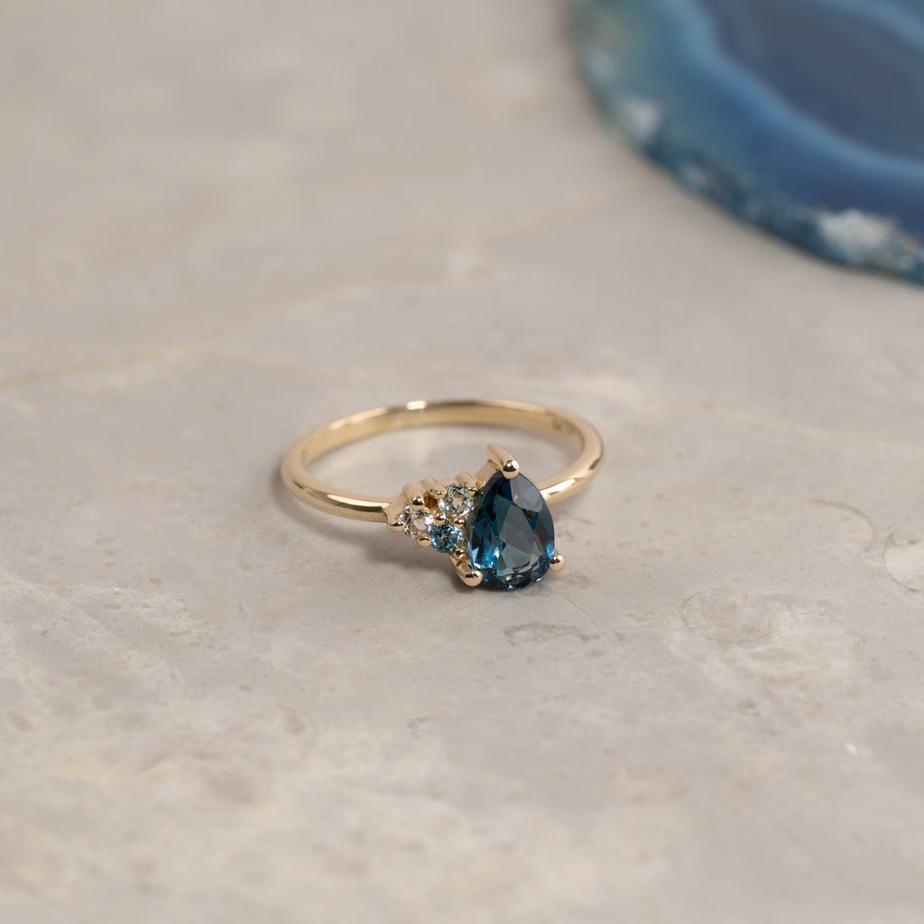 Den mørkeblå topas er dråbeformet og sidder tæt sammen med de tre andre sten, som giver ringen et utroligt smukt og unikt udseende. Den fine fingerring går godt til både hverdag og fest, og som kan bæres alene eller sammen med flere ringe.
