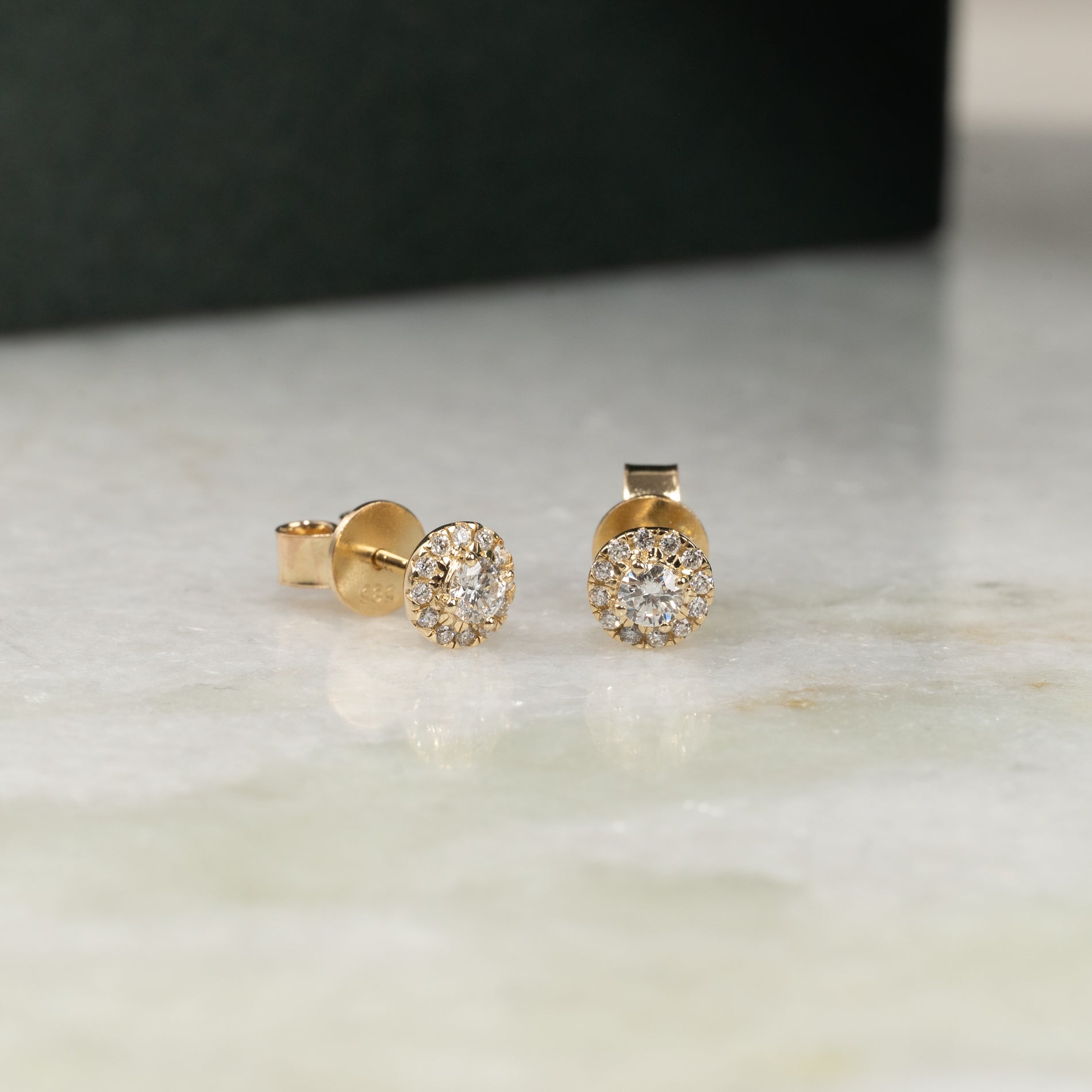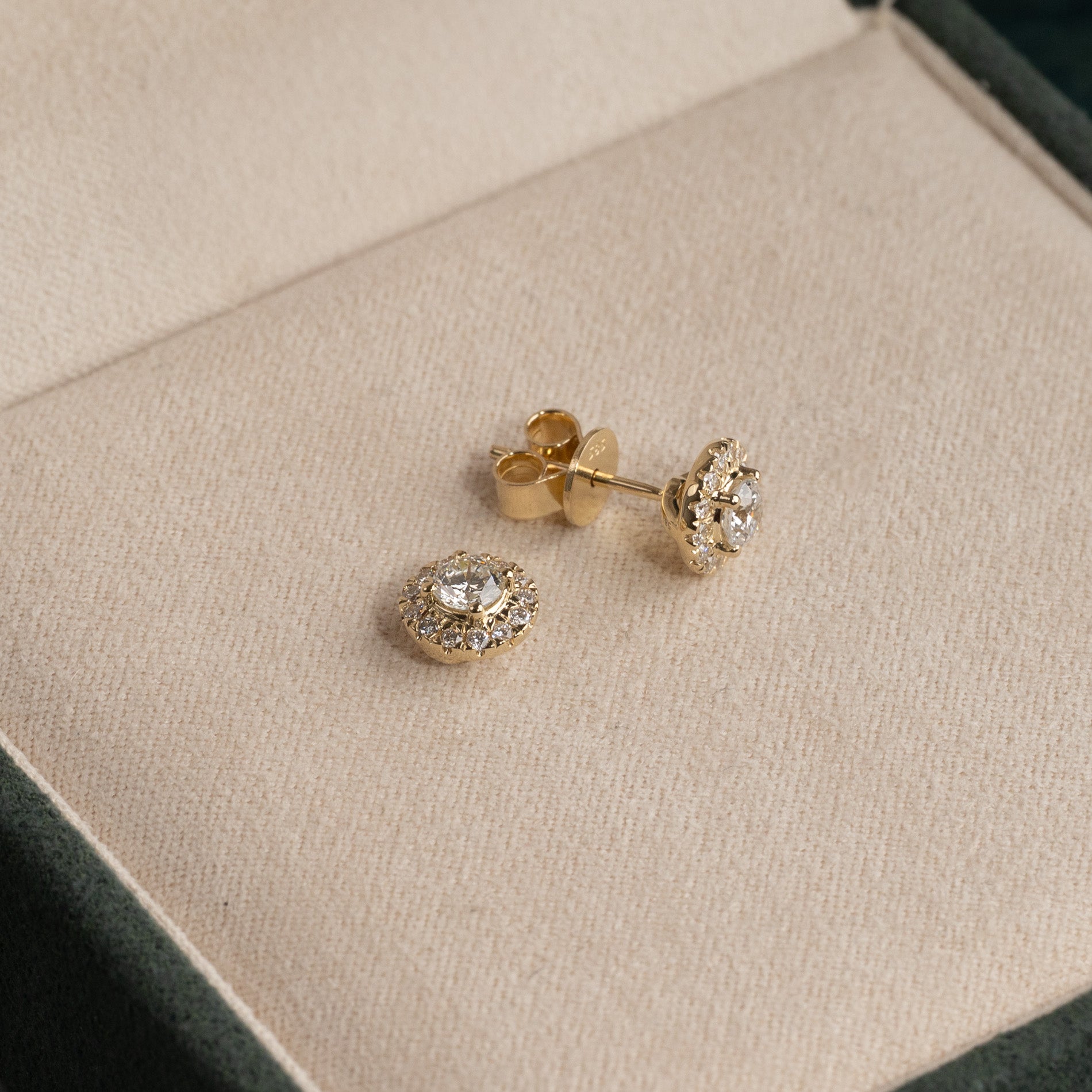 Diamantørestikkere med en brillantslebet lab-grown diamant i centrum omkranset af små brillanter i en halo. Halo-designet giver et elegant og feminint smykke, hvor ørestikkerne får en flot samlet diameter, mens de samtidig sidder tæt til øret.