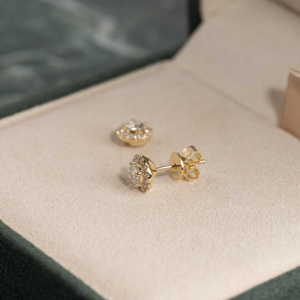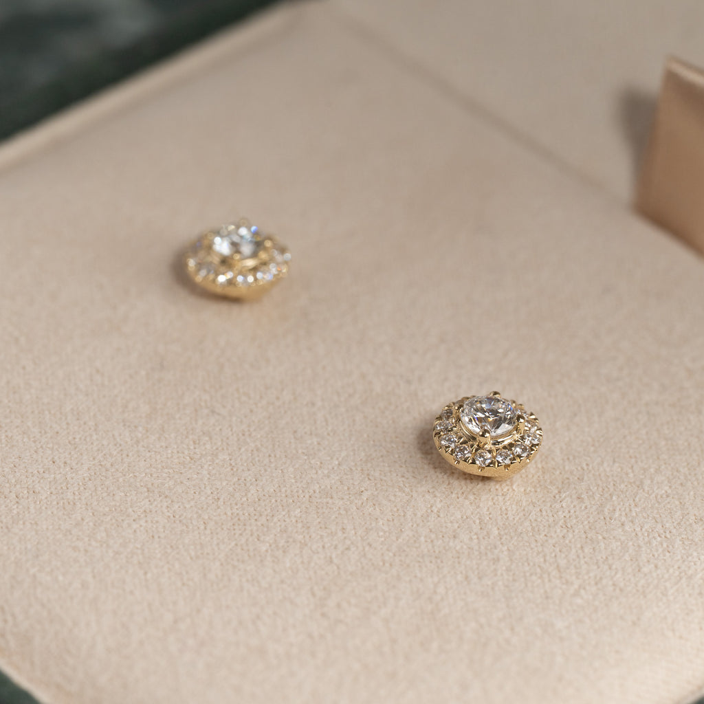 Diamantørestikkere i 14 karat guld med hver en brillantslebet lab-grown diamant i centrum, omkranset af en roset af 12 små brillanter. Halo-designet giver et elegant og feminint smykke, hvor ørestikkerne får en flot samlet diameter, mens smykket samtidig sidder tæt til øret.