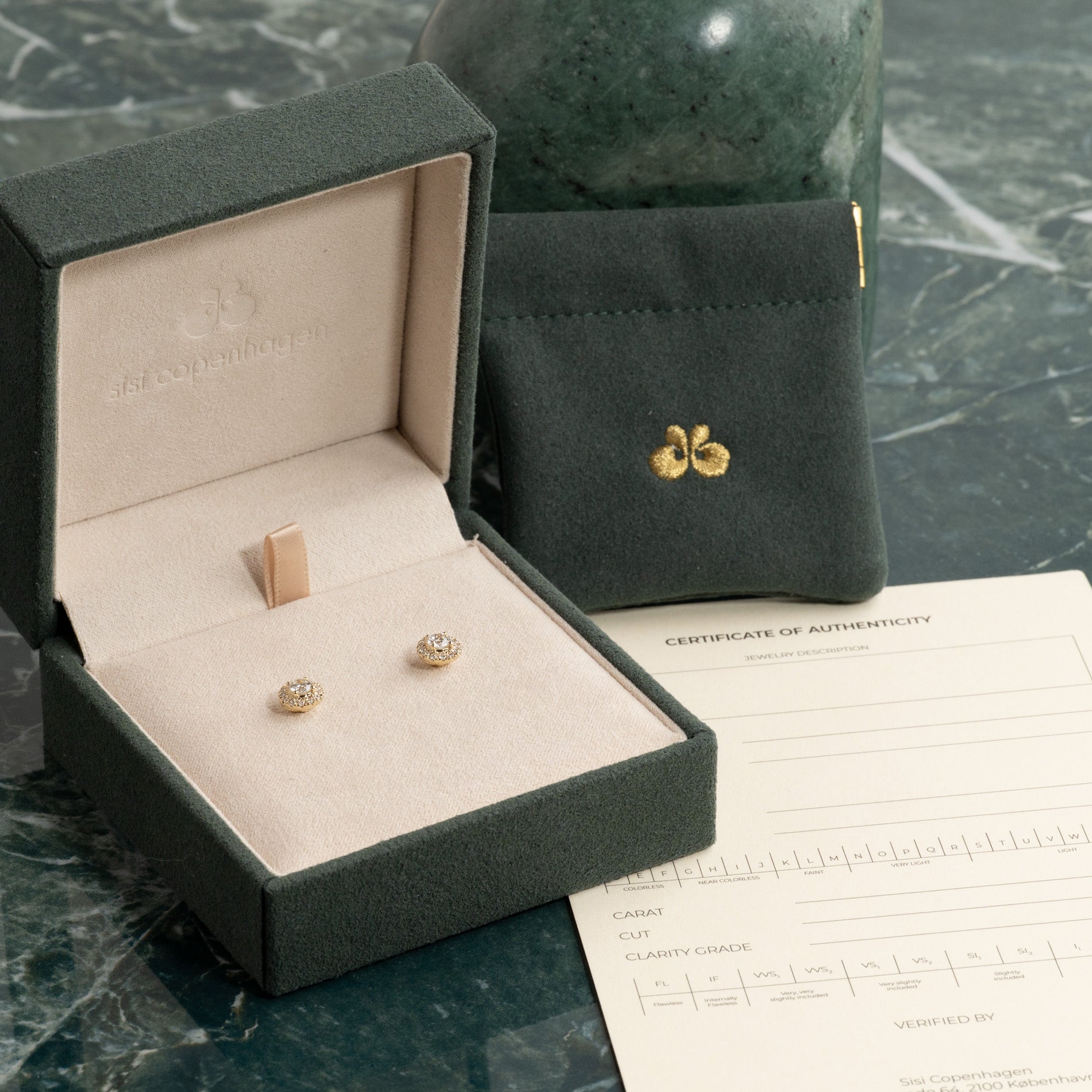 Fremstillet i 14 karat massiv guld med lab-grown diamanter med en samlet vægt på 0,65 ct. Hver af center-stenene har en størrelse på 0,22 ct., omkranset af 0,08 ct. små diamanter - i alt 26 diamanter for sættet. Diamanterne har farven E-F (River) og klarheden VVS. Smykket er skabt med omtanke; diamanterne er fremstillet med blandt andet solenergi, og guldet er 100% certificeret genanvendt.
