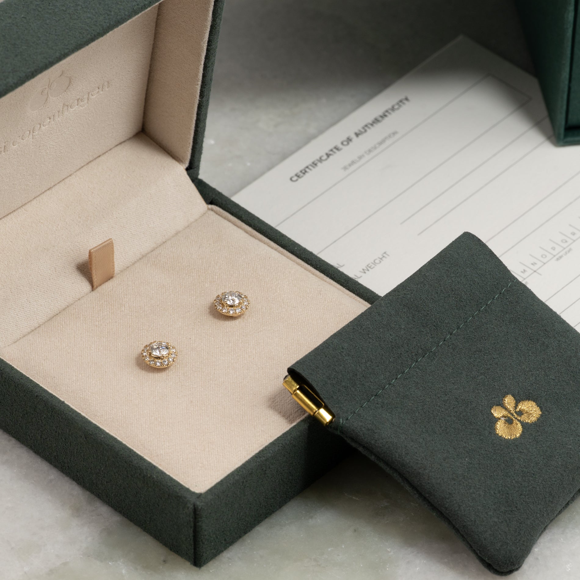 I boksen finder du en smykkeæske, pouch og 'certificate of authenticity'