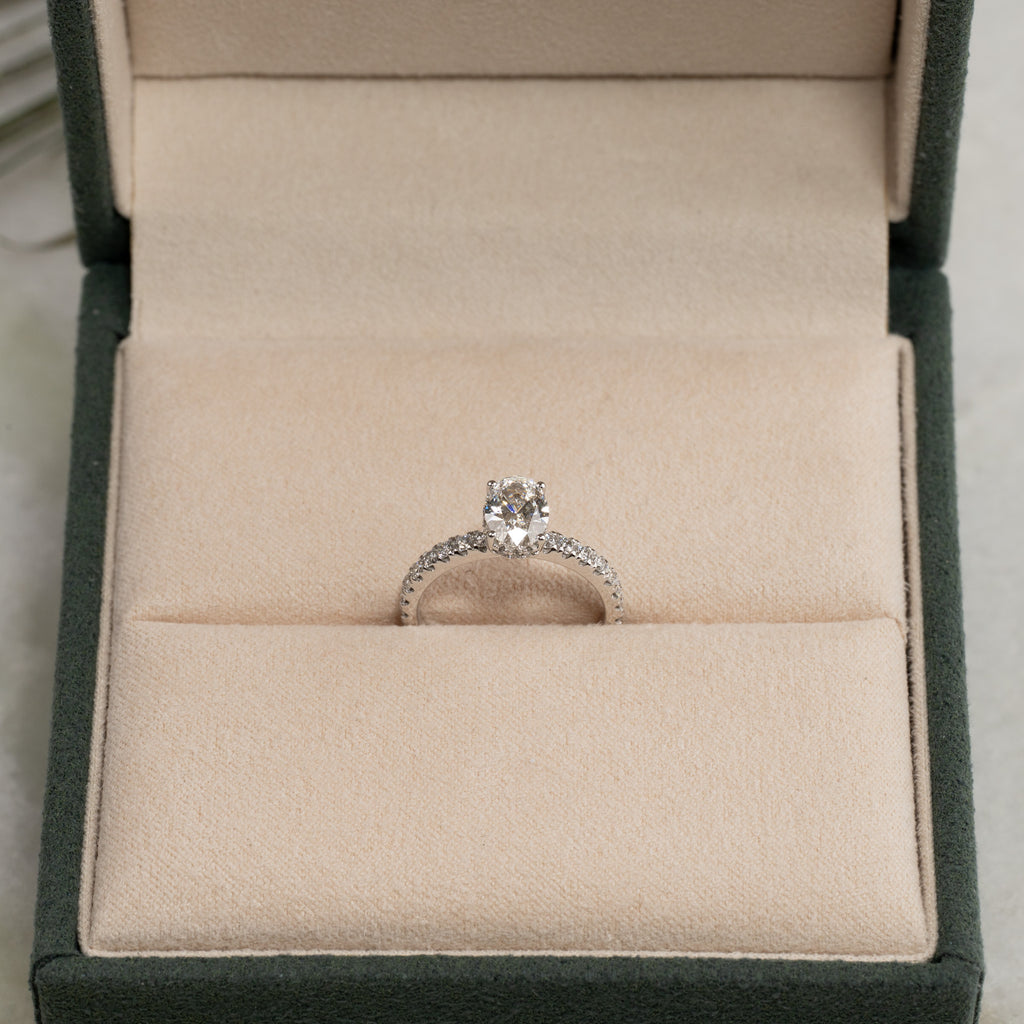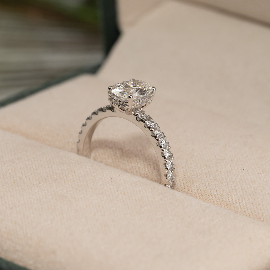 Smuk ring i 14 karat hvidguld med lab-grown diamanter. Ringen består af en 1,0 ct. oval-slebet diamant som centersten, der sidder elegant fattet med en hidden-halo – en krans af små diamanter, der sidder omkring centerstenen på selve fatningen. Ringen er desuden besat med diamanter på den øvre halvdel af ringskinnen, som fuldender designet og giver et harmonisk og strålende udtryk.