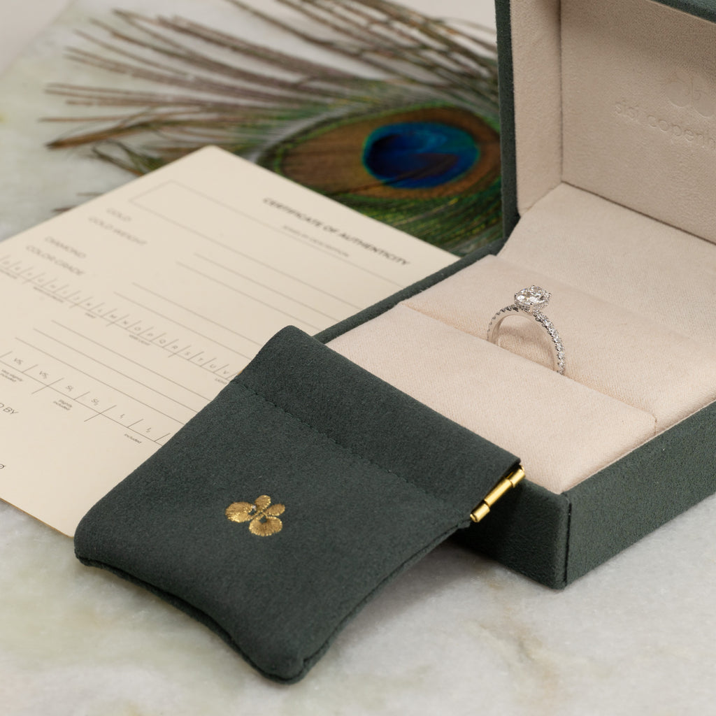 Den matchende pouch kan du bruge til at opbevare diamantsmykket sikkert når du er på farten.