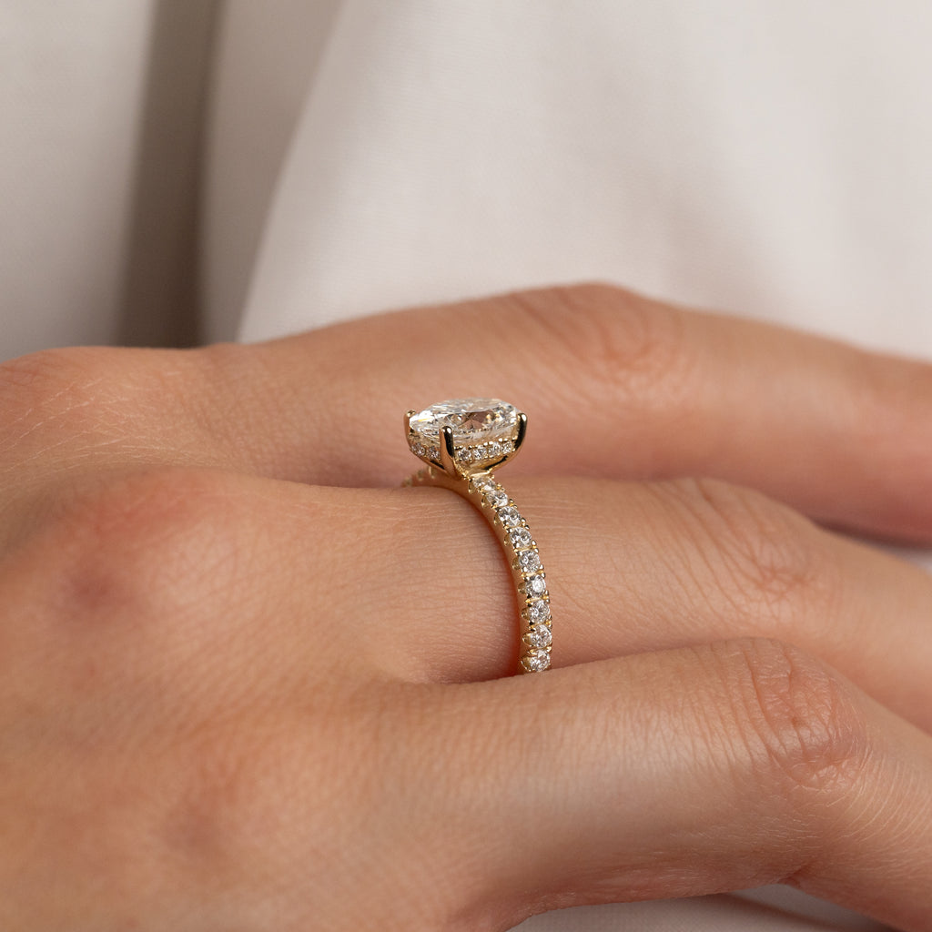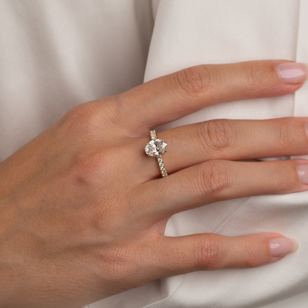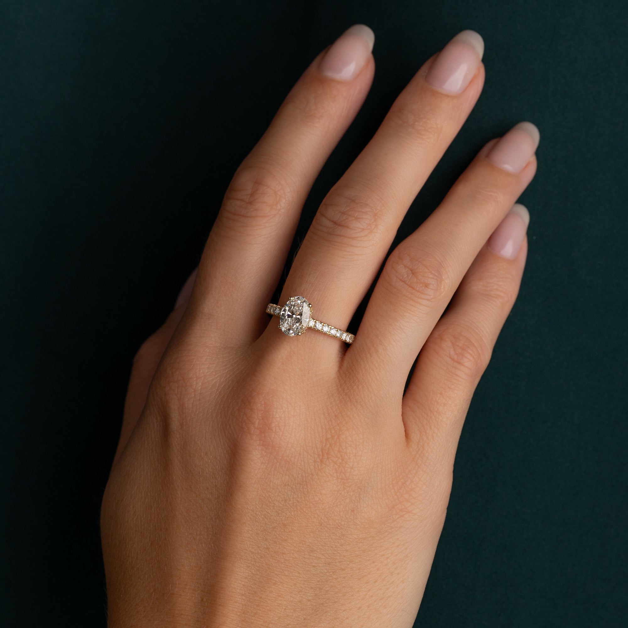 Smuk ring i 14 karat guld med lab-grown diamanter. Ringen har en 1,5 ct. oval-slebet diamant som centersten, elegant fattet med en hidden halo – en krans af små diamanter, der sidder omkring centerstenen på selve fatningen. Ringen er desuden besat med diamanter på den øvre halvdel af ringskinnen, som fuldender designet og giver et harmonisk og strålende udtryk.