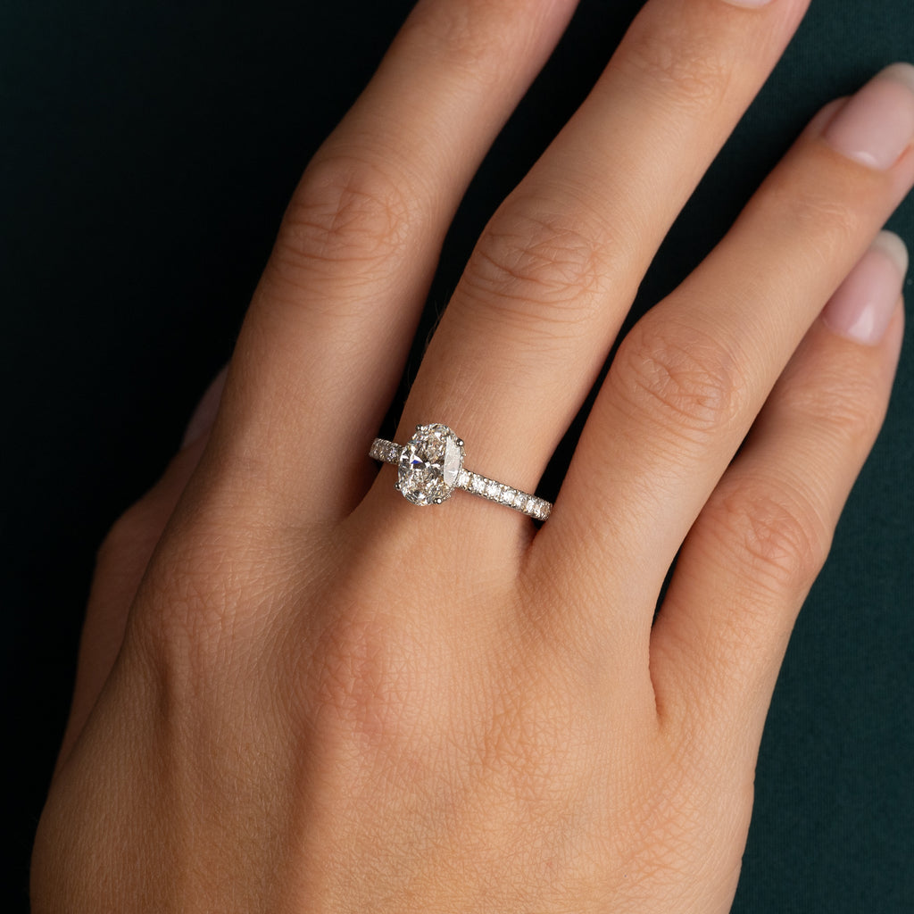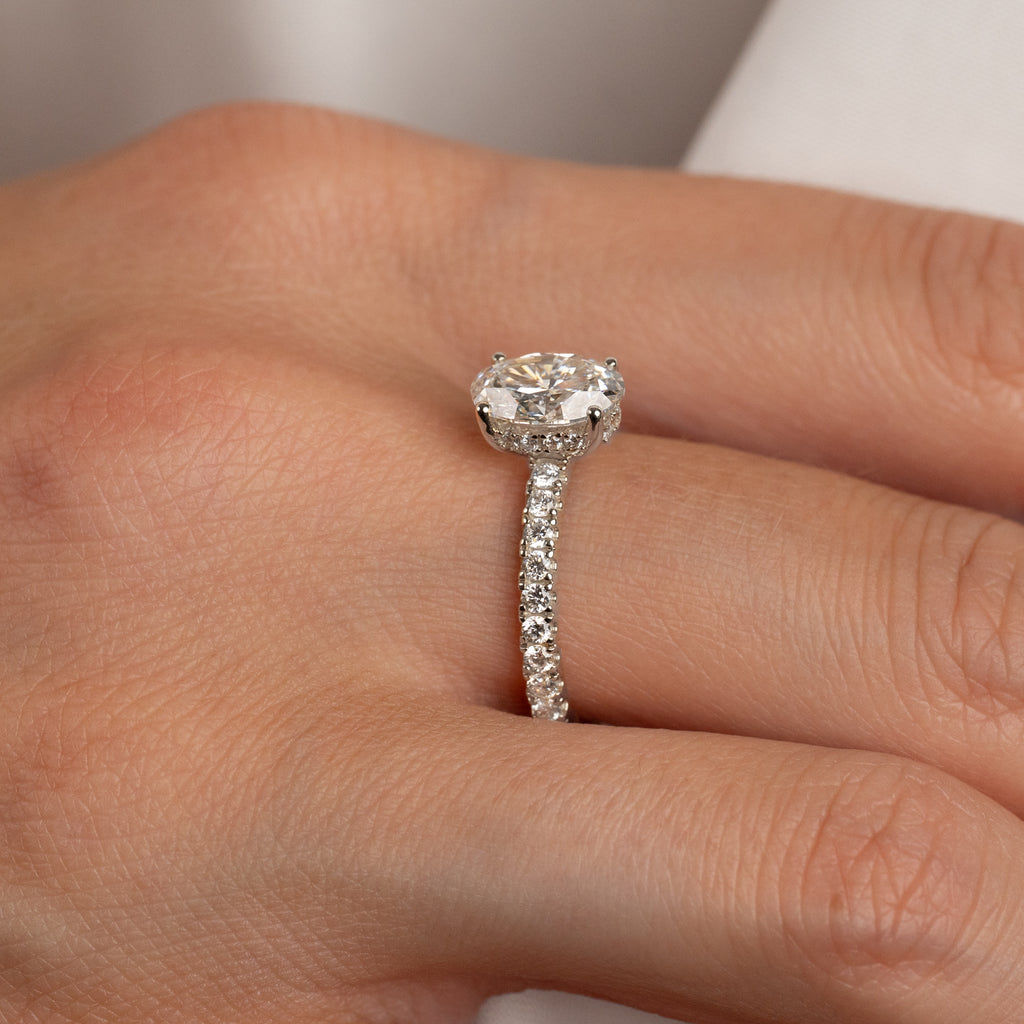 Smuk ring i 14 karat hvidguld med lab-grown diamanter. Ringen består af en 1,5 ct. oval-slebet diamant som centersten, der sidder elegant fattet med en hidden-halo – en krans af små diamanter, der sidder omkring centerstenen på selve fatningen. Ringen er desuden besat med diamanter på den øvre halvdel af ringskinnen, som fuldender designet og giver et harmonisk og strålende udtryk.